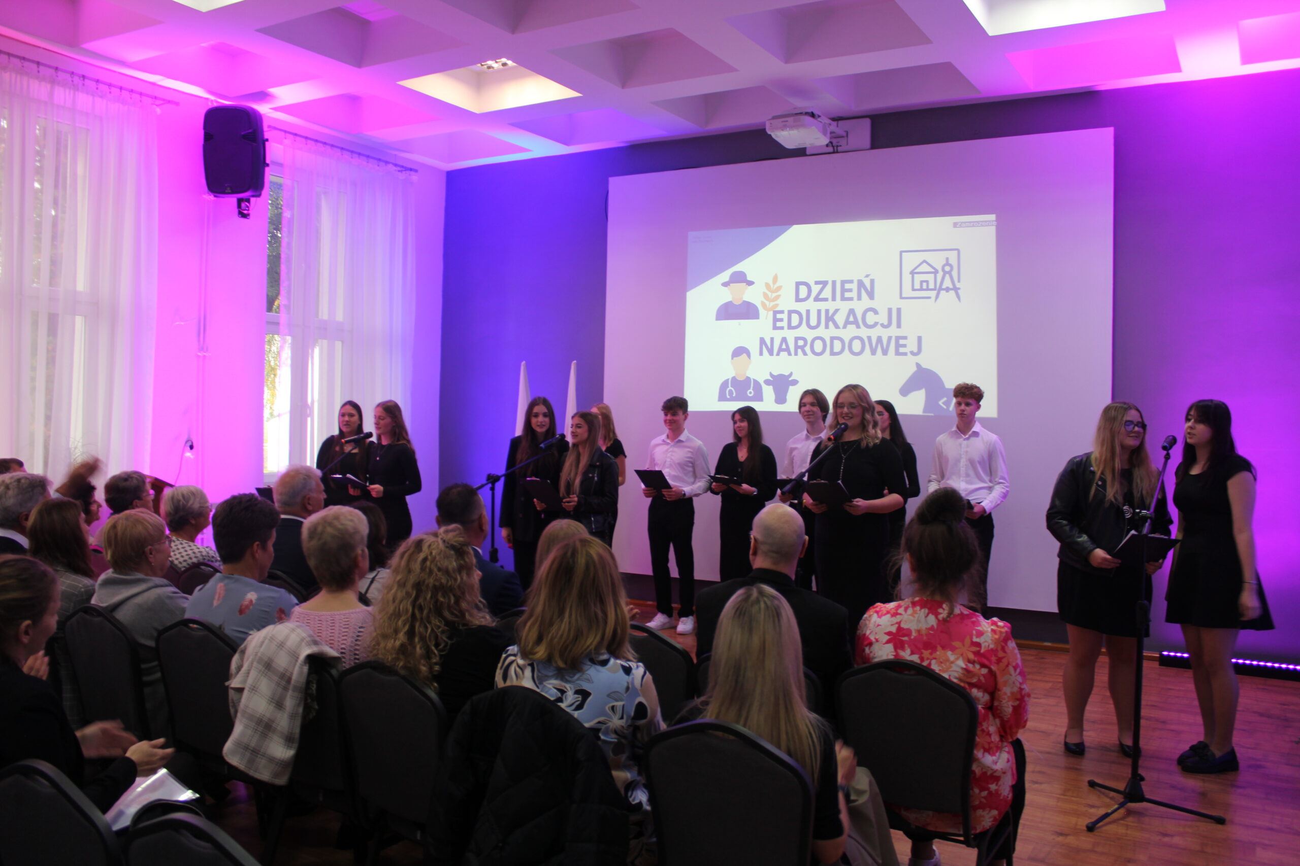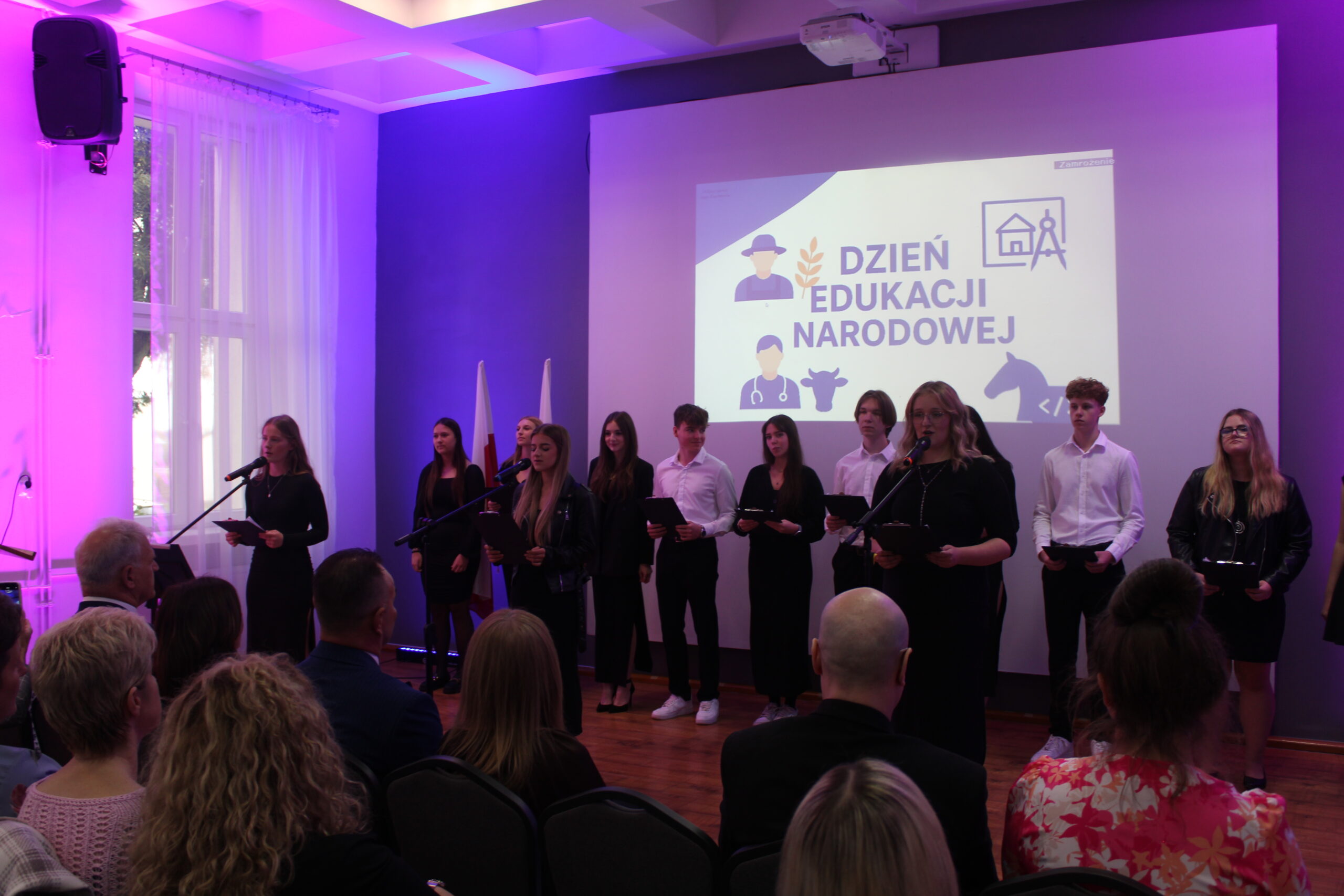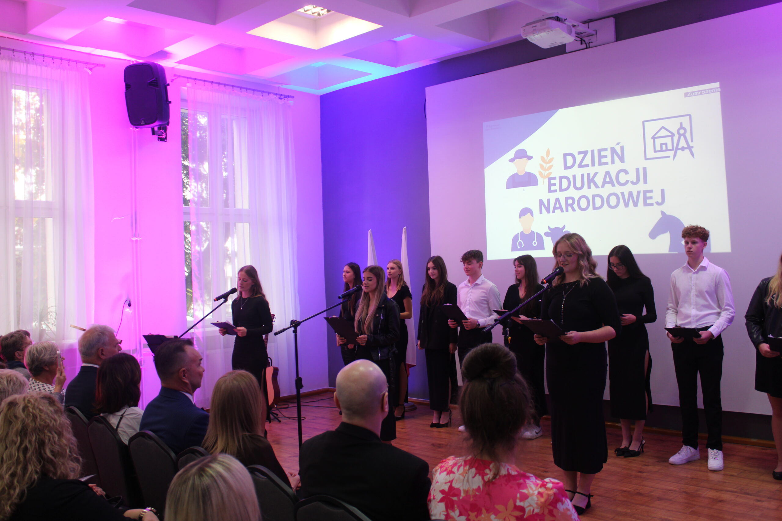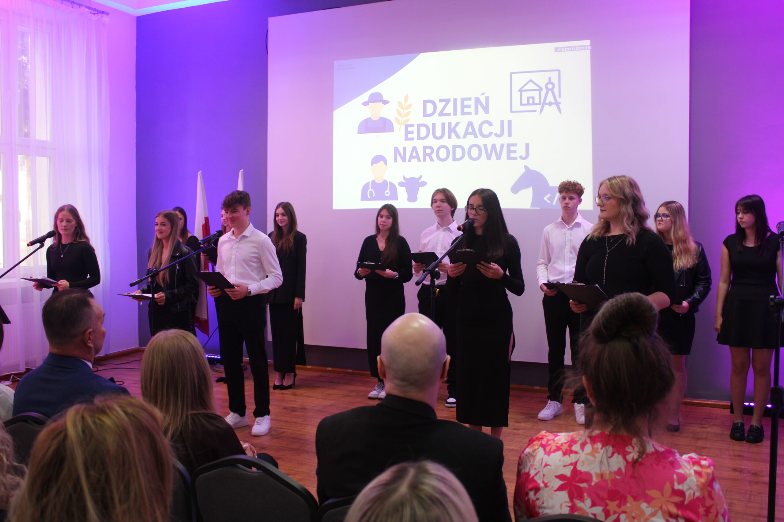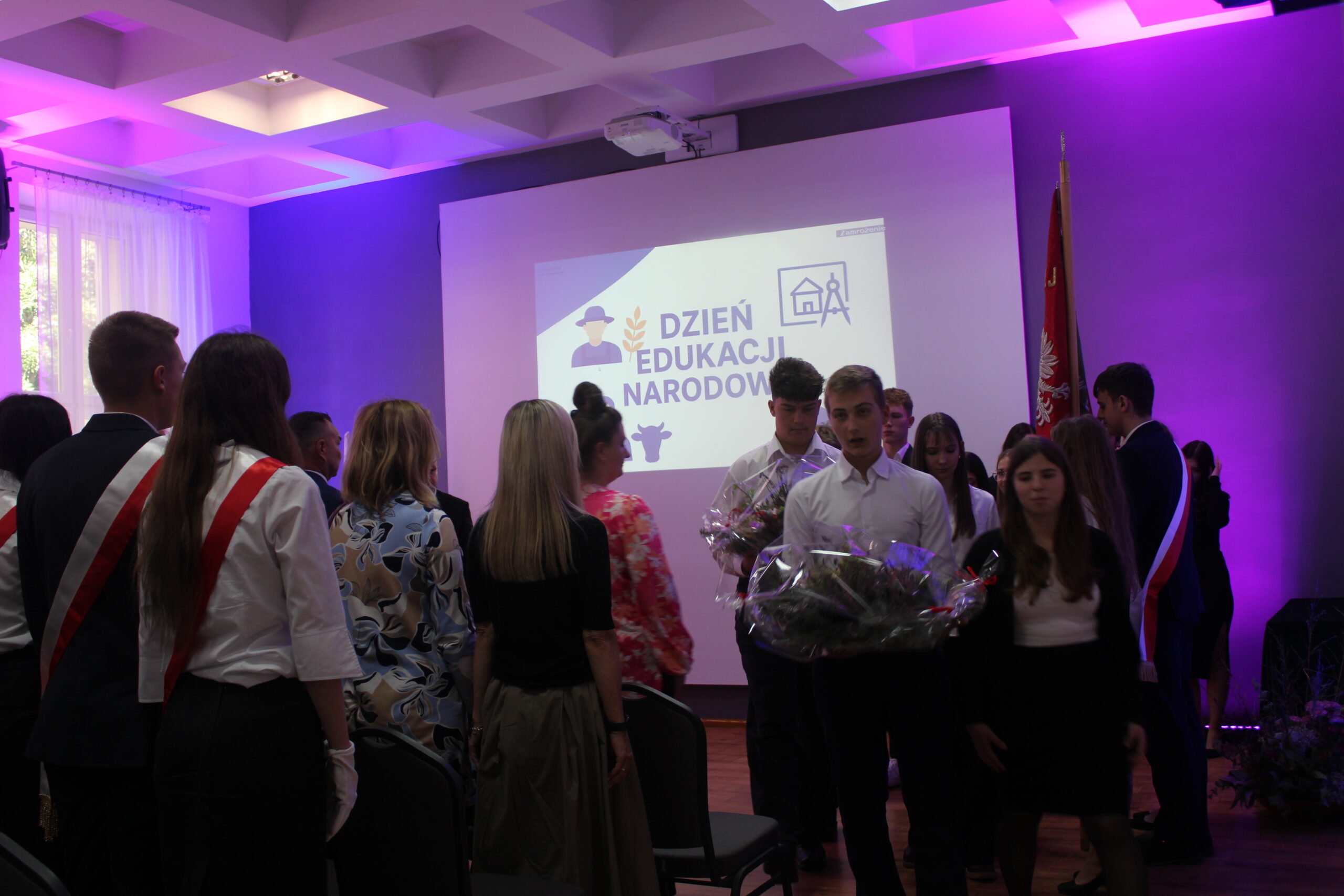 Uroczystość rozpoczęła się od wprowadzenia pocztu sztandarowego i odśpiewania hymnu państwowego. Następnie głos zabrał dyrektor szkoły, pan Stanisław Kosmowski, który powitał wszystkich zebranych gości, nauczycieli, uczniów oraz pracowników szkoły — zarówno tych obecnych, jak i emerytowanych. W swoim przemówieniu podkreślił, że Dzień Edukacji Narodowej to święto całej społeczności szkolnej – nie tylko nauczycieli, ale także wszystkich osób, które na co dzień dbają o prawidłowe funkcjonowanie placówki. Dyrektor wyraził wdzięczność za pracę, życzliwość i zaangażowanie wszystkich, którzy swoją postawą i oddaniem przyczyniają się do tworzenia przyjaznej, twórczej atmosfery w ZSCKR w Zduńskiej Dąbrowie.