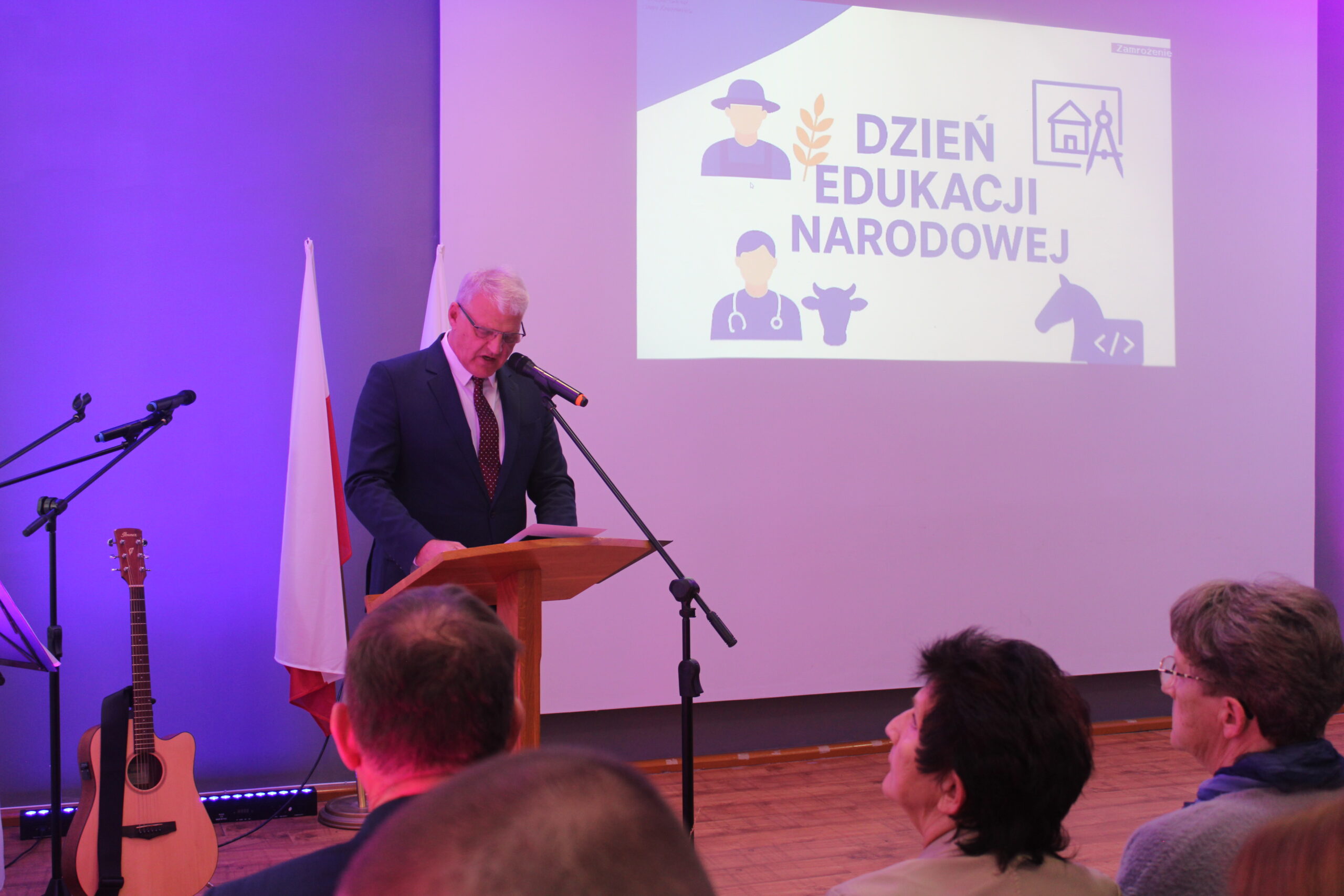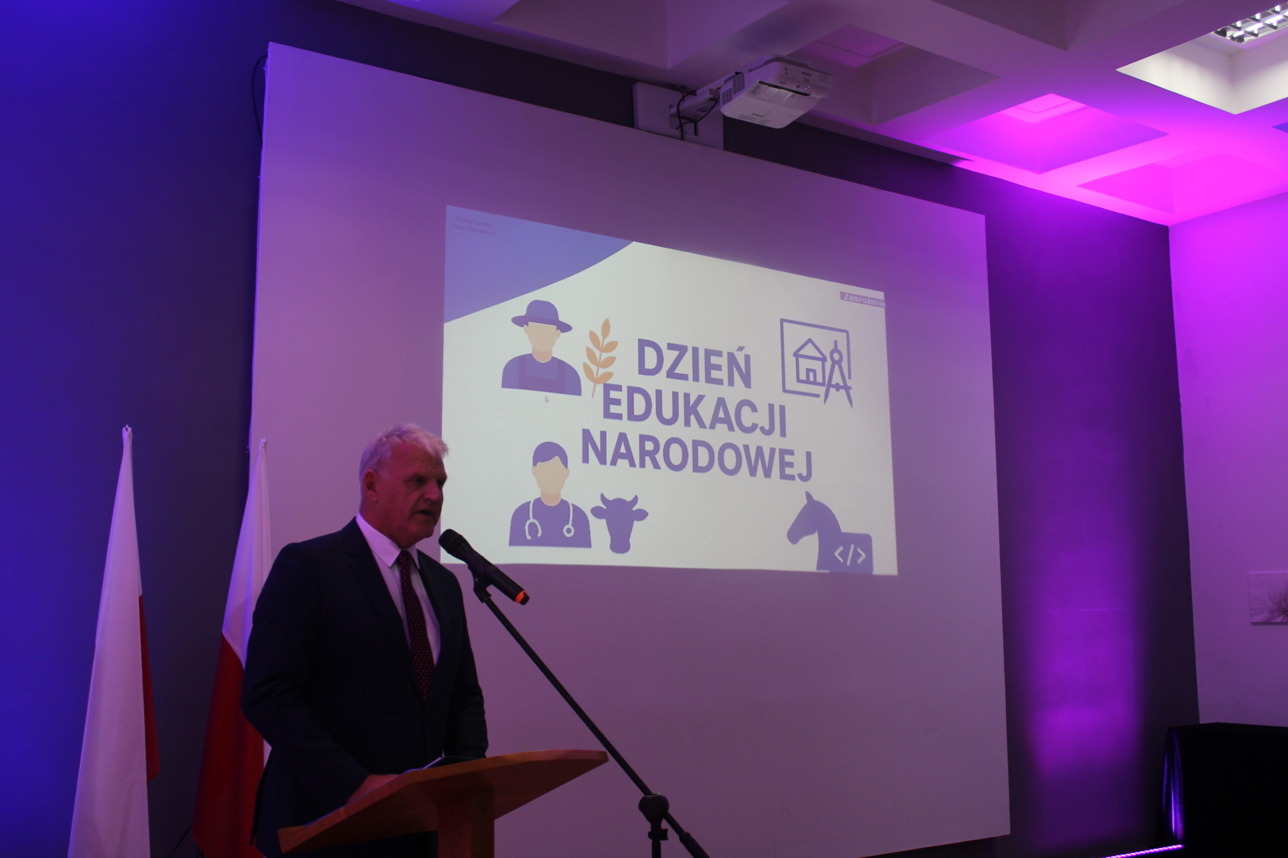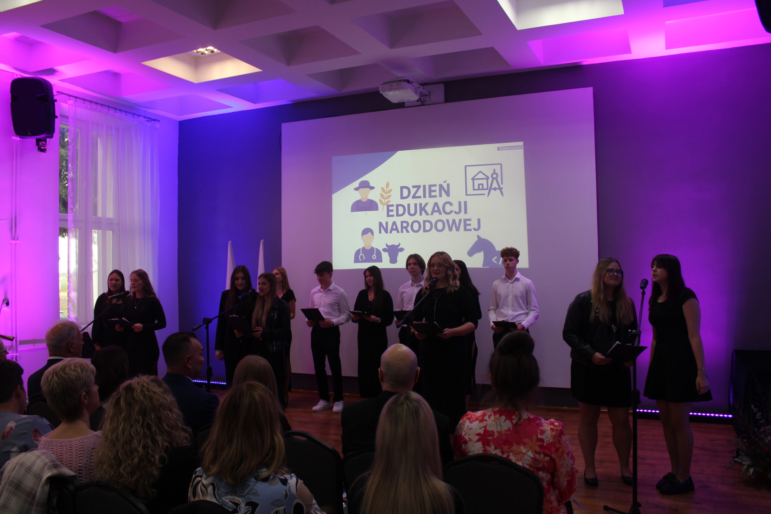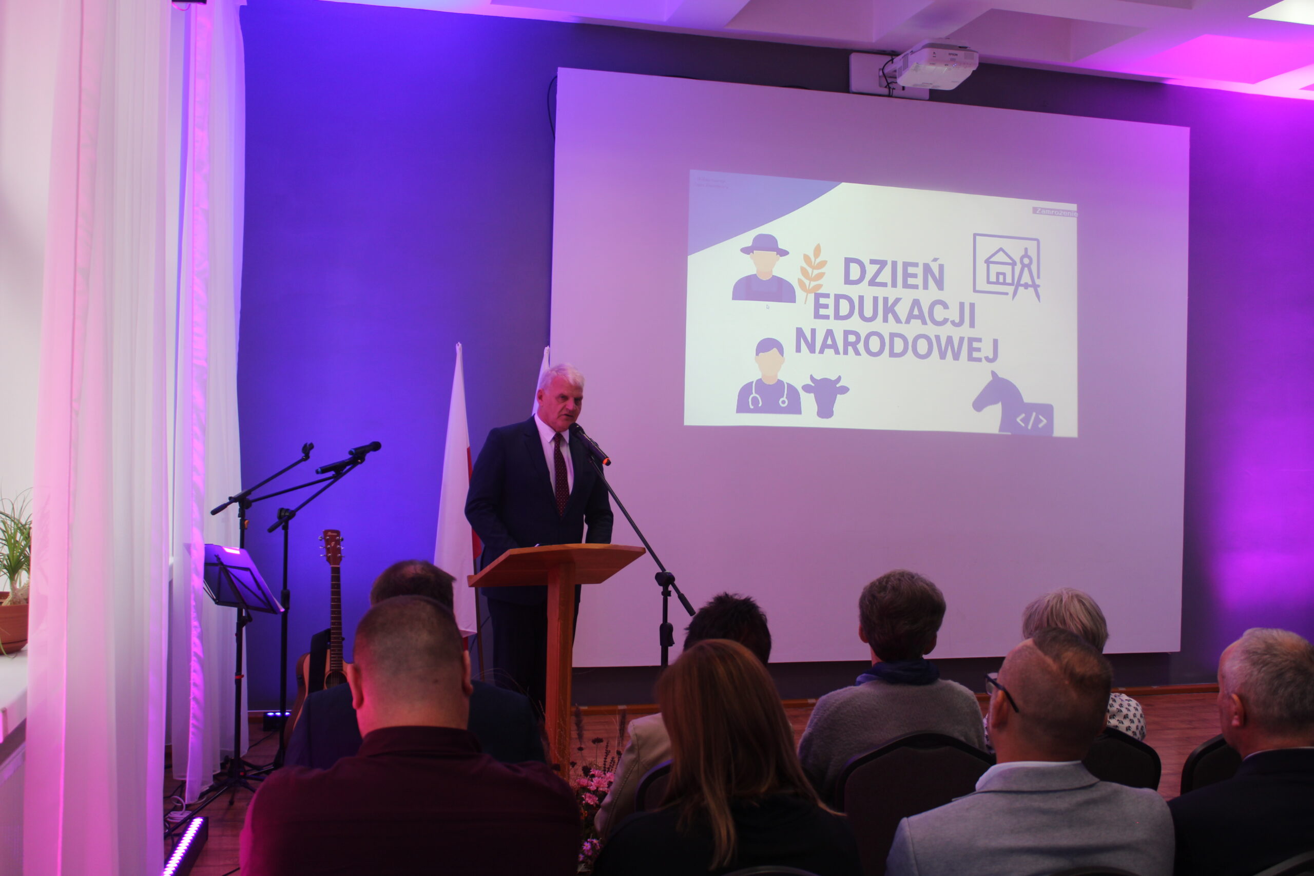 Uroczystość rozpoczęła się od wprowadzenia pocztu sztandarowego i odśpiewania hymnu państwowego. Następnie głos zabrał dyrektor szkoły, pan Stanisław Kosmowski, który powitał wszystkich zebranych gości, nauczycieli, uczniów oraz pracowników szkoły — zarówno tych obecnych, jak i emerytowanych. W swoim przemówieniu podkreślił, że Dzień Edukacji Narodowej to święto całej społeczności szkolnej – nie tylko nauczycieli, ale także wszystkich osób, które na co dzień dbają o prawidłowe funkcjonowanie placówki. Dyrektor wyraził wdzięczność za pracę, życzliwość i zaangażowanie wszystkich, którzy swoją postawą i oddaniem przyczyniają się do tworzenia przyjaznej, twórczej atmosfery w ZSCKR w Zduńskiej Dąbrowie.