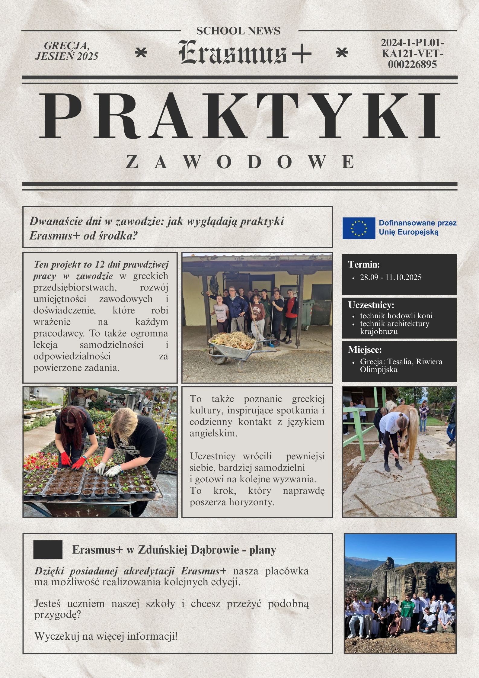 W dniach 29 września – 10 października 2025 roku grupa 25 uczniów z Zespołu Szkół Centrum Kształcenia Rolniczego w Zduńskiej Dąbrowie wzięła udział w zagranicznych praktykach zawodowych w Grecji, realizowanych w ramach programu Erasmus+.