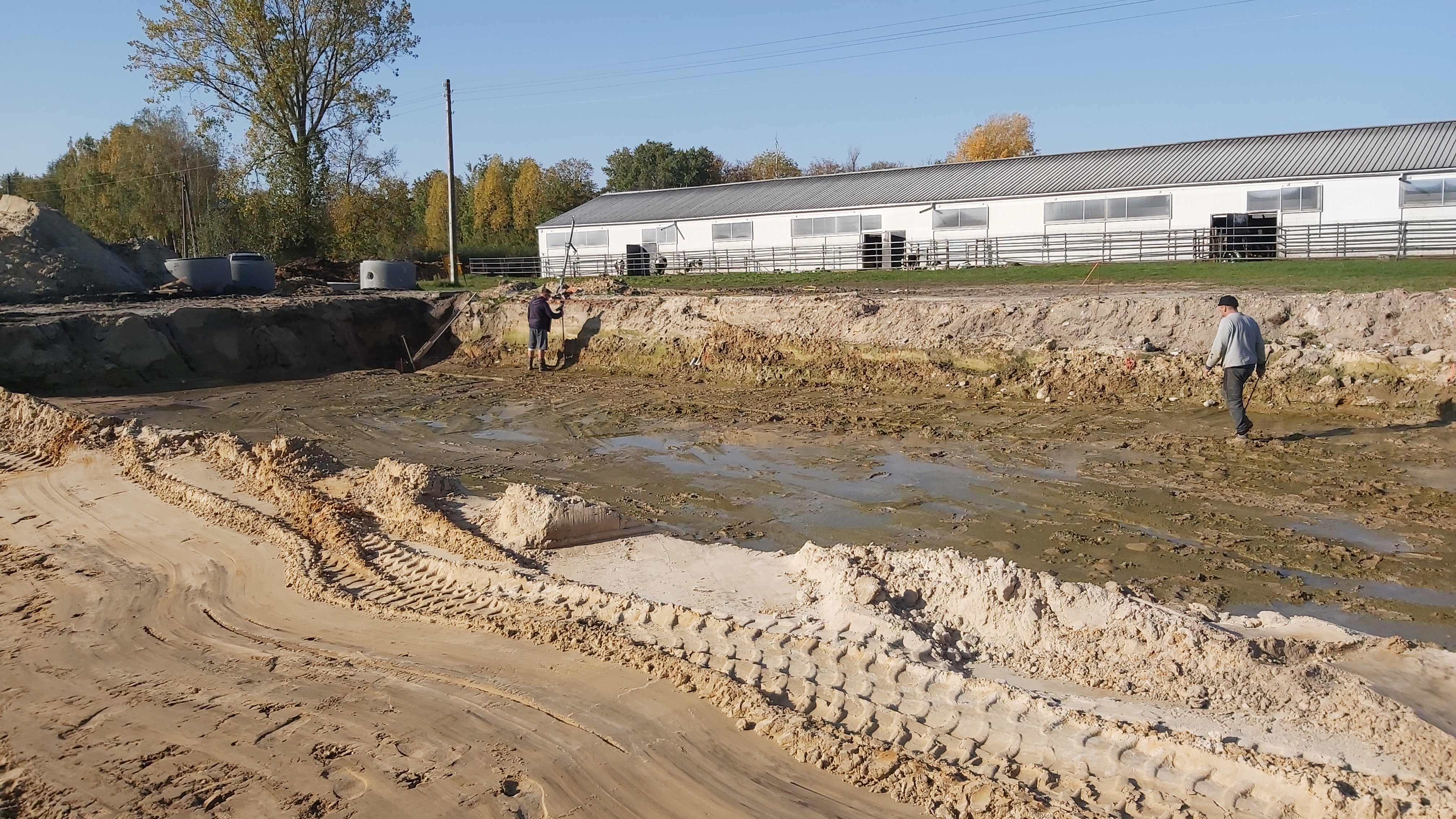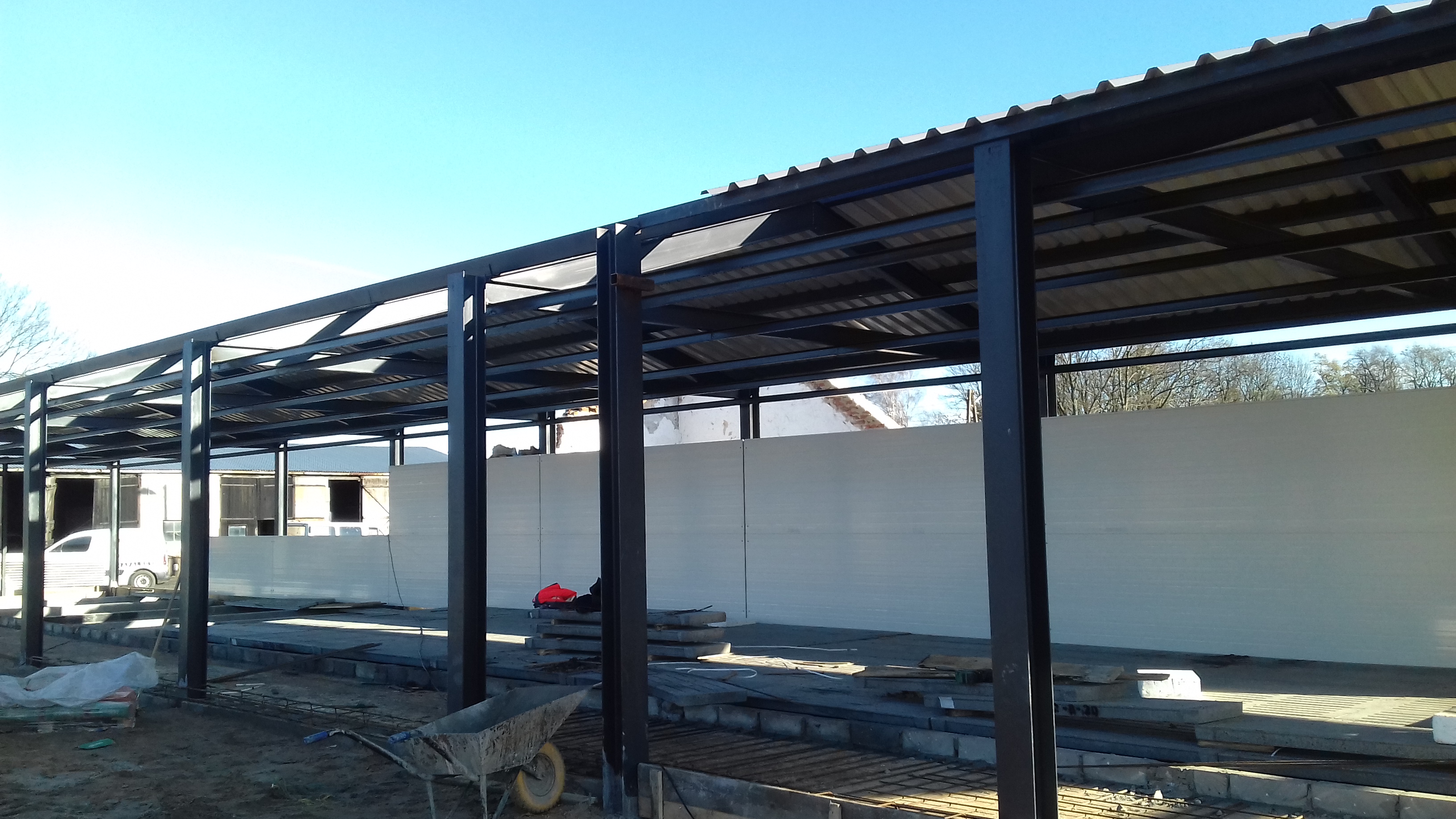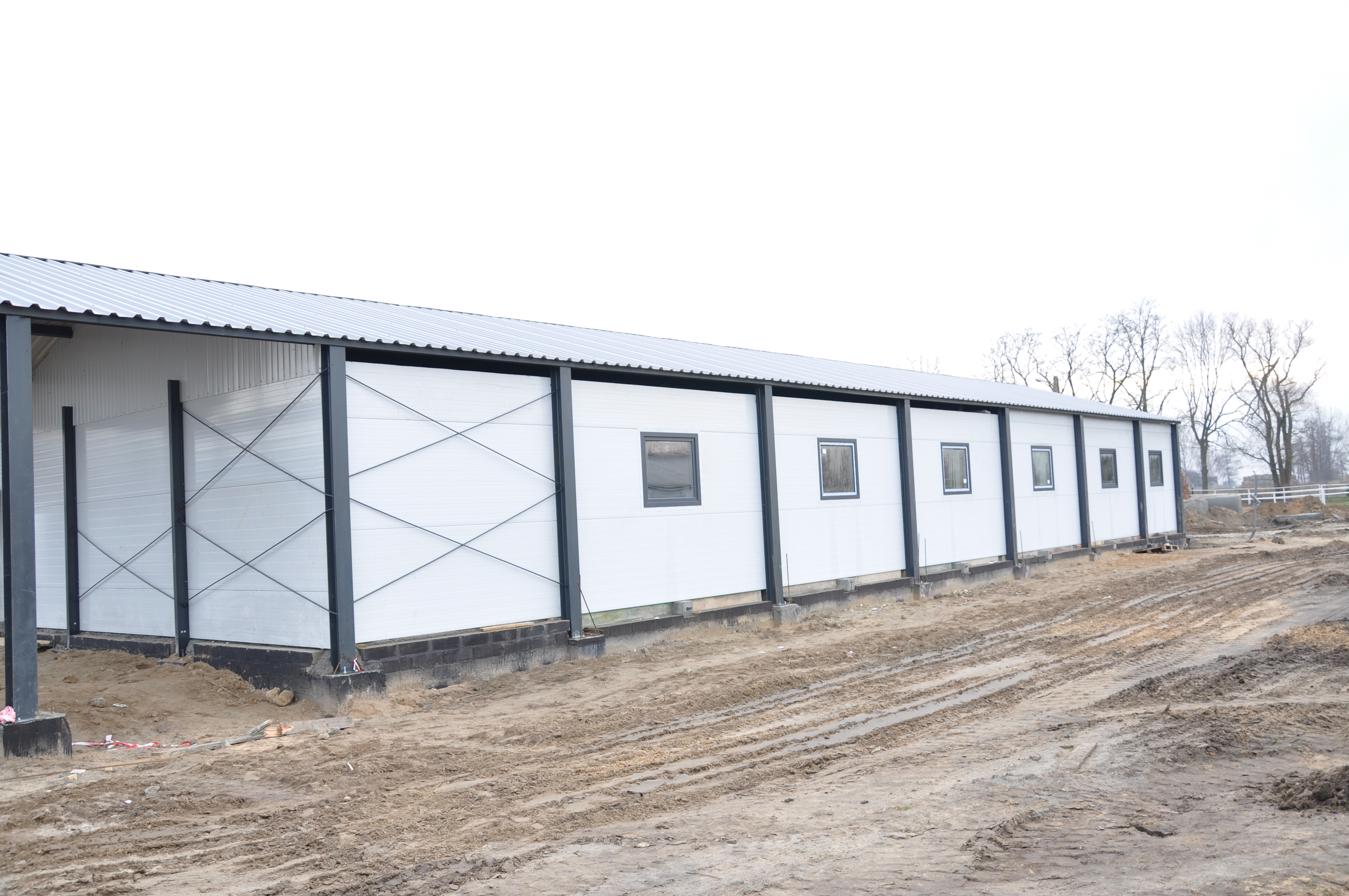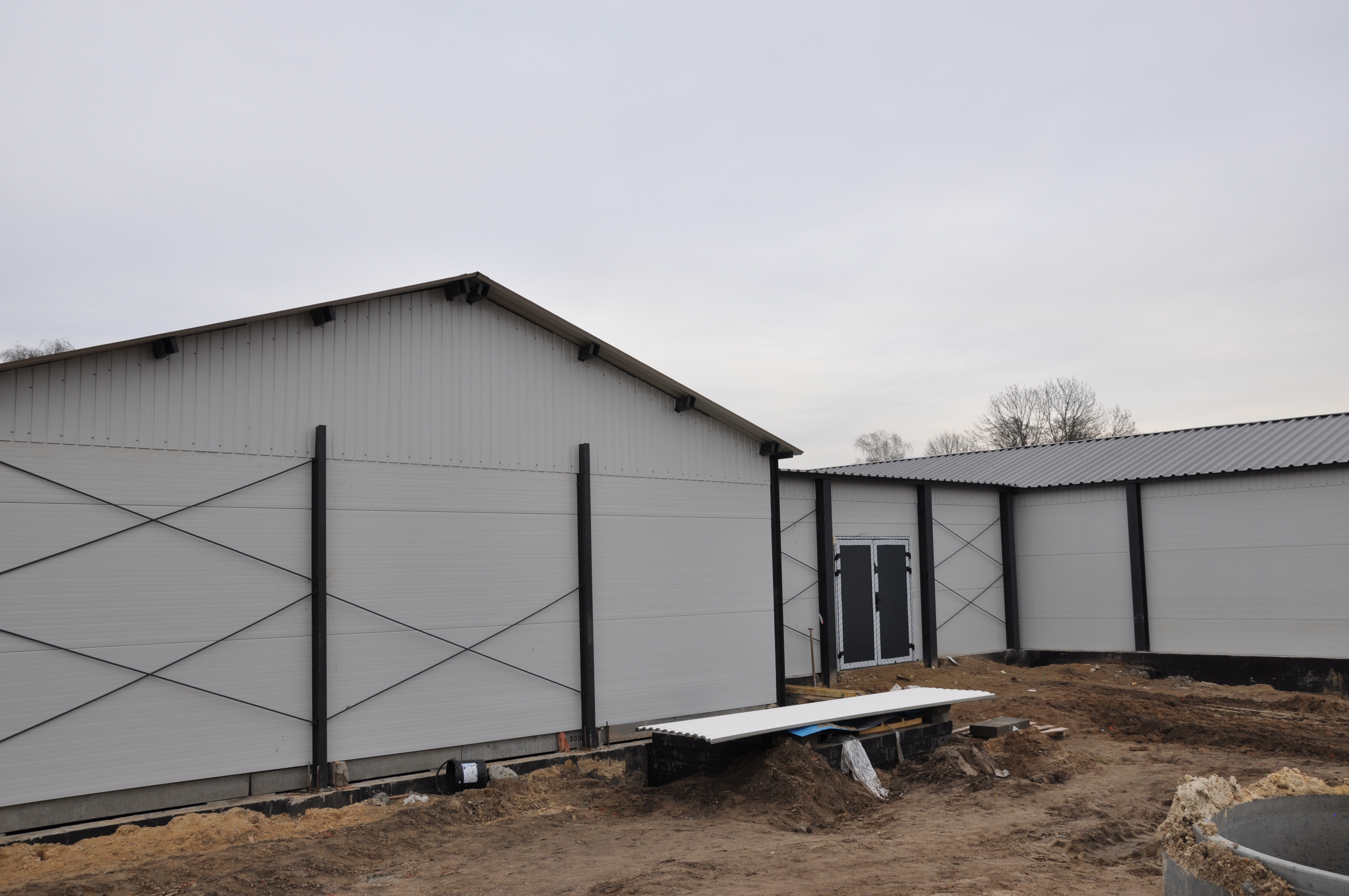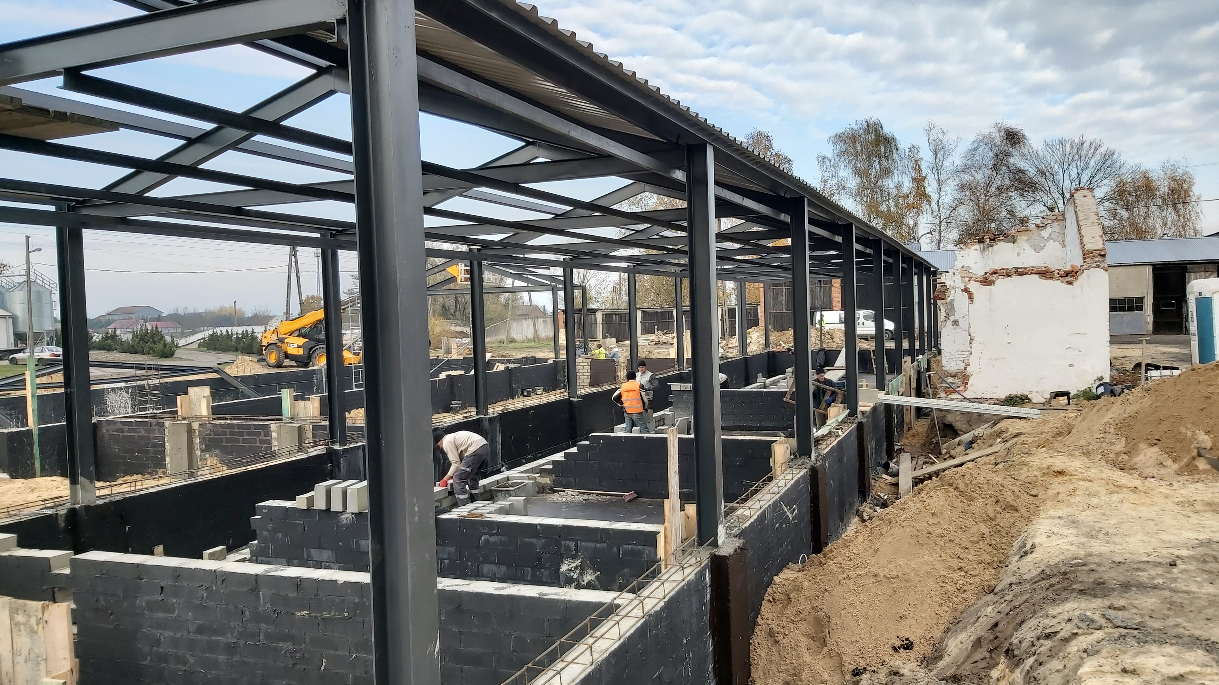 Wykonano prace ziemne polegające na wybraniu ziemi celem utwardzenia terenu. W dalszej kolejności wymurowano fundamenty z bloczka betonowego oraz komory i kanały na gnojowicę. Wykonano również zbiorniki rewizyjne na gnojowicę. Ustawiono na stopach betonowych stalowe słupy konstrukcyjne do montażu konstrukcji lekkiej z płyty warstwowej. W ścianach zewnętrznych zostały zamontowane okna i drzwi wejściowe. Słupy zostały ze sobą połączone za pomocą belek stalowych z profila zamkniętego. Na belkach ułożono dach z blachy trapezowej oraz zamontowano płyty warstwowe na ściany i podbitki na stropach. Ułożono ruszta na podciągach kanałowych. Wykonane zostały korki odpływowe z poszczególnych komór.