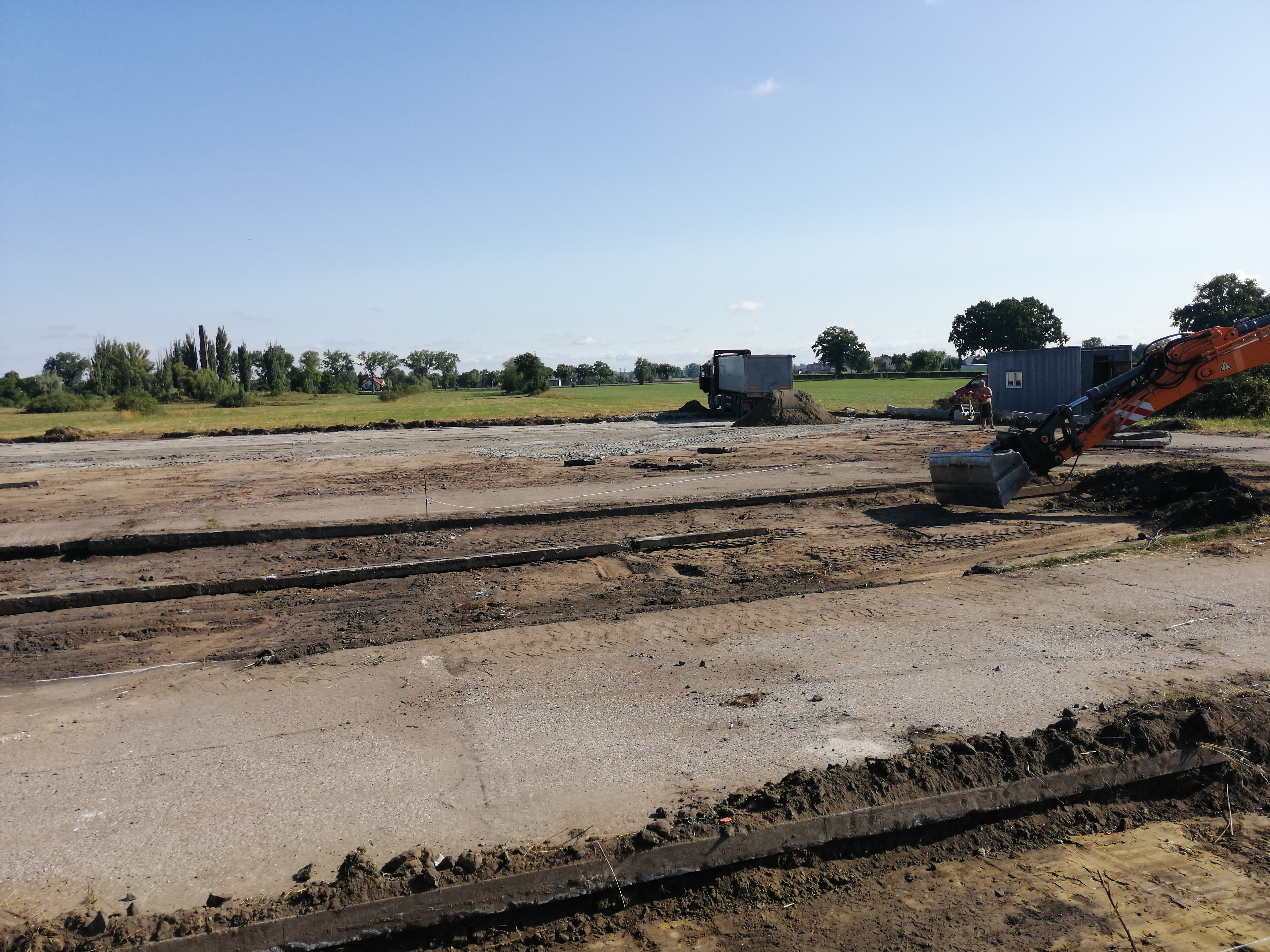 Firma wykonawcza – ENERGO-BUD Przemysław Trafalski OLESZCZE 46, 99-319 Dobrzelin, na podstawie opracowanych projektów budowlanych, wykonała prace budowlane na terenie starego poligonu do nauki jazdy. Teren poligonu został utwardzony za pomocą kostki przemysłowej typu H grubości 8 cm. Przed położeniem kostki teren został ustabilizowany warstwą suchego betonu na który została wysypana warstwa kruszywa kamiennego. Warstwy zostały zagęszczone. Na kruszywo została zastosowana warstwa suchego betonu, po zagęszczeniu której ułożono kostkę betonową. Wszystkie prace zostały wykonane zgodnie z projektem przebudowy i rozbudowy placu manewrowego. Na placu manewrowym zgodnie z Rozporządzeniem dot. Szkolenia kandydatów na kierowców zostały wymalowane linie do nauki jazdy do szkolenia kierowców na kat. B i T. Została wybudowana górka podjazdowa oraz budynek dla instruktora nauki jazdy. Wokół placu zostały ustawione lampy oświetleniowe a do budynku doprowadzono instalację elektryczną. Plac został ogrodzony za pomocą siatki panelowej. W ogrodzeniu zamontowano bramę wjazdową. Między placem manewrowym a ogrodzeniem została nawieziona ziemia i posiano trawę. Do pełnego wyposażenia placu zakupiono zgodnie ze specyfikacją znaki drogowe i pachołki ograniczające parkingi i wyznaczające tor jazdy. Roboty realizowano w okresie od dnia 16.05.2019 r. do dnia 31.10.2019 r. Ostateczny odbiór placu manewrowego przez komisję został przeprowadzony w dniu 31.10.2019 r. Plac manewrowy jest współfinansowany przez Unię Europejską z Europejskiego Funduszu Rozwoju Regionalnego w Ramach Programu Operacyjnego Województwa Łódzkiego na lata 2014-2020.