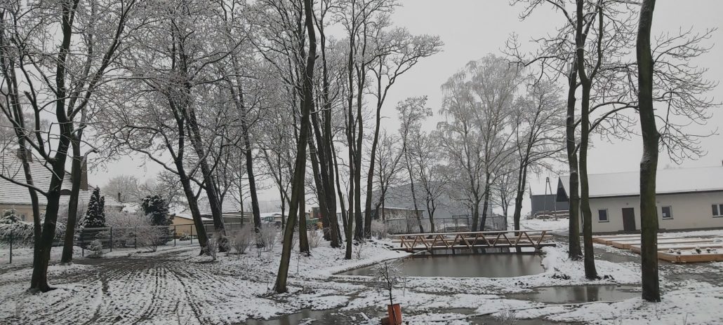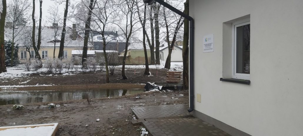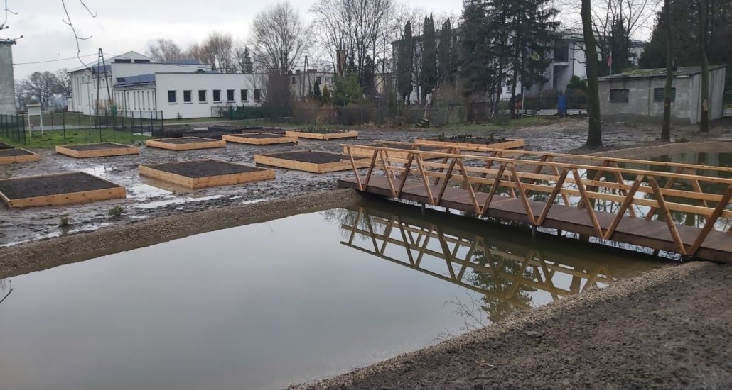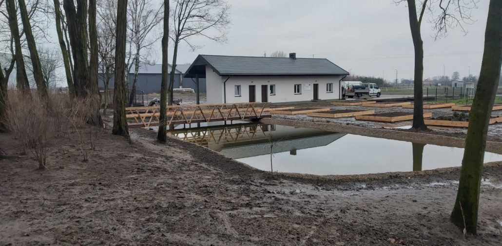 - Została wykonana naprawa, remont i modernizacja zbiornika wodnego zlokalizowanego na działce 38/3. Modernizacja zbiornika wodnego polegała na jego oczyszczeniu z pomocą specjalnej koparki o dużym wysięgu, wyłożenie dna specjalną folią EPDM na specjalnej włókninie, utwardzeniu brzegów i dna zbiornika kruszywem oraz odprowadzeniu nadmiaru wody. Brzegi zbiornika zostały umocnione betonem w który wtopiono kruszywo. Zbiornik został napełniony wodą. W zachodniej części zbiornika zostały zamontowane dwie komory przeznaczone w przyszłości do filtracji wody. Pozostała część skarpy otaczająca zbiornik wodny została obsadzona roślinnością wodną, stanowiąc naturalną warstwę filtracyjną wody. Powierzchnia zmodernizowanego zbiornika wynosi ok. 300m2. Przez zbiornik został wybudowany mostek służącego do przejścia z części dydaktyczno-wypoczynkowej do części parkowej działki, na drugą stronę zbiornika.