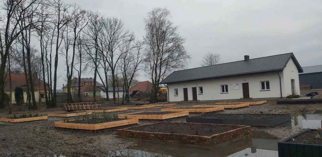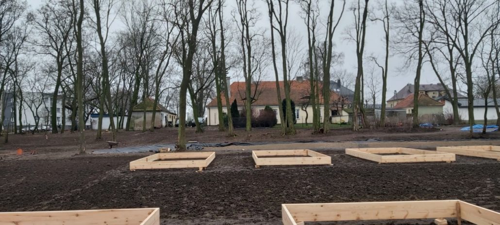 Część dydaktyczno-odpoczynkowa Działka 37/1 – skrzynie podniesione i trawniki w trakcie modernizacji