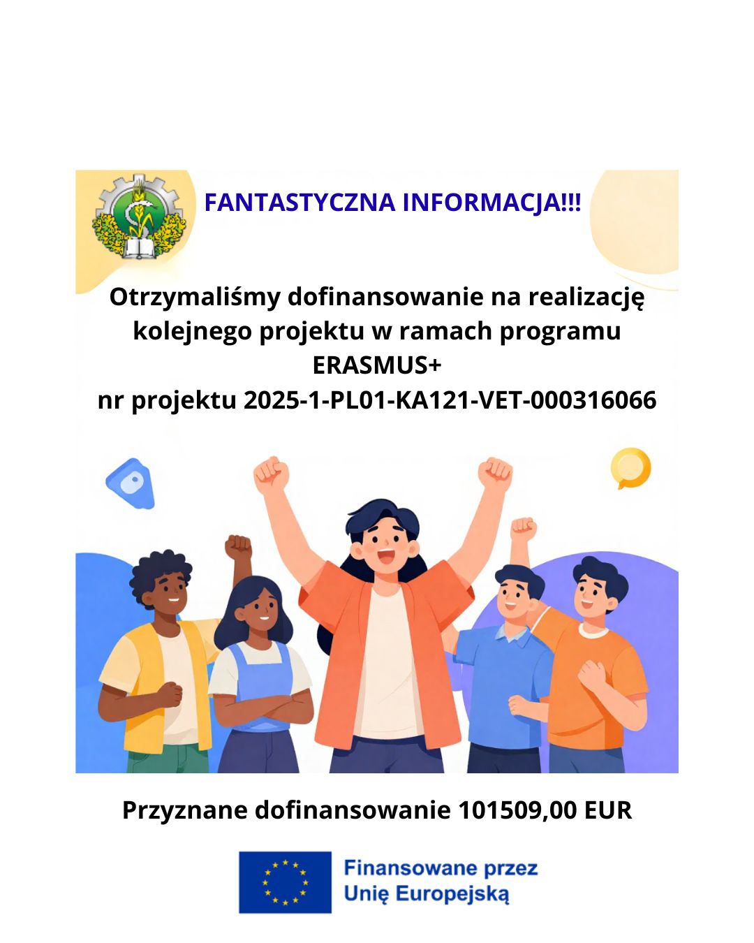 Z radością informujemy, że nasza szkoła po raz kolejny otrzymała dofinansowanie w ramach programu Erasmus+ (akcja KA-121-VET), w ramach akredytacji 2020-1-PL01-KA120-VET-096291. Dzięki tym środkom nasi uczniowie będą mieli okazję zdobyć cenne doświadczenie zawodowe na arenie międzynarodowej!