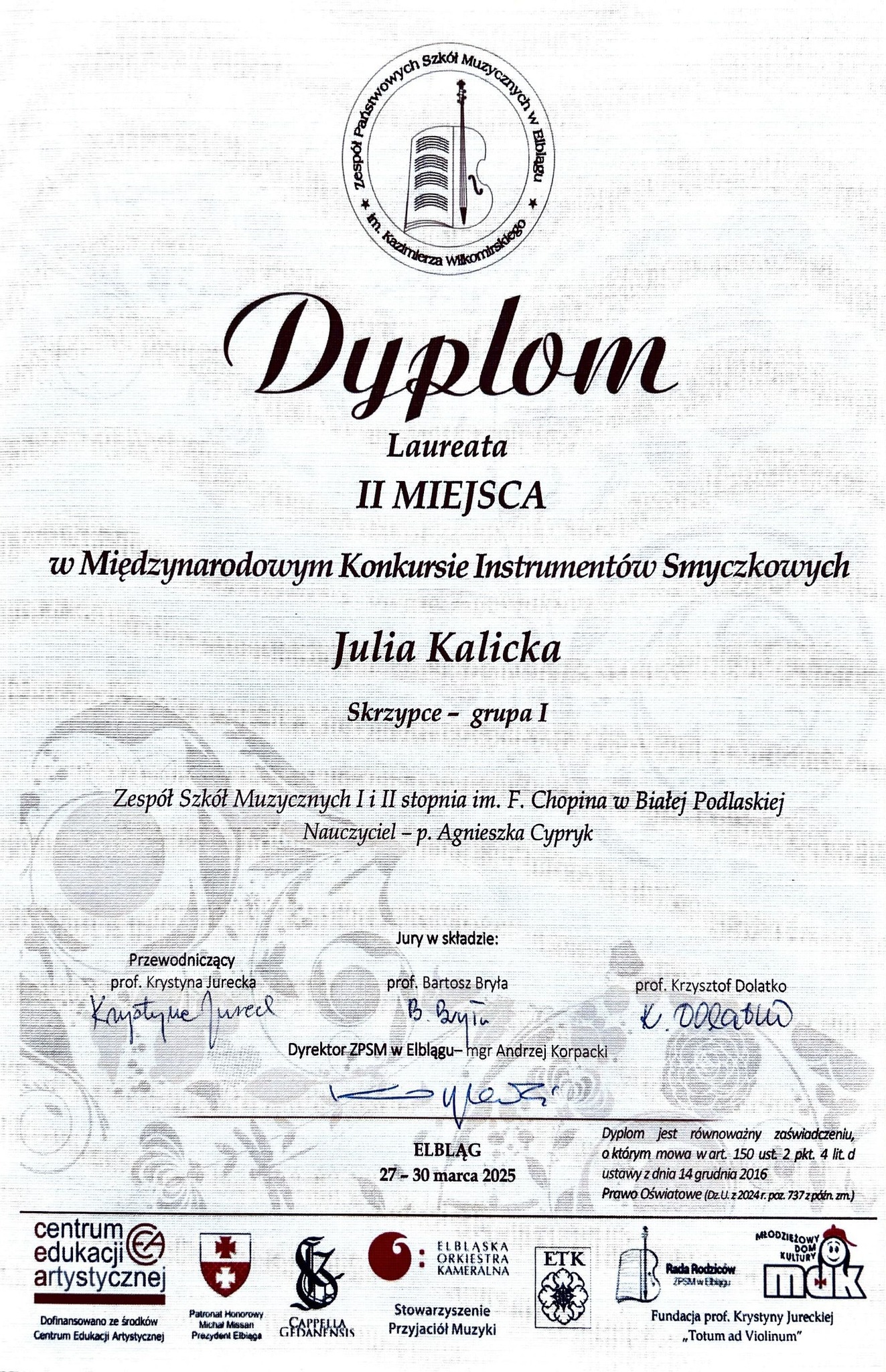 Szanowni Państwo, z dumą informujemy, że uczennica naszej szkoły JULIA KALICKA pracująca pod kierunkiem pani Agnieszki Cypryk zajęła 2 miejsce na Międzynarodowym Konkursie Instrumentów Smyczkowych w Elblągu!