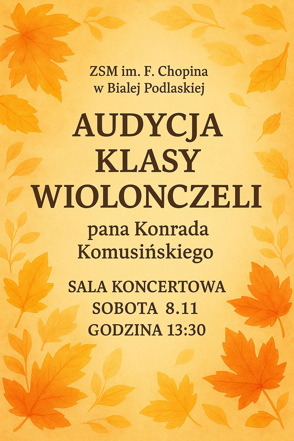 8.11.2025 o godzinie 13:30 odbyła się audycja klasy wiolonczeli Pana Konrada Komusińskiego.