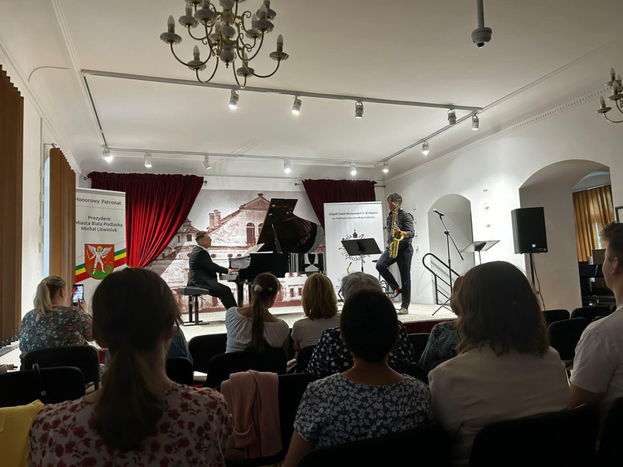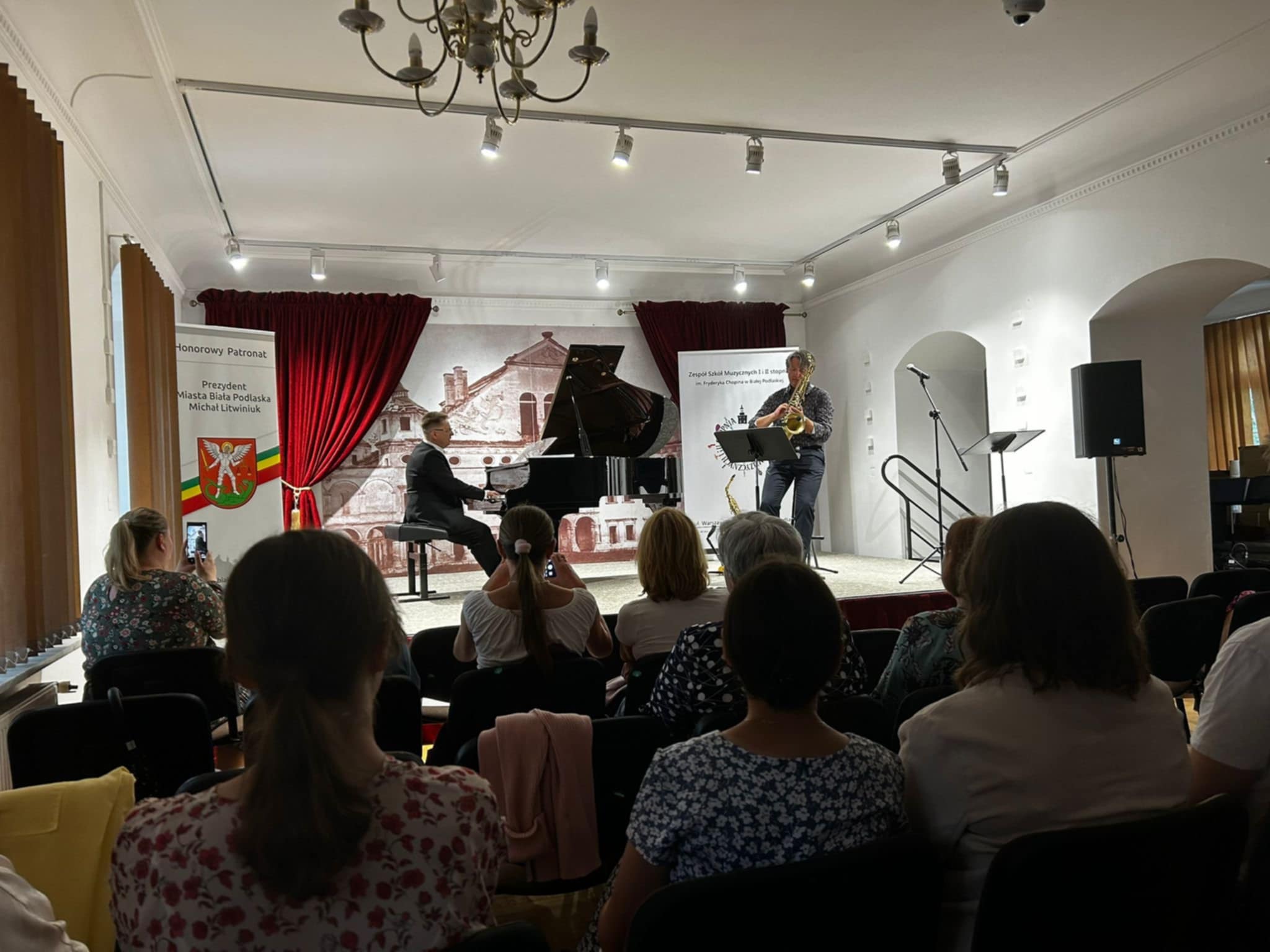 Szanowni Państwo, dnia 27 lipca 2025 roku odbył się drugi koncert z cyklu "Muzyka u Radziwiłłów". Tym razem muzyka zagościła w murach sali koncertowej ZSM I i II st. im. F. Chopina w Białej Podlaskiej z powodu kapryśnej pogody. Wykonawcami koncertu byli: dyrektor ZSM I i II st. w Białej Podlaskiej pan Radosław Żyła - saksofon i nasz nauczyciel pan Vadzim Kanavalik - fortepian.