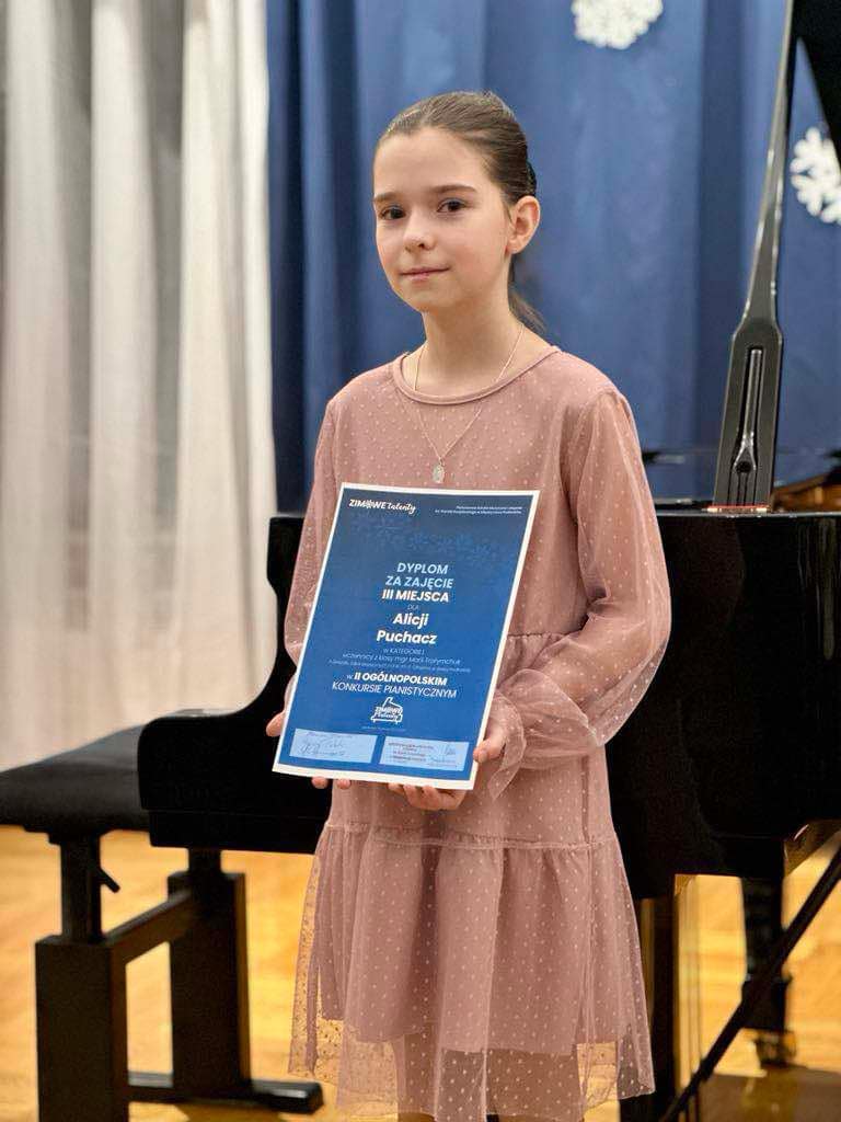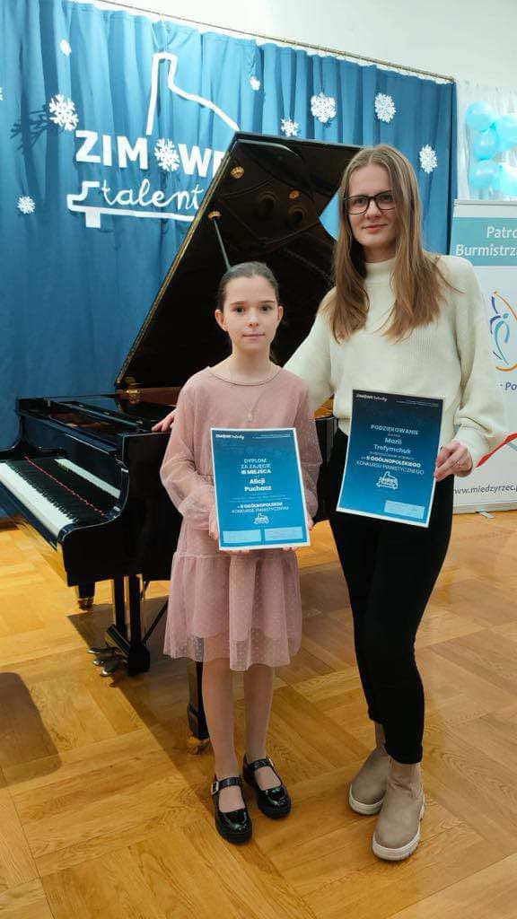 Dnia 13 lutego 2025 r., uczennica pani Marii Trofymchuk Alicja Puchacz zdobyła III miejsce w I kategorii podczas II Ogólnopolskiego Konkursu Pianistycznego ,,Zimowe Talenty” w Międzyrzecu Podlaskim.
