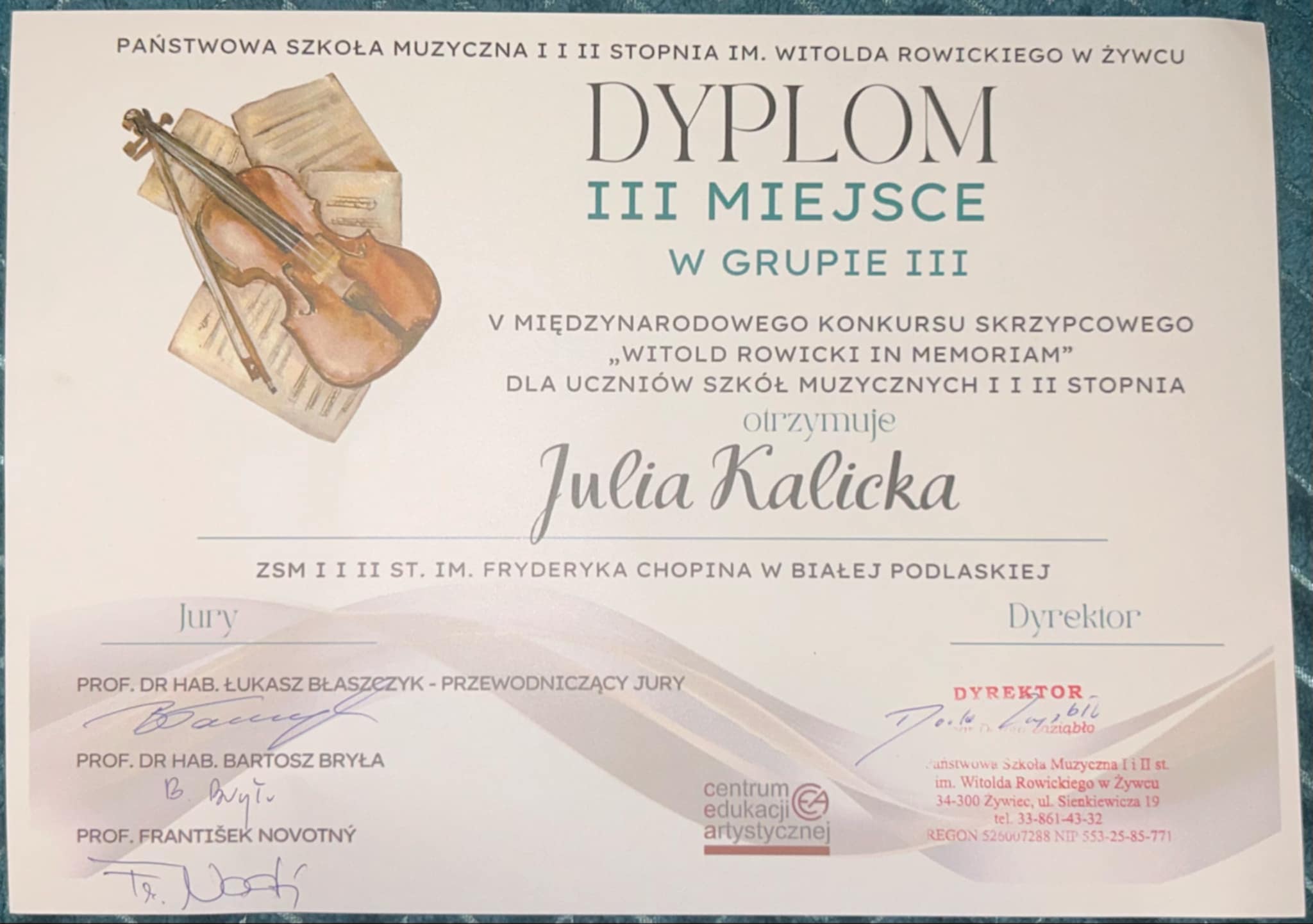 W dniach 23-25.10.2024 r., w Państwowej Szkole Muzycznej I i II st. w Żywcu odbył się organizowany przez Centrum Edukacji Artystycznej V Międzynarodowy Konkurs Skrzypcowy "Witold Rowicki in Memoriam". Jest nam bardzo miło poinformować, że uczennica pani Agnieszki Cypryk-Chmielewskiej, JULIA KALICKA zdobyła na nim III miejsce w najstarszej grupie.