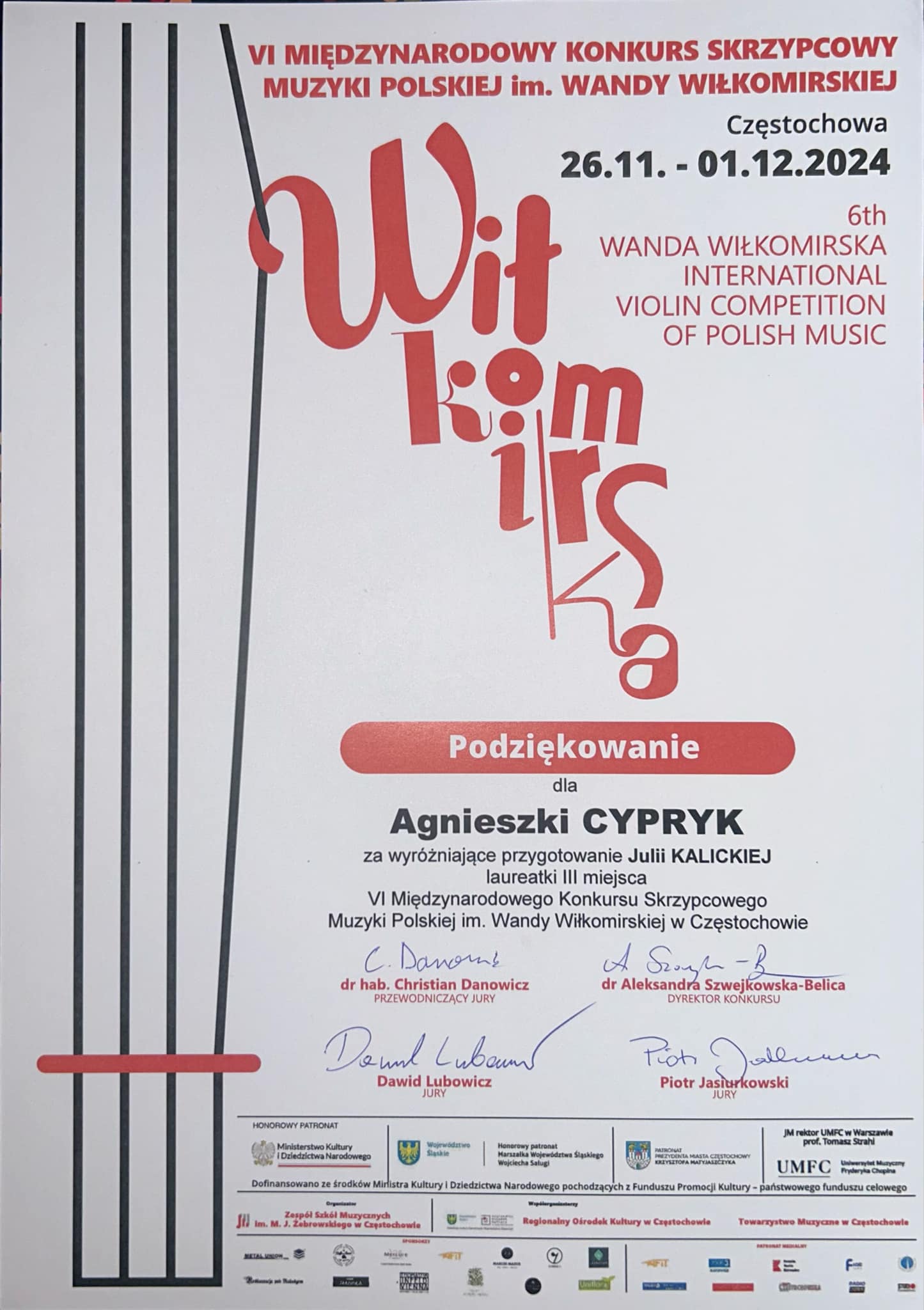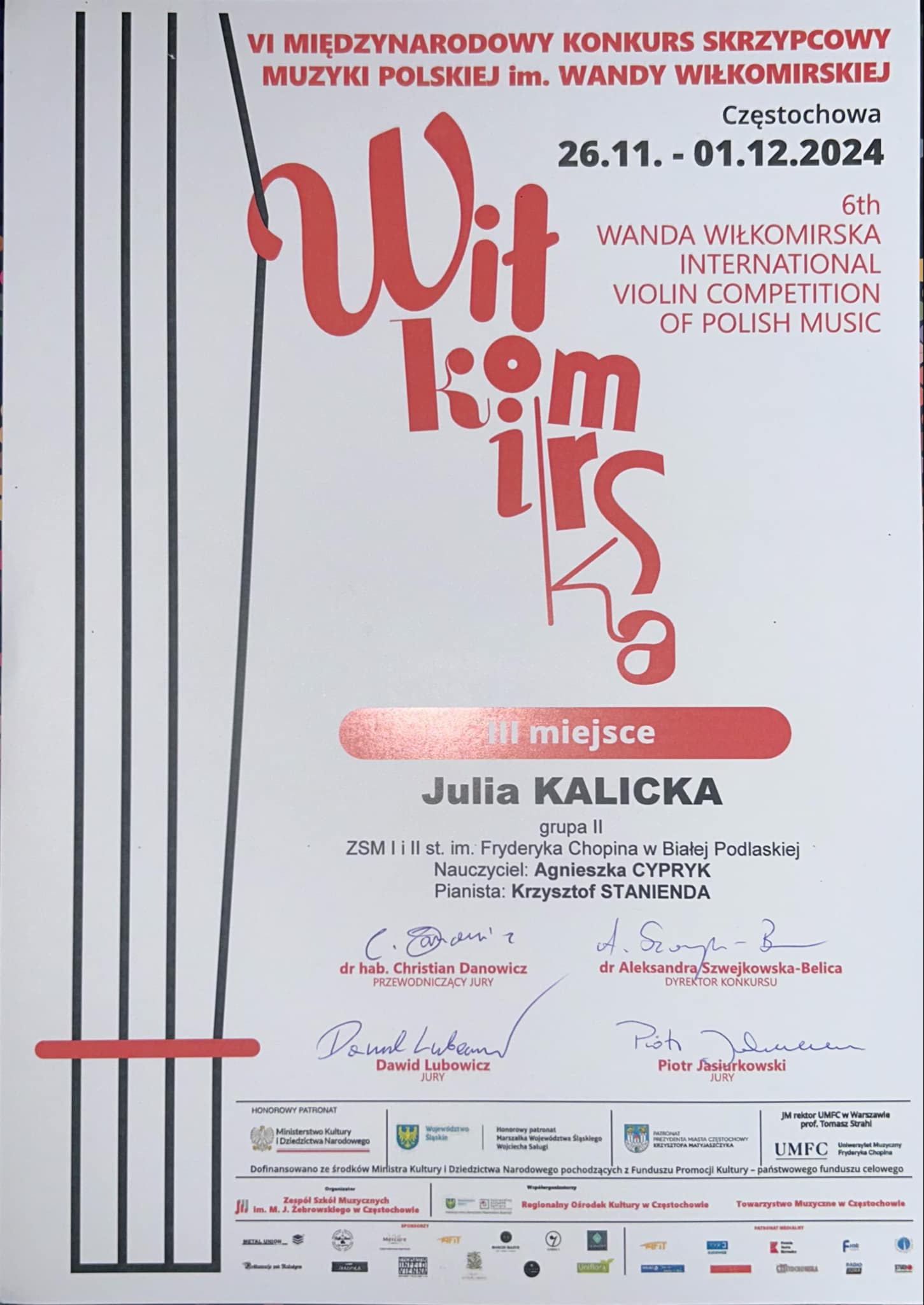Szanowni Państwo. Z dumą informujemy, że uczennica naszej Szkoły JULIA KALICKA, pracująca pod opieką pani Agnieszka Cypryk zajęła III miejsce w grupie II na VI Międzynarodowym Konkursie Skrzypcowym Muzyki Polskiej im. Wandy Wiłkomirskiej w Częstochowie.