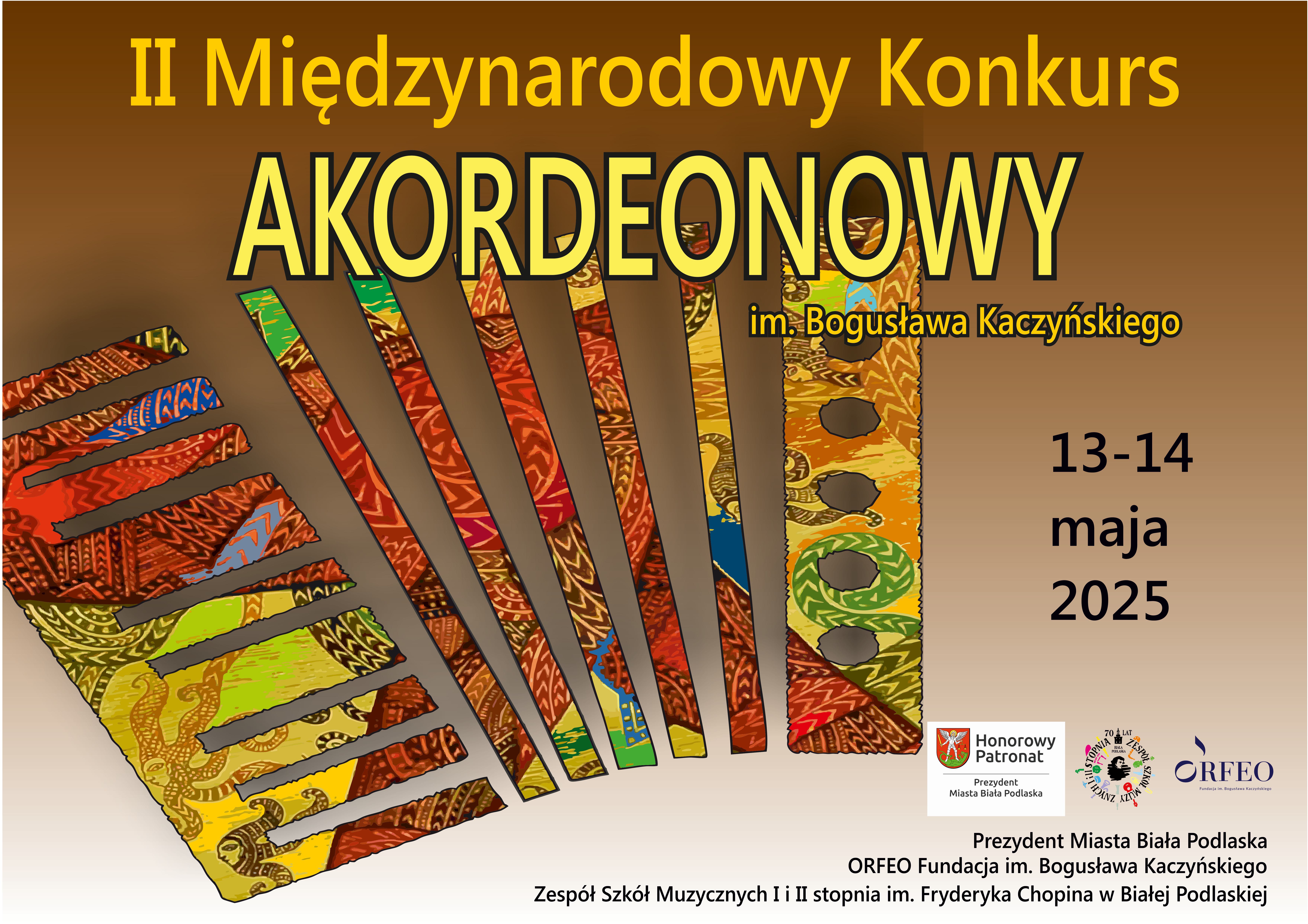 Zespół Szkół Muzycznych I i II st. im. F. Chopina w Białej Podlaskiej, Prezydent Miasta Biała Podlaska oraz Fundacja Orfeo im. Bogusława Kaczyńskiego serdecznie zapraszają do udziału w II Międzynarodowym Konkursie Akordeonowym im. Bogusława Kaczyńskiego, który odbędzie się w Białej Podlaskiej w dniach 13-14 maja 2025 roku.