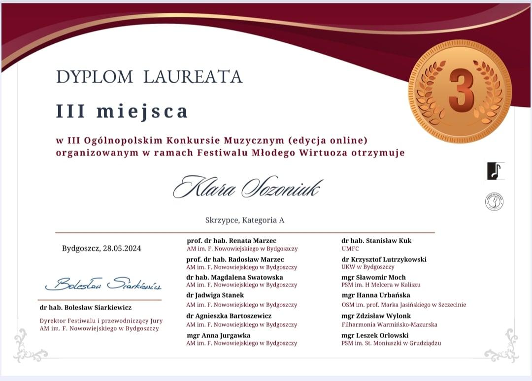 Klara Sozoniuk, uczennica pani Małgorzaty Kalisz, zdobyła III miejsce w III Ogólnopolskim Konkursie Muzycznym (edycja on-line) organizowanym w ramach Festiwalu Młodego Wirtuoza w Bydgoszczy, w kategorii B.