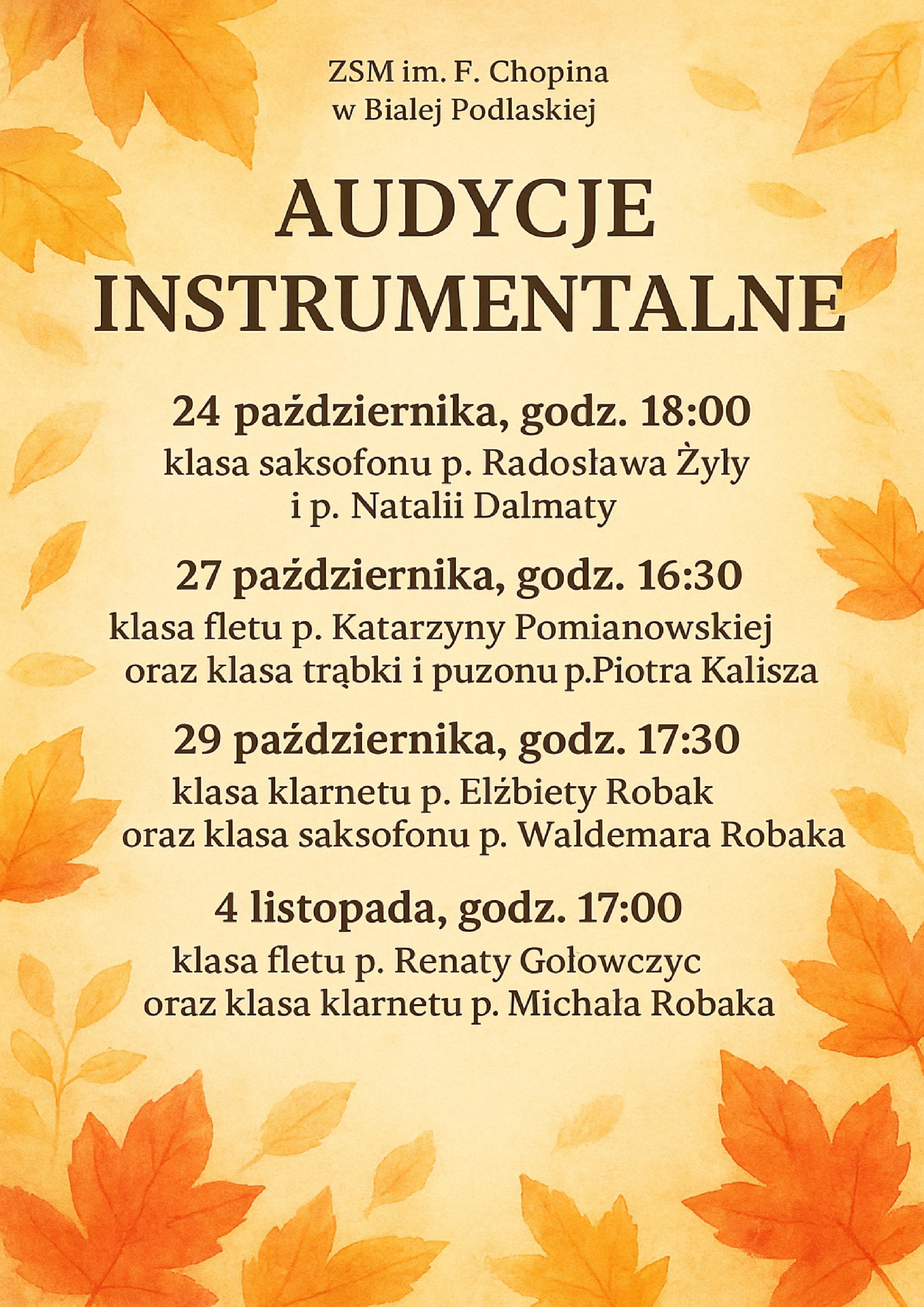 Jesień w naszej szkole to czas muzycznych spotkań i prezentacji dorobku uczniów klas instrumentów dętych. W dniach od 24 października do 4 listopada 2025 r. odbędą się jesienne audycje klas instrumentów dętych drewnianych i blaszanych, podczas których młodzi wykonawcy zaprezentują swoje umiejętności i muzyczną wrażliwość. Terminy audycji: