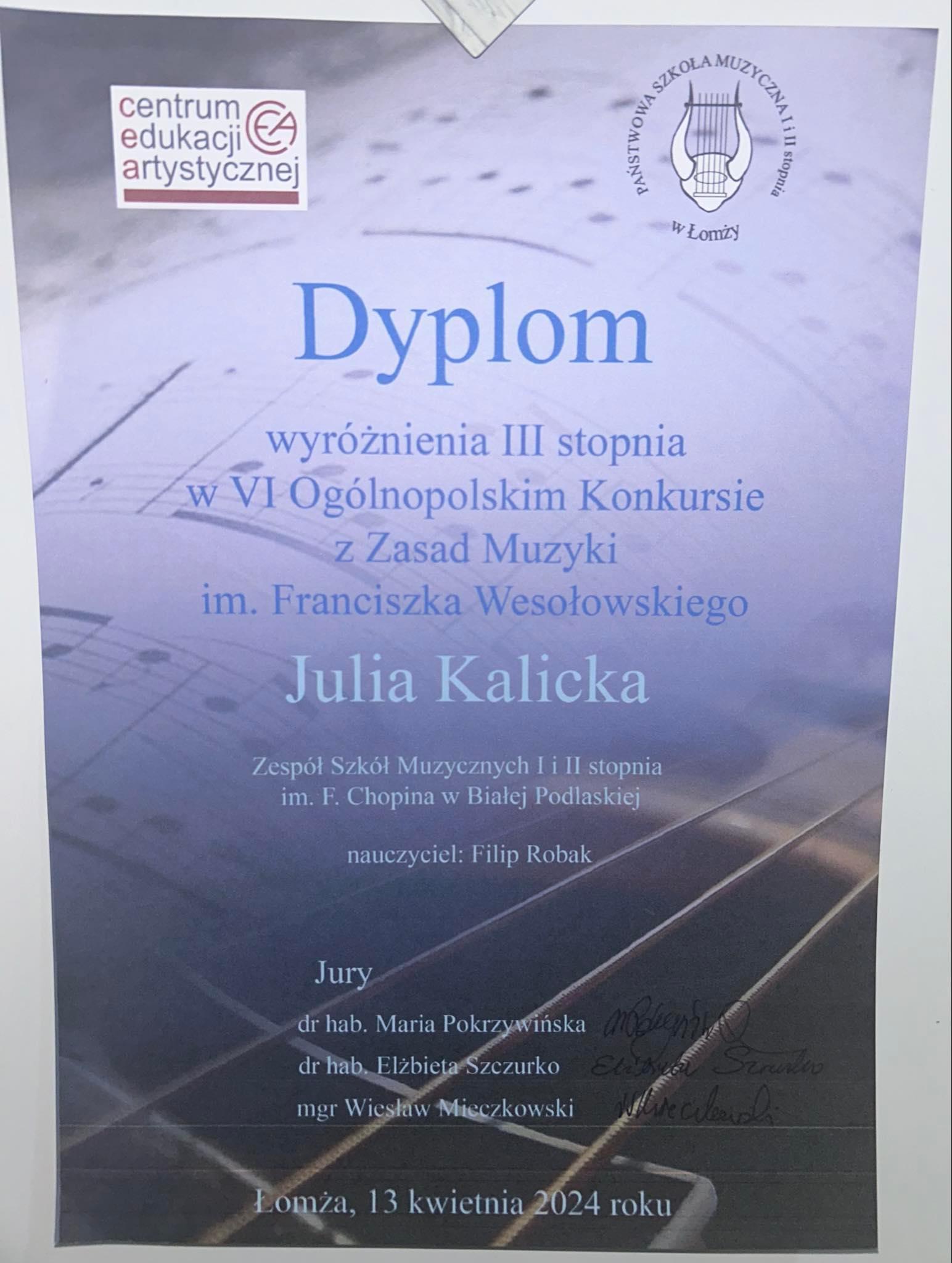 🏅Julia Kalicka została laureatką wyróżnienia na VI Ogólnopolskim Konkursie z Zasad Muzyki📖.