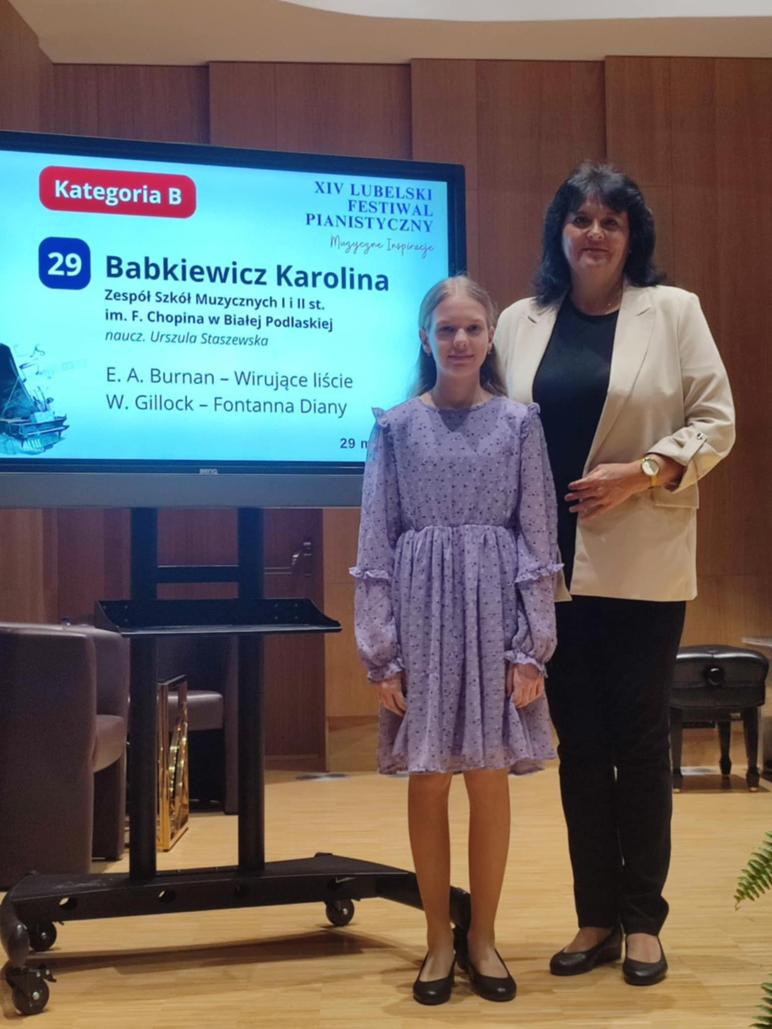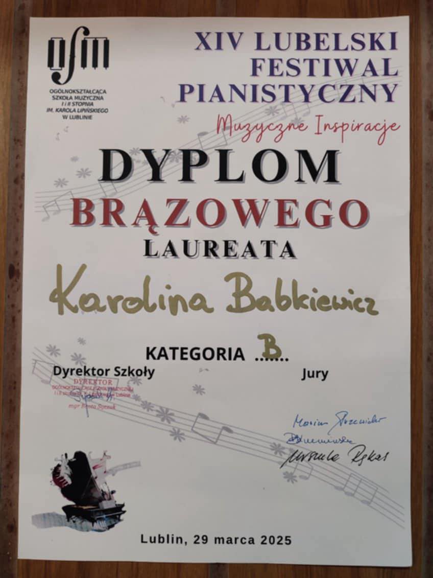 Podczas XIV Lubelskiego Festiwalu Pianistycznego ,,Muzyczne Inspiracje’’ w Lublinie, uczennica pani Urszuli Staszewskiej, Karolina Babkiewicz zdobyła Dyplom Brązowego Laureata.