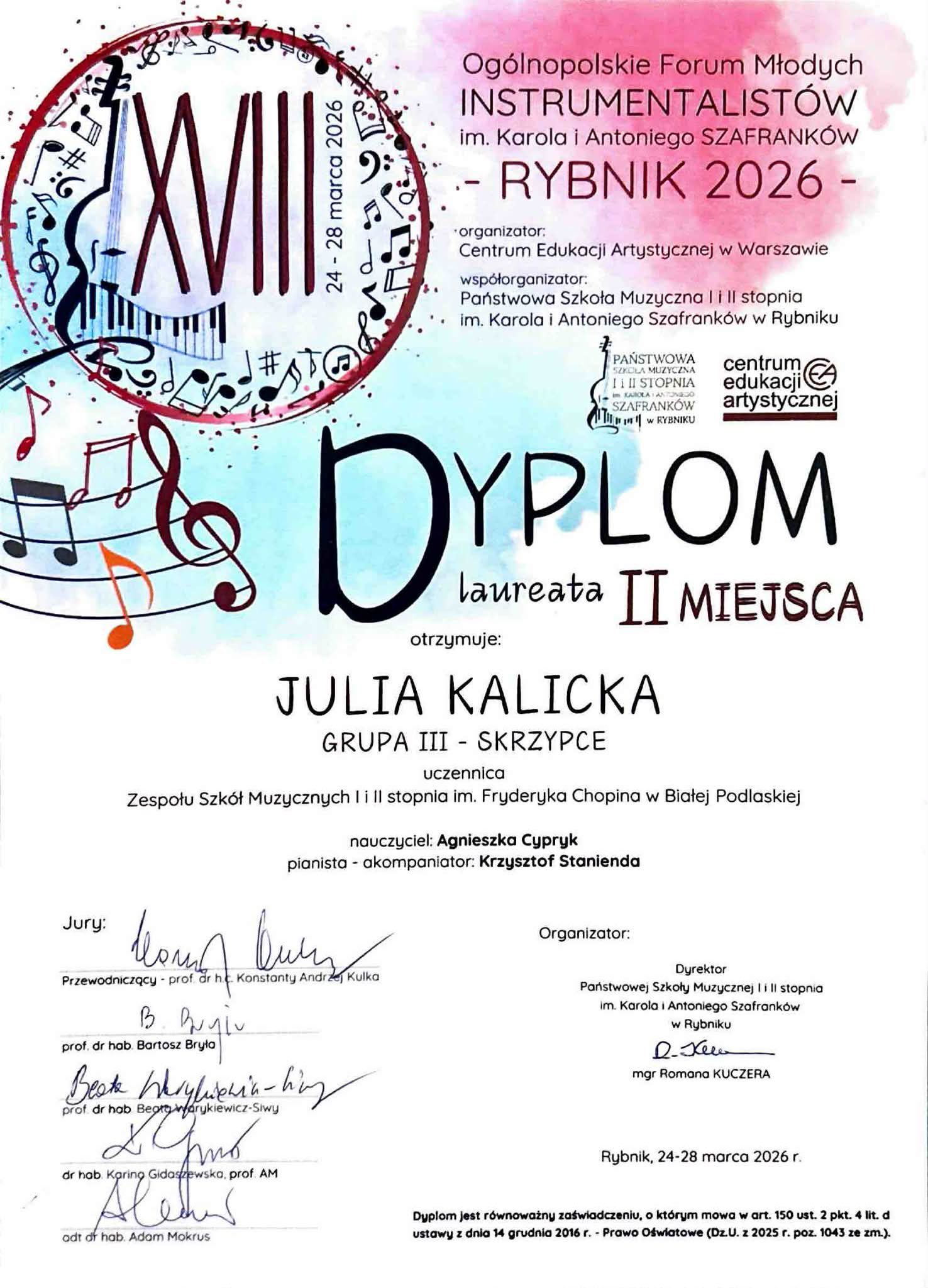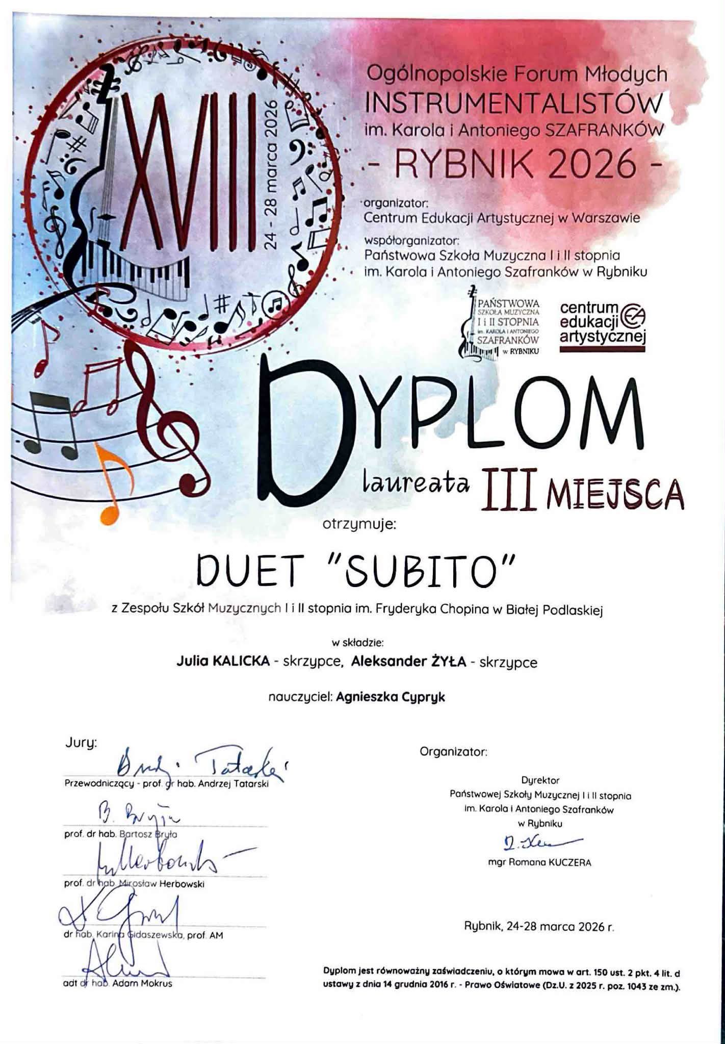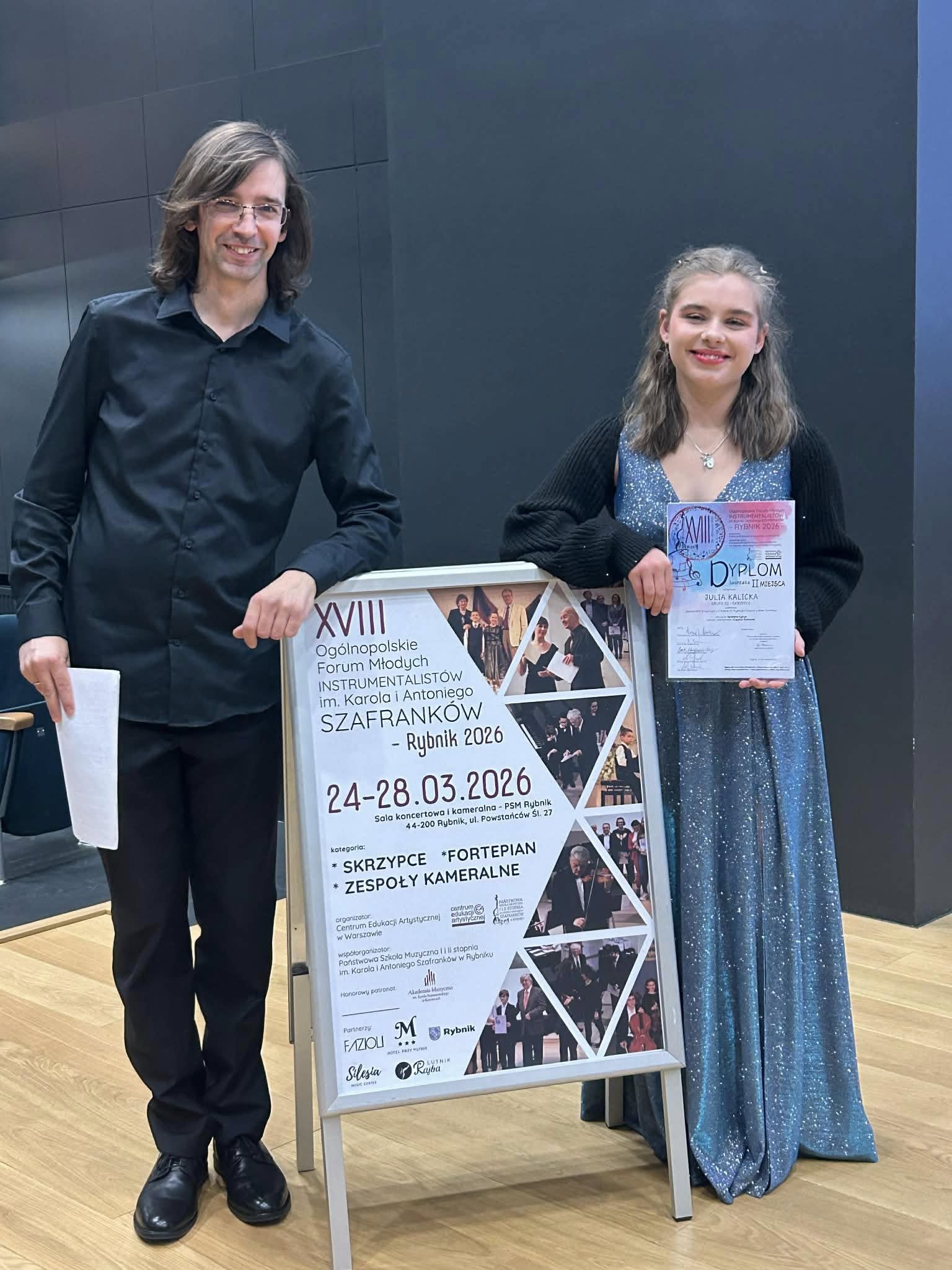 Z przyjemnością informujemy, że uczennica naszej szkoły Julia Kalicka otrzymała na nim II nagrodę w grupie III a duet ,,Subito" w składzie Julia Kalicka i Aleksander Żyła zdobył III nagrodę!!!