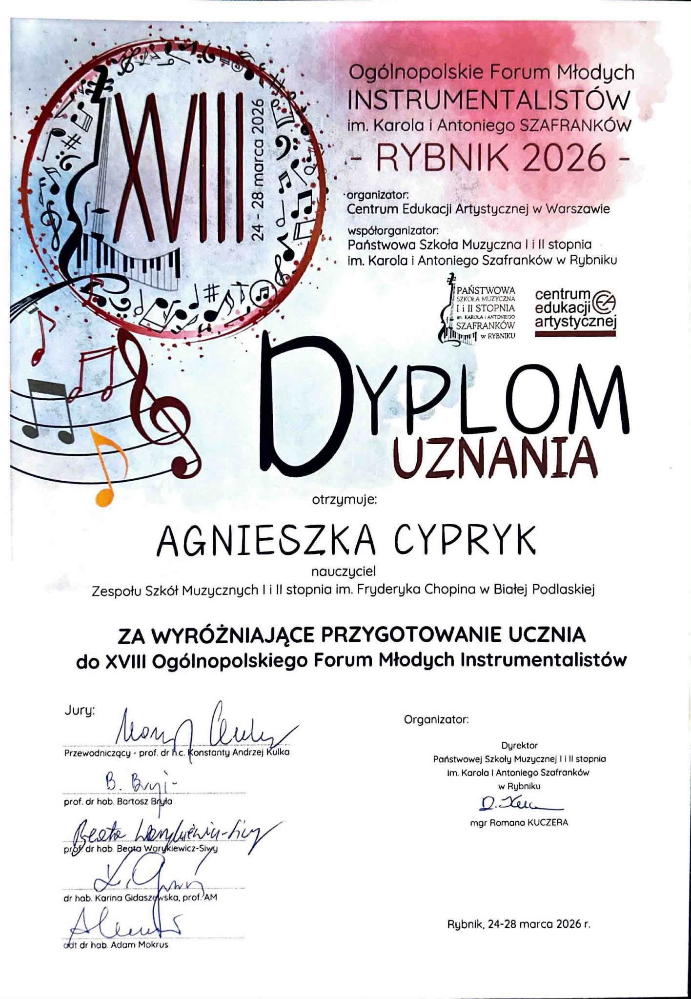 W dniach 24-28 marca w Rybniku odbyło się organizowane przez Centrum Edukacji Artystycznej i Państwową Szkołę Muzyczną I i II st. im. Karola i Antoniego Szafranków „XVIII Ogólnopolskie Forum Młodych Instrumentalistów”.