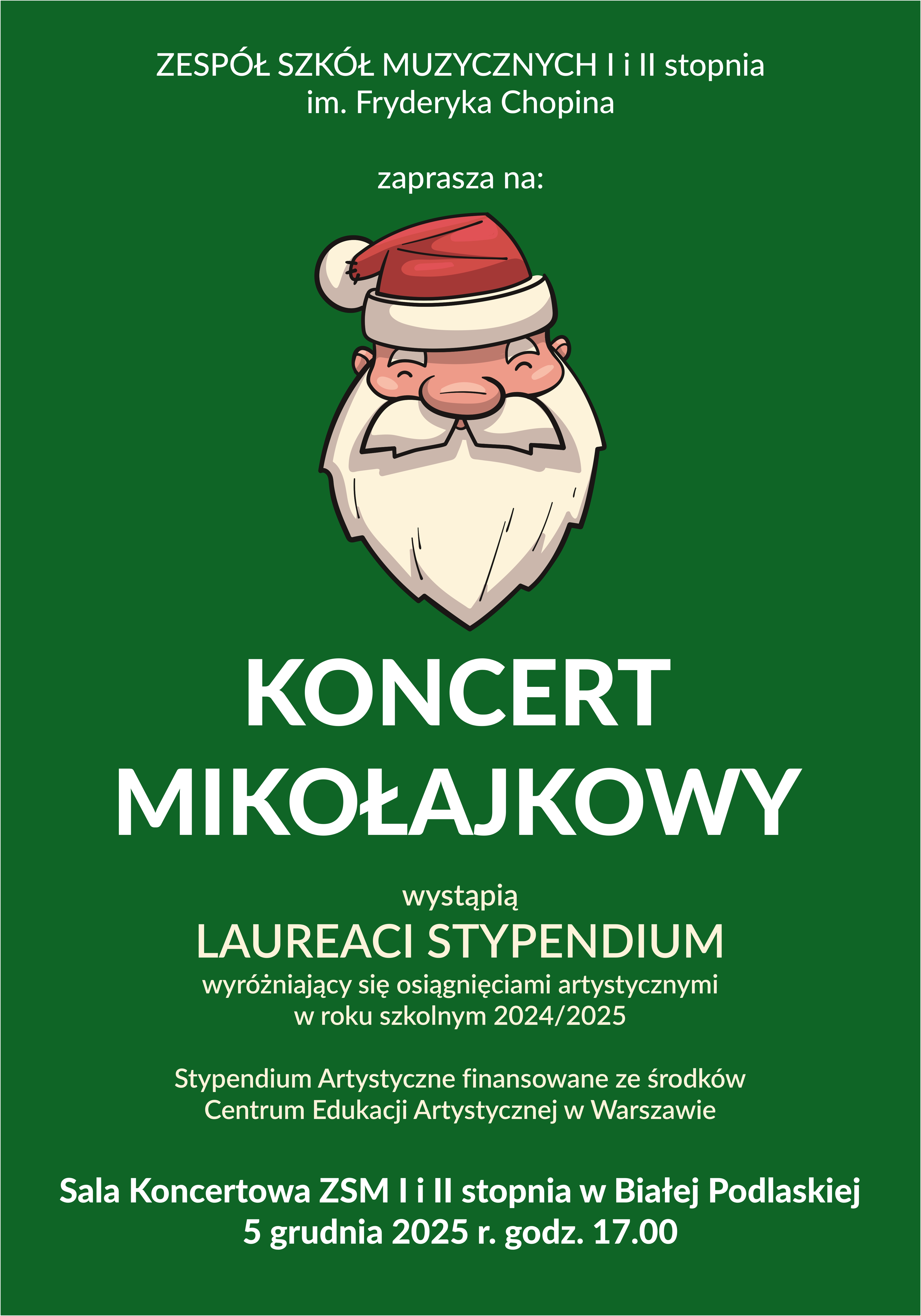 Zespół Szkół Muzycznych I i II stopnia w Białej Podlaskiej z radością zaprasza na koncert naszych stypendystów. To wyjątkowy moment, w którym uczniowie podzielą się efektami swojej pracy i zaangażowania, a my wszyscy będziemy mogli spędzić razem miłe, muzyczne popołudnie.