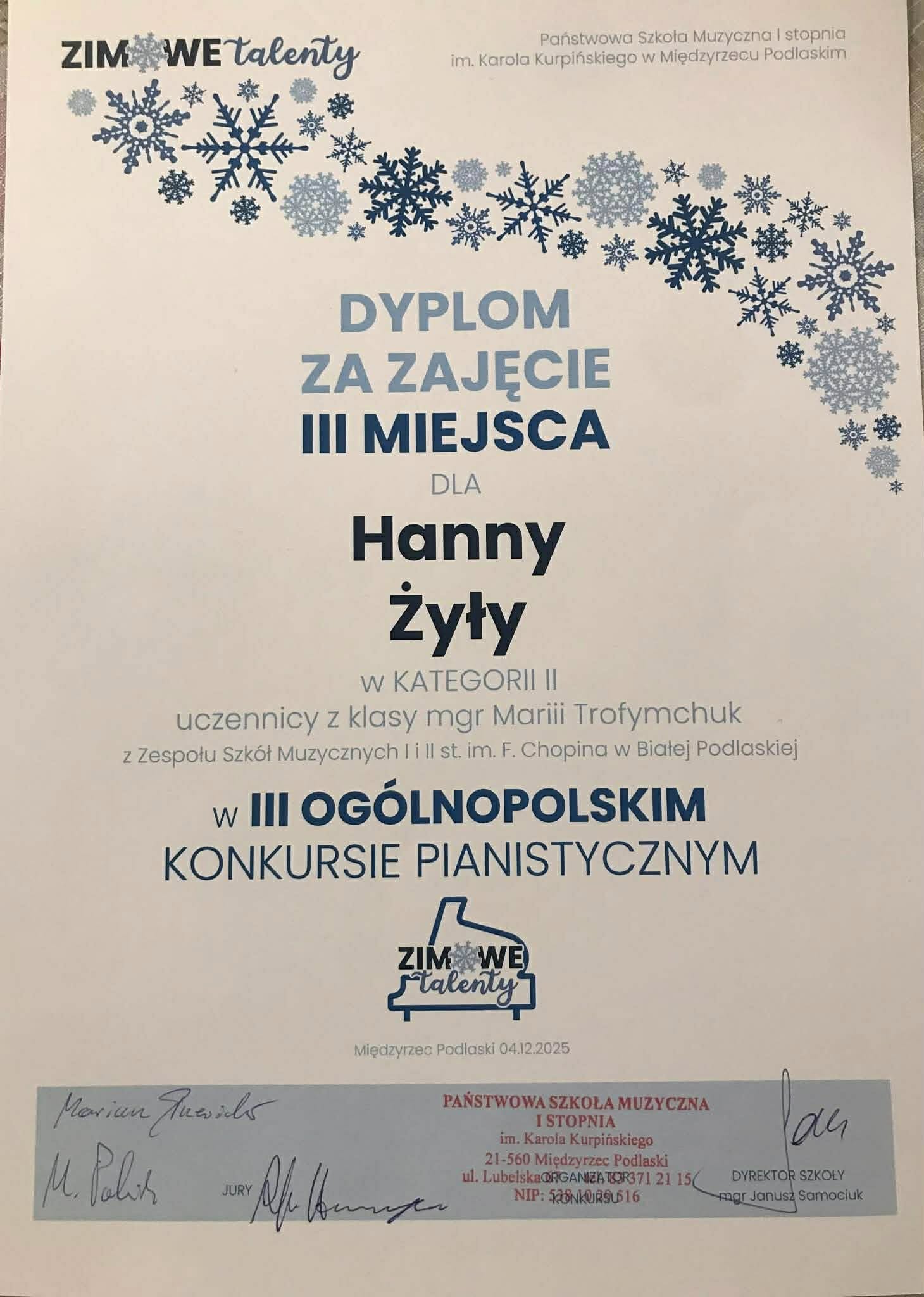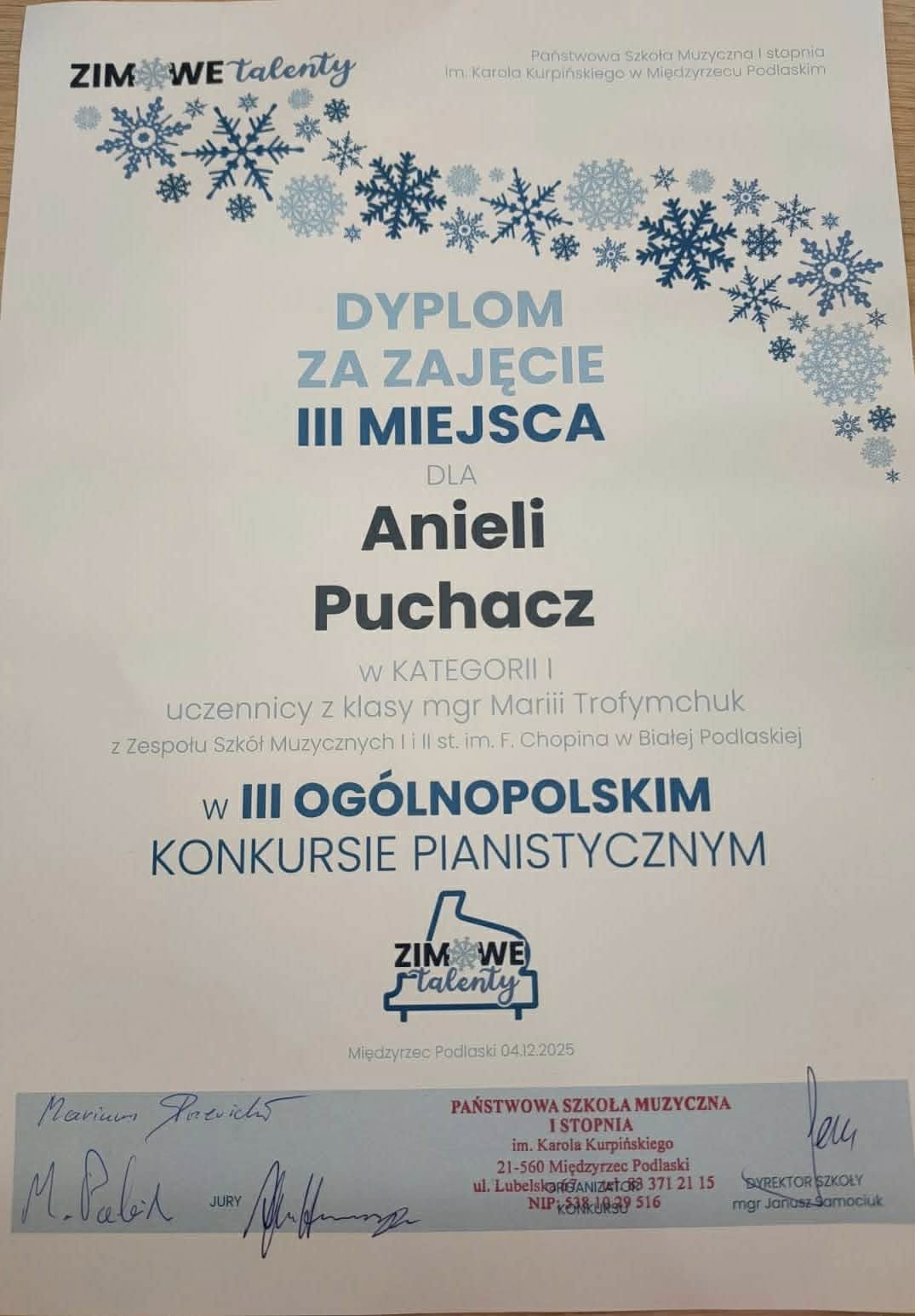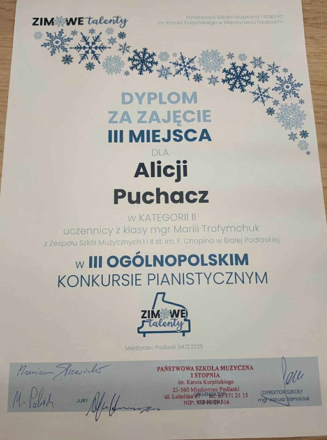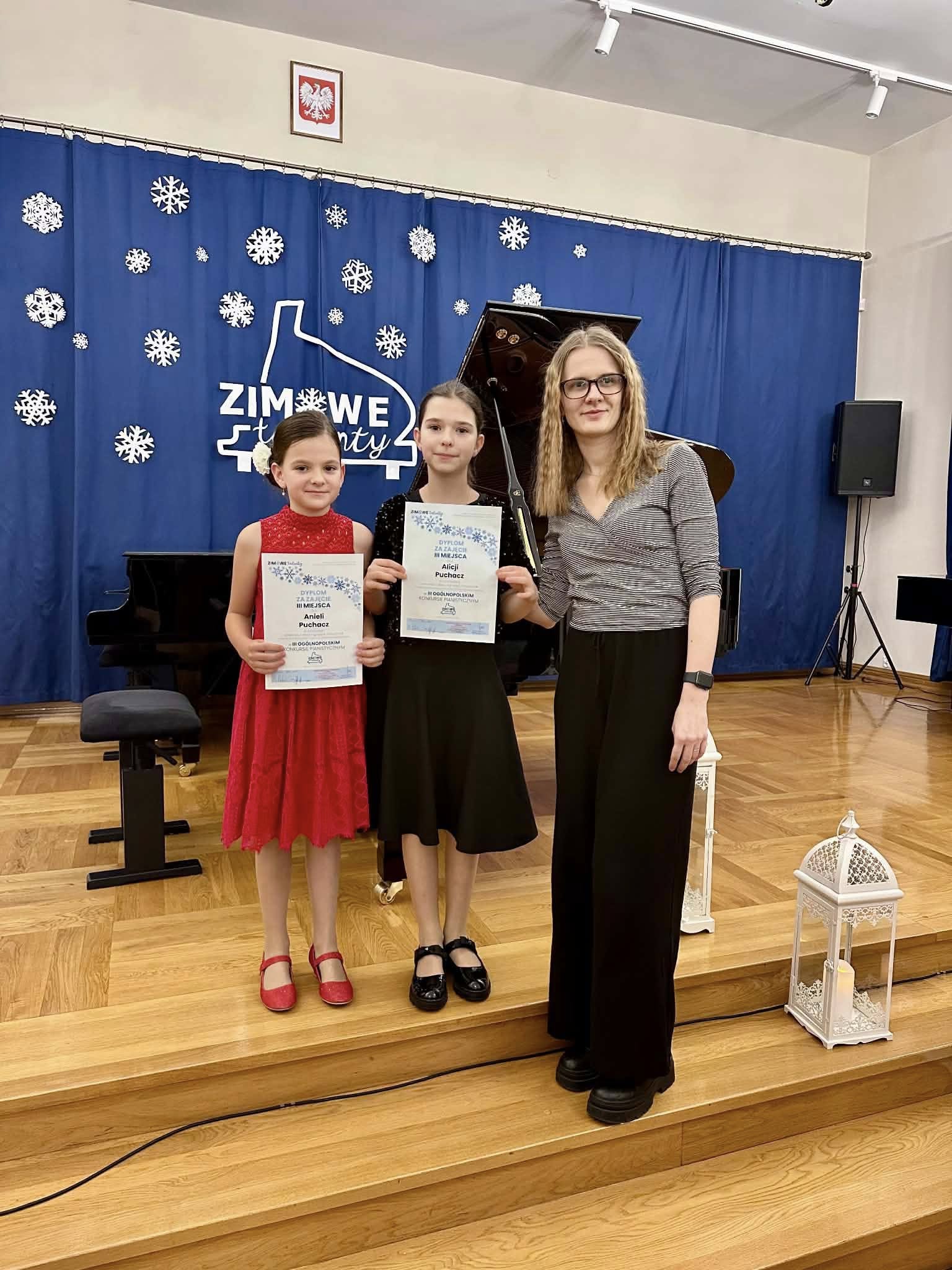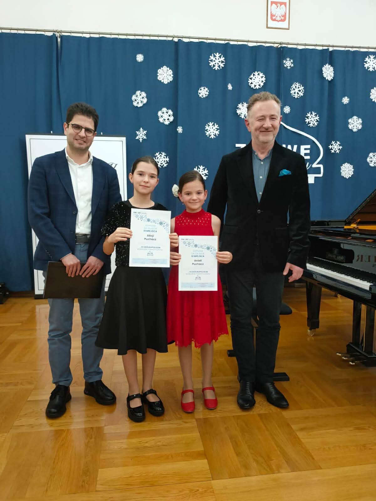 4 grudnia 2025 roku uczennice pani Marii Trofymchuk wzięły udział w III Ogólnopolskim Konkursie Pianistycznym „Zimowe Talenty” w Międzyrzecu Podlaskim, prezentując wysoki poziom przygotowania i muzycznej wrażliwości. Jesteśmy bardzo dumni z ich osiągnięć: