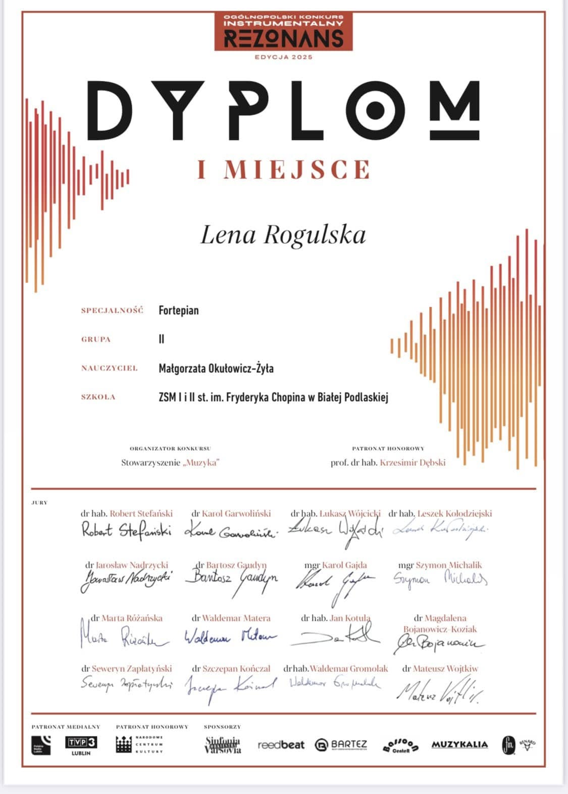 Podczas Ogólnopolskiego Konkursu Instrumentalnego "Rezonans" w Lublinie, uczennica pani Małgorzaty Okułowicz-Żyły, Lena Rogulska zdobyła I miejsce.