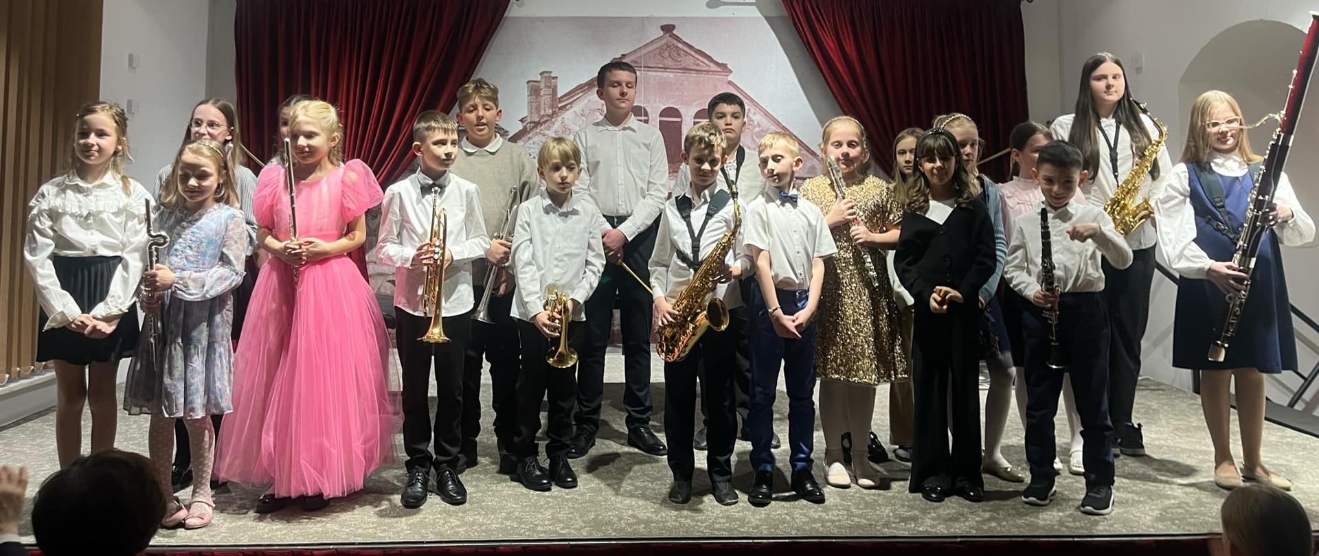 saksofoniści, fagocistka, klarneciści, flecistki, perkusiści, trębacze oraz skrzypaczki