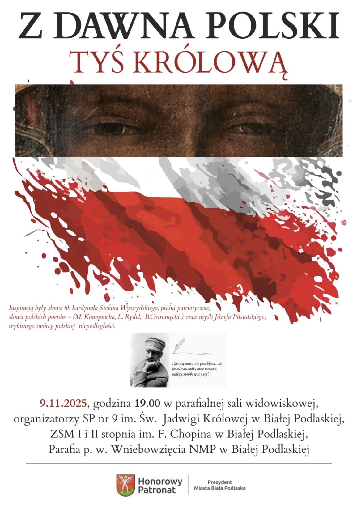 Serdecznie zapraszamy na uroczyste obchody Narodowego Święta Niepodległości pod hasłem „Z dawna Polski Tyś Królową” , które odbędą się dnia 9 listopada 2025 roku o godzinie 19.00 w parafialnej sali widowiskowej przy Parafii Wniebowzięcia NMP w Białej Podlaskiej.