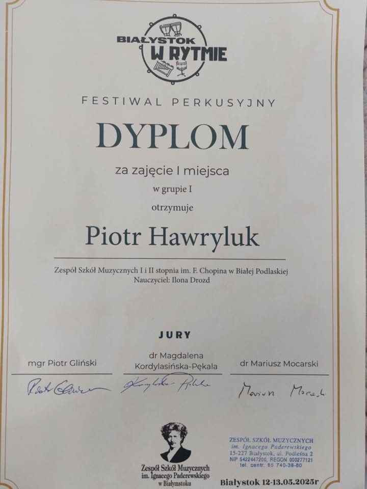 w dniach 12-13 maja w Zespole Szkół Muzycznych im. I. J. Paderewskiego w Białymstoku odbył się Festiwal Perkusyjny "Białystok w rytmie". Uczeń naszej szkoły PIOTR HAWRYLUK uczący się w klasie pani ILONY DROZD otrzymał na nim dyplom za zajęcie I miejsca w I grupie!