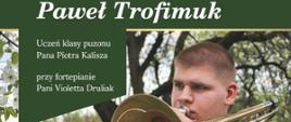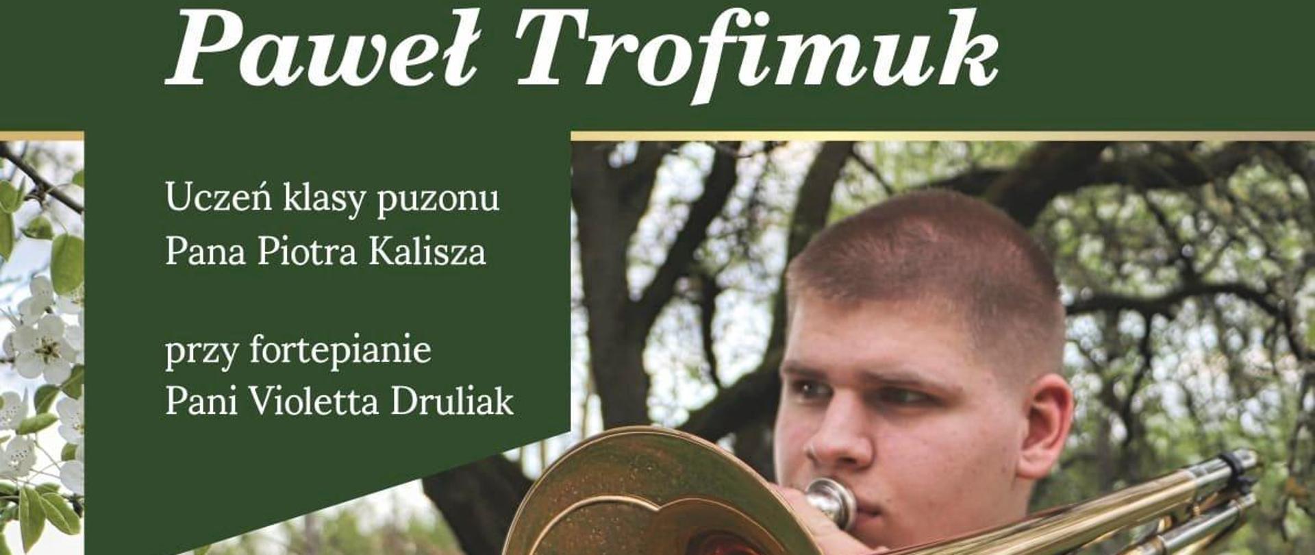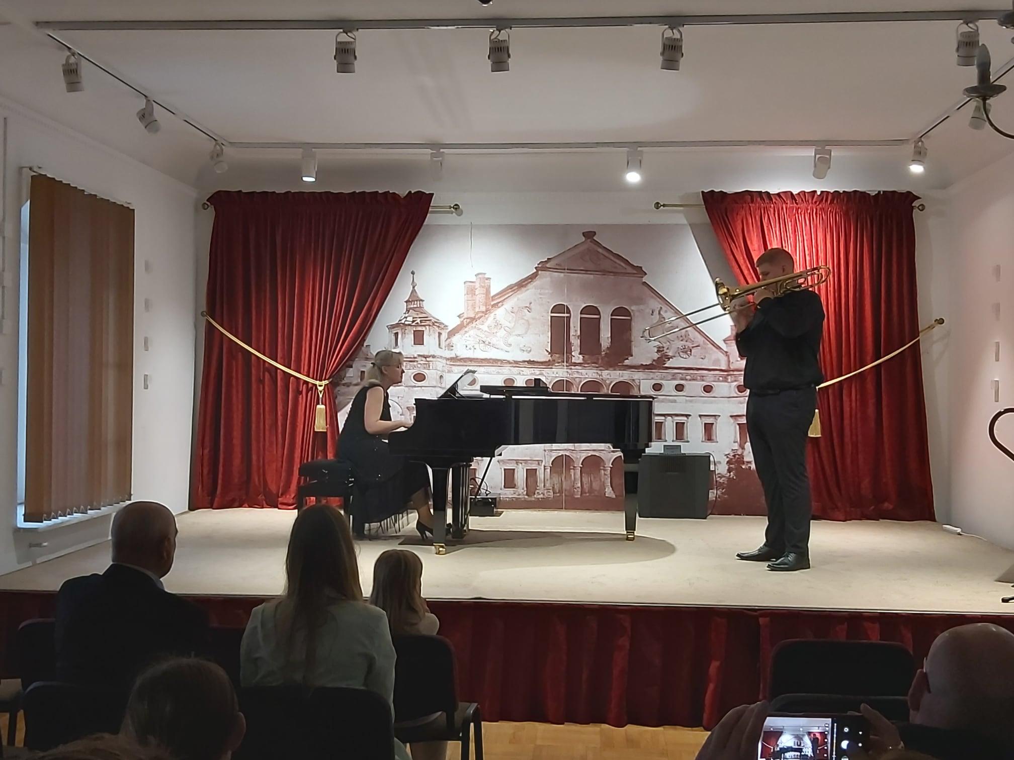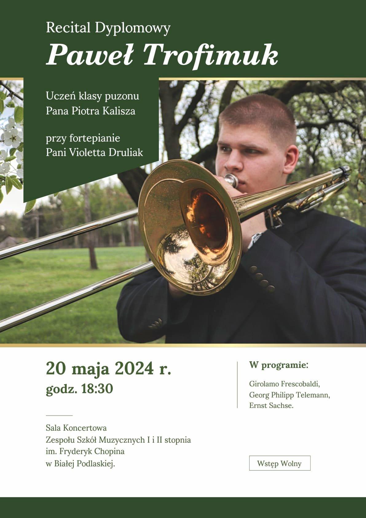 Dnia 20.05.2024 r. odbył się pierwszy egzamin dyplomowy. Recital zagrał Paweł Trofimuk puzonista z klasy pana profesora Piotra Kalisza. Przy fortepianie dyplomantowi towarzyszyła pani profesor Violeta Druliak.