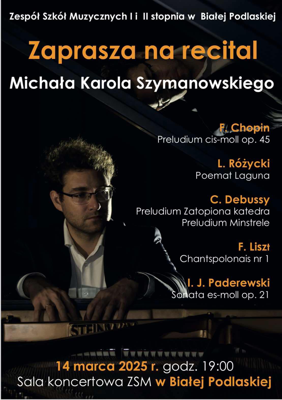 🎹🎹🎹Przedwczoraj wieczorem w sali koncertowej Zespół Szkół Muzycznych I i II stopnia im. Fr. Chopina w Białej Podlaskiej odbył się niezwykły recital fortepianowy Michała Karola Szymanowskiego — pianisty, którego kunszt i głęboka wrażliwość artystyczna przyciągnęły bialską publiczność. Program wieczoru obejmował dzieła wielkich mistrzów, od Fryderyka Chopina po Ignacego Jana Paderewskiego, ukazując wszechstronność i niezwykłe umiejętności artysty.