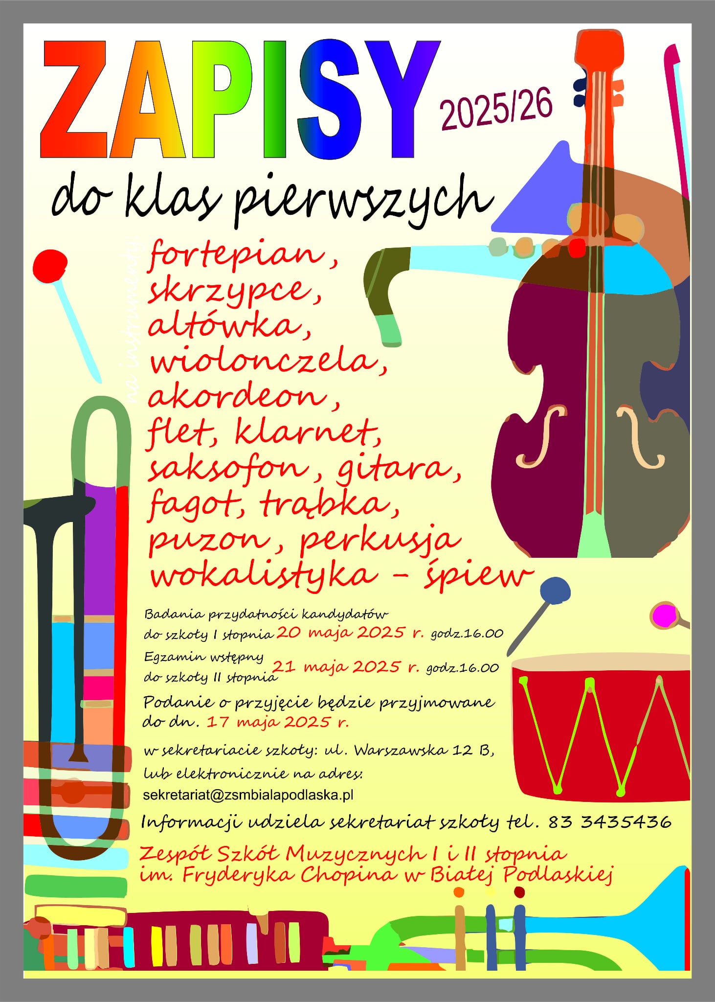 Zespół Szkół Muzycznych I i II st. im. F. Chopina w Białej Podlaskiej ogłasza zapisy na Rok Szkolny 2025/2026 do następujących klas: skrzypce, altówka, wiolonczela, gitara, fortepian, akordeon, flet, klarnet, saksofon, fagot, trąbka, puzon, perkusja, wokalistyka-śpiew.