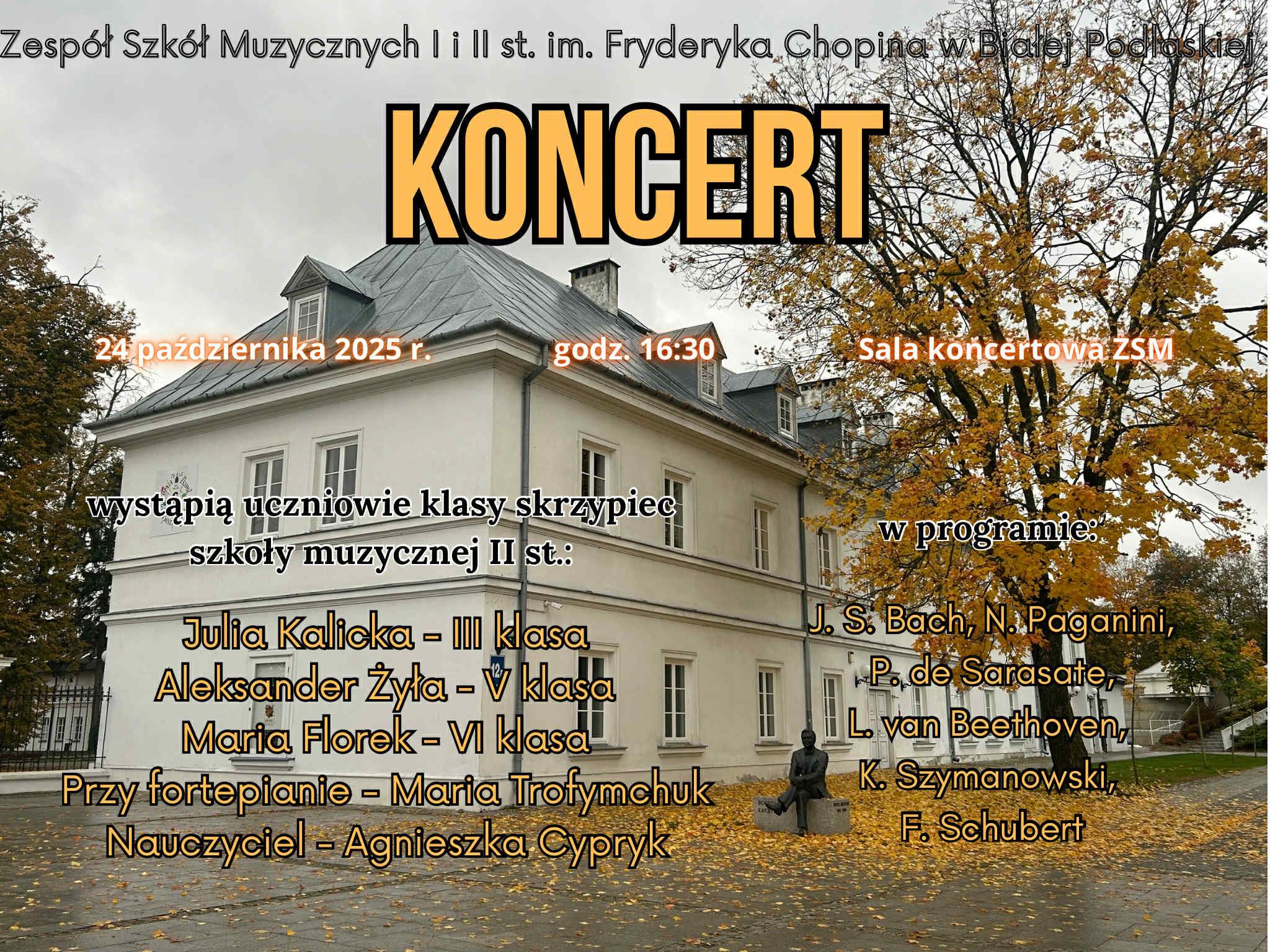 Dnia 24 października 2025 roku w Zespole Szkół Muzycznych I i II stopnia im. F. Chopina w Białej Podlaskiej odbył się koncert uczniów klasy skrzypiec pani Agnieszki Cypryk. Wystąpili: Julia Kalicka, Maria Florek oraz Aleksander Żyła.