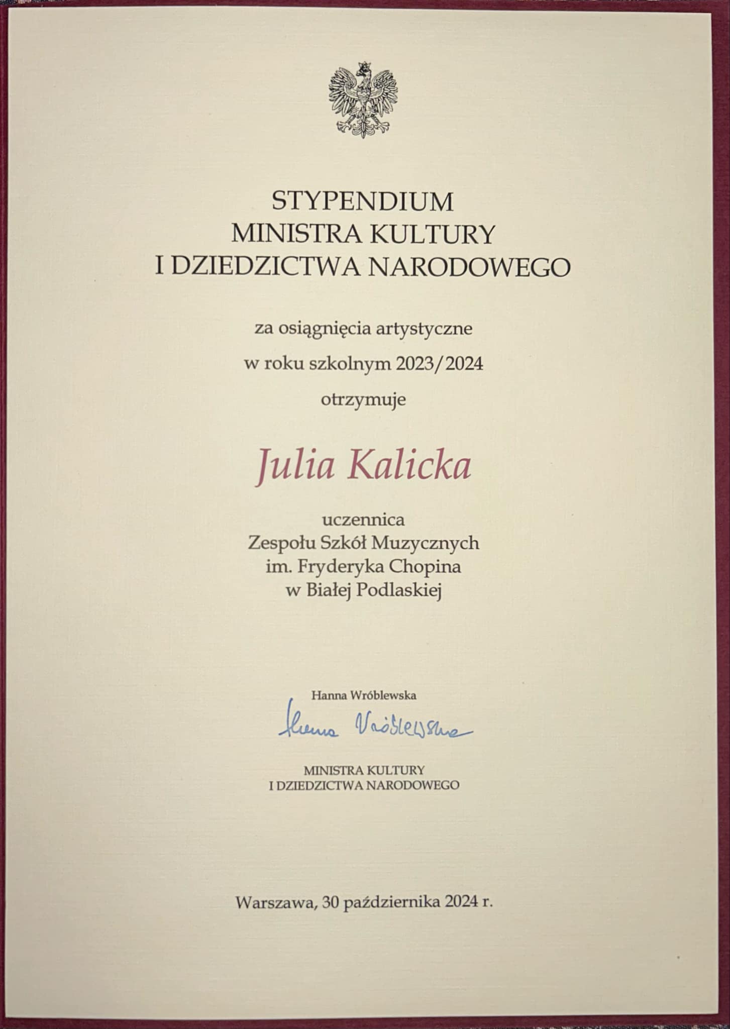 Szanowni Państwo. Z wielką dumą i radością informujemy, że uczennica naszej Szkoły JULIA KALICKA, pracująca pod opieką pani Agnieszki Cypryk-Chmielewskiej otrzymała stypendium Ministra Kultury i Dziedzictwa Narodowego za wybitne osiągnięcia artystyczne w roku 2023/2024.