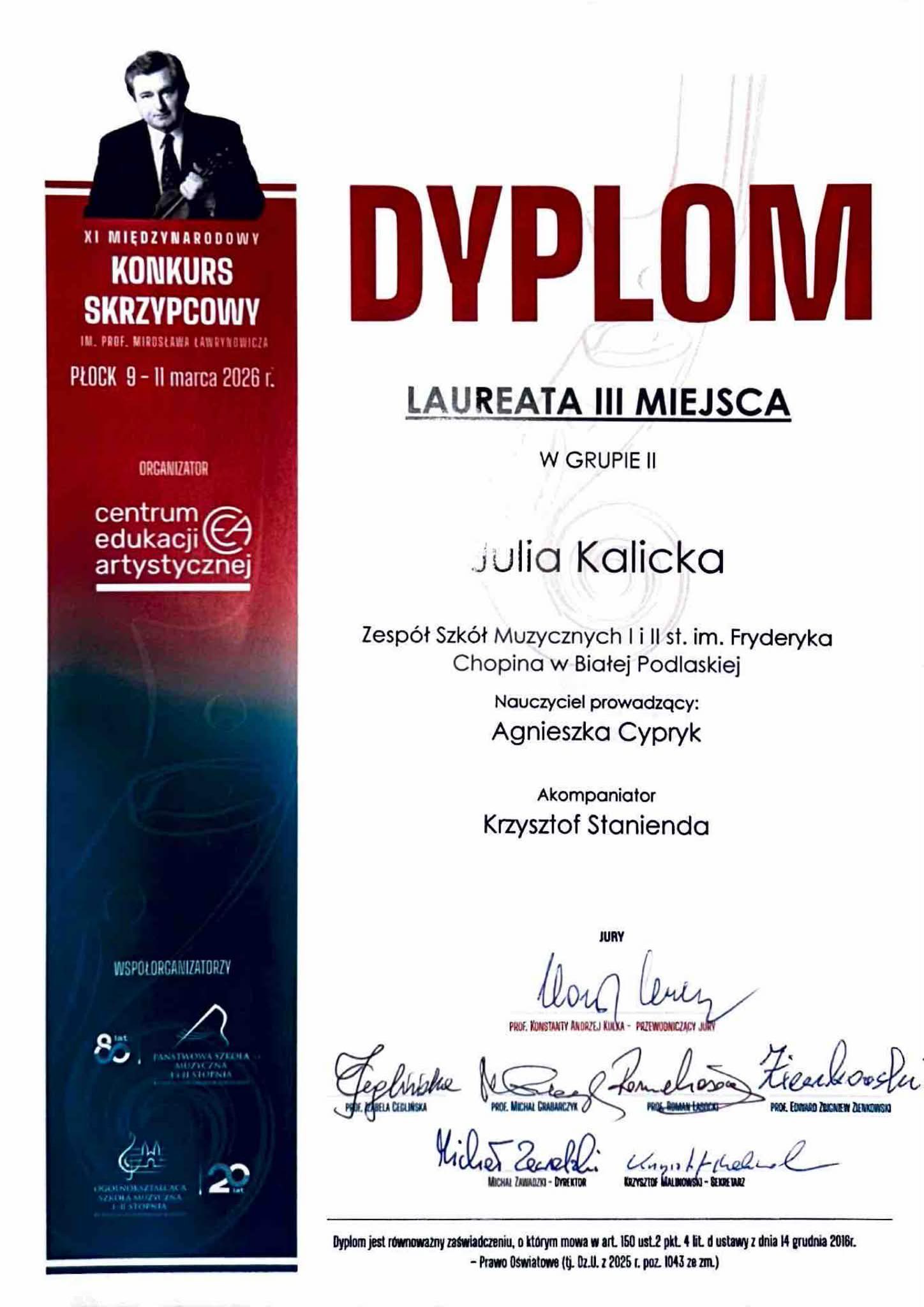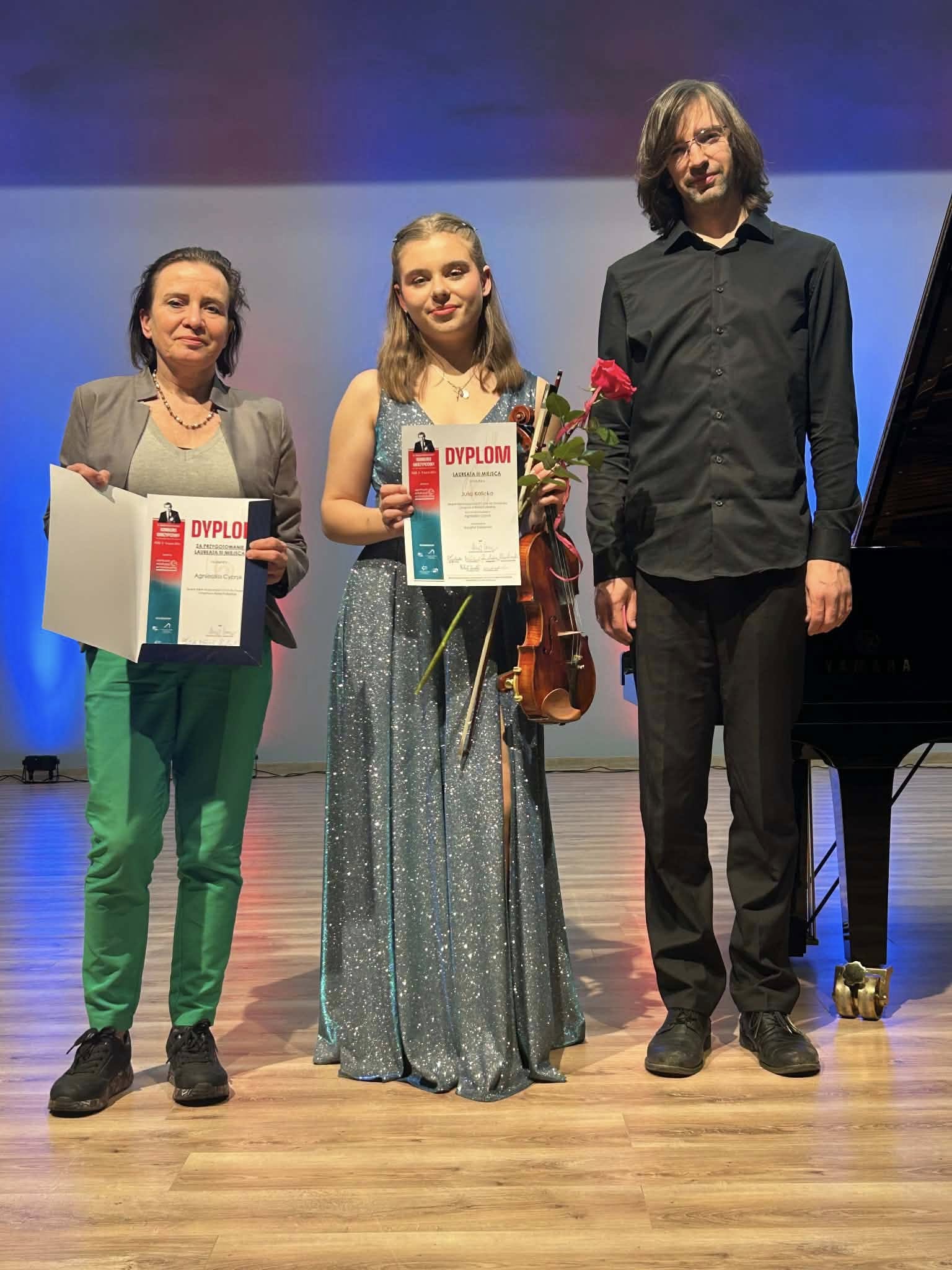 Pani prof. Agnieszka Cypryk została uhonorowana dyplomem za wyróżniające przygotowanie laureatki. Podczas konkursowych występów Julii przy fortepianie akompaniował pan Krzysztof Stanienda.