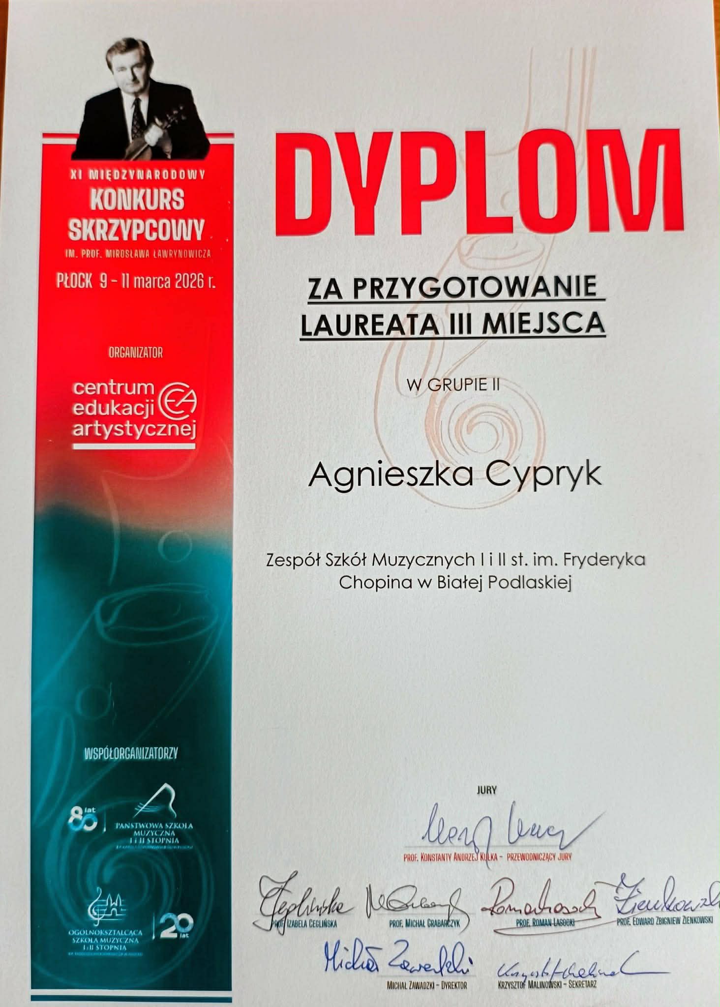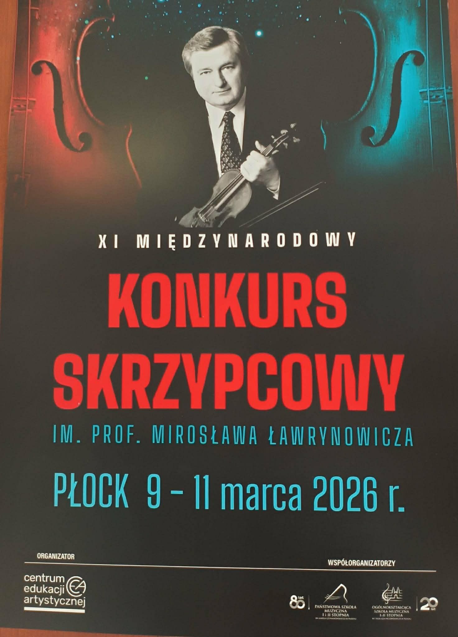 W dniach 9-11 marca w Płocku odbył się XI Międzynarodowy Konkurs Skrzypcowy im. prof. Mirosława Ławrynowicza - prestiżowe, dwuetapowe wydarzenie organizowane przez Centrum Edukacji Artystycznej. W jury konkursu zasiedli wybitni polscy pedagodzy i artyści, m.in. Konstanty Andrzej Kulka, Michał Grabarczyk, Izabela Ceglińska, Edward Zbigniew Zienkowski oraz Roman Lasocki. Z ogromną radością informujemy, że uczennica naszej szkoły, Julia Kalicka, kształcąca się w klasie pani Agnieszki Cypryk, zdobyła III nagrodę.
