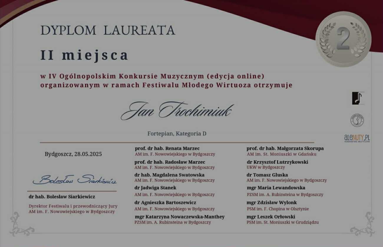 Dnia 28.05.2025 r. odbył się w Bydgoszczy Ogólnopolski "Festiwal Młodego Wirtuoza" (edycja on-line), w którym uczniowie pani Violety Druliak zdobyli nagrody: