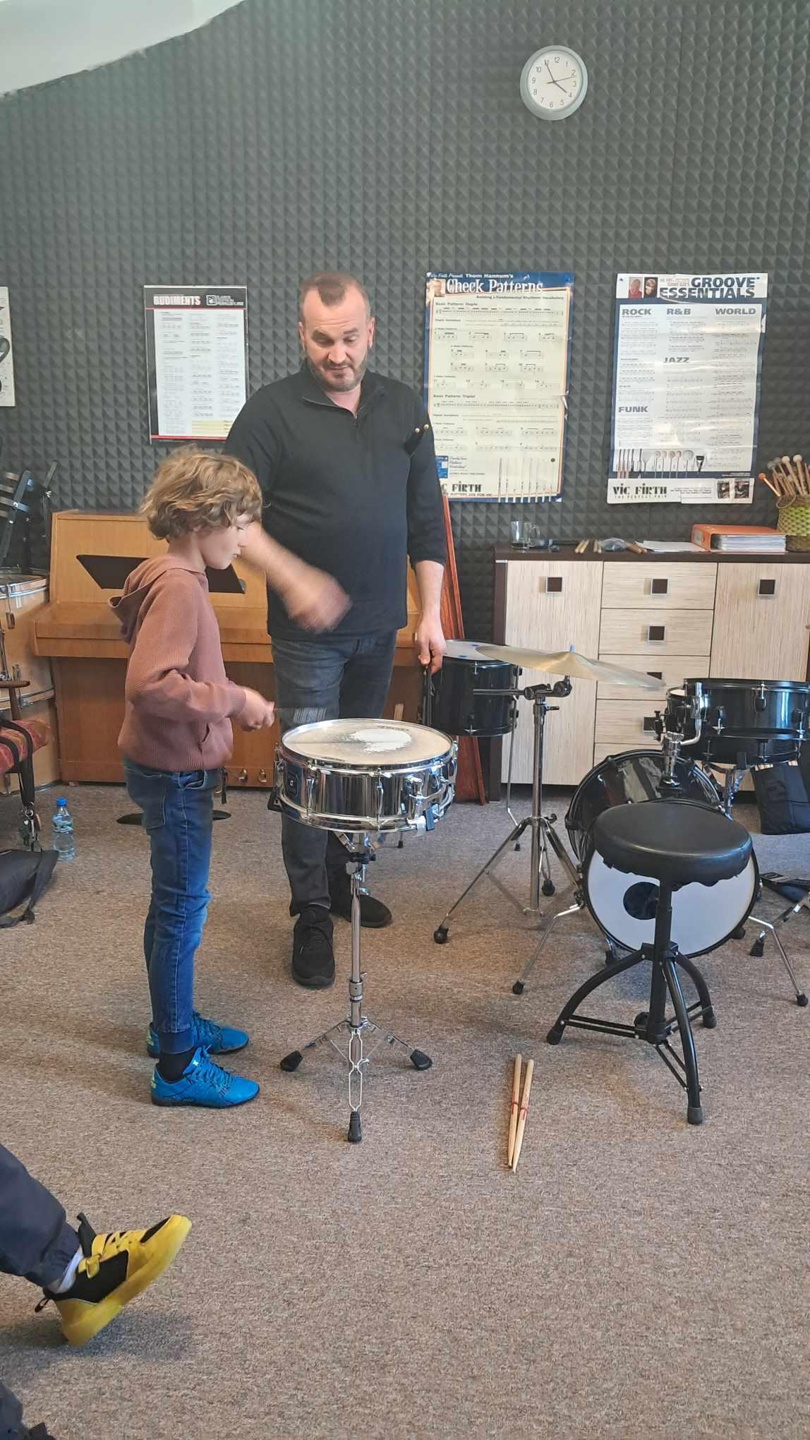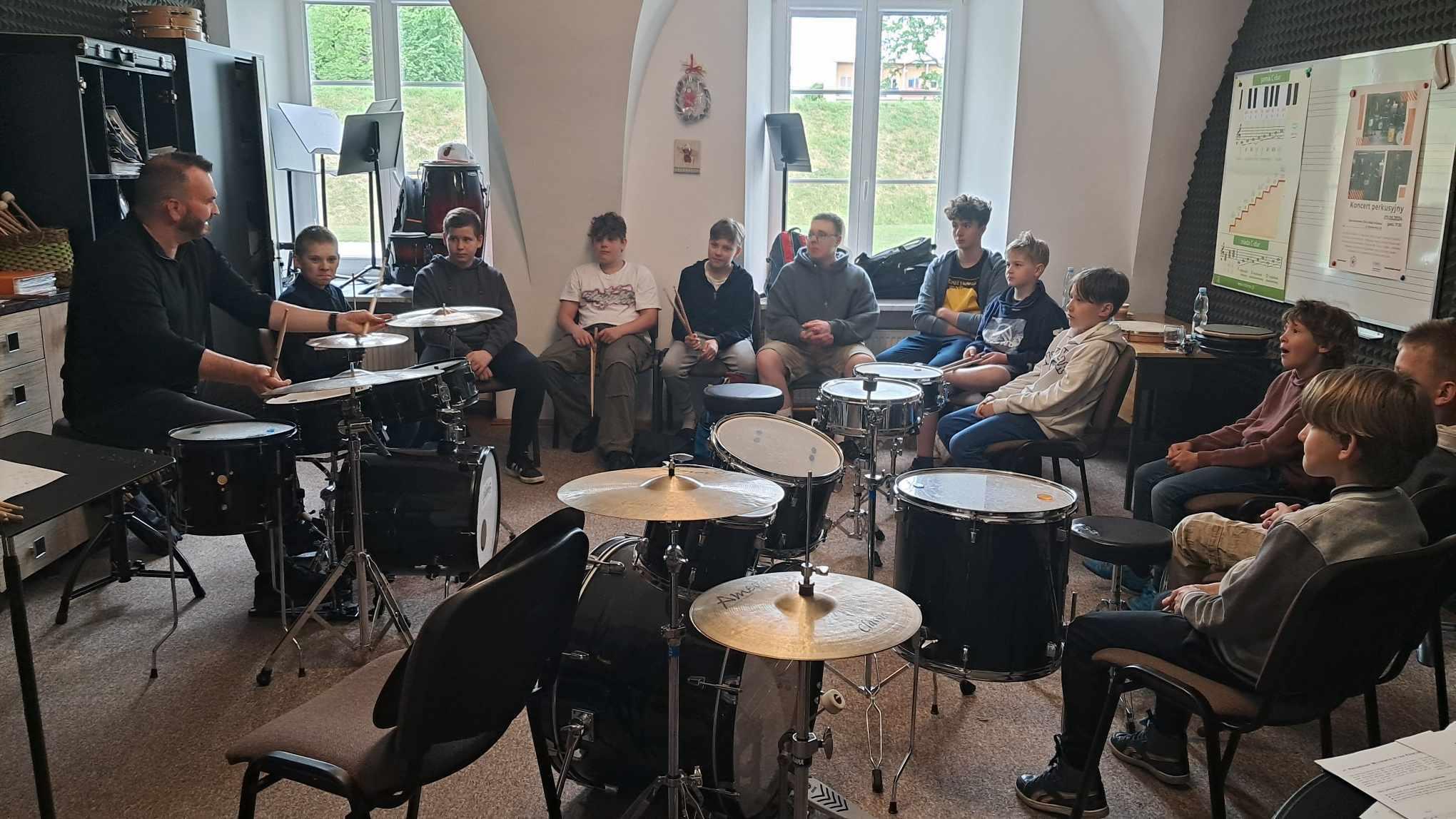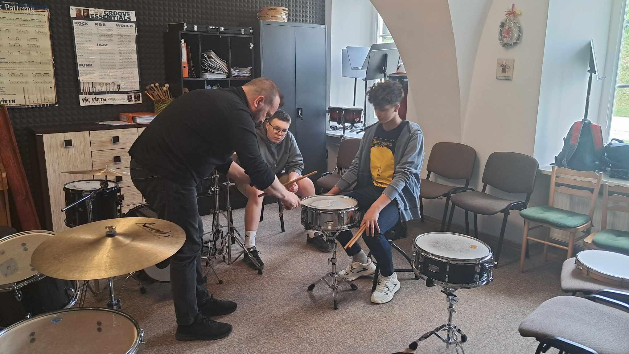 Uczniowie mieli okazję zgłębić tajniki gry na werblu oraz podszkolić się w grze na zestawie perkusyjnym.