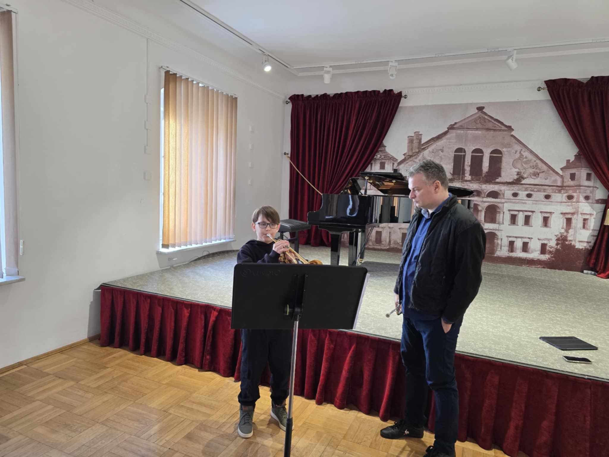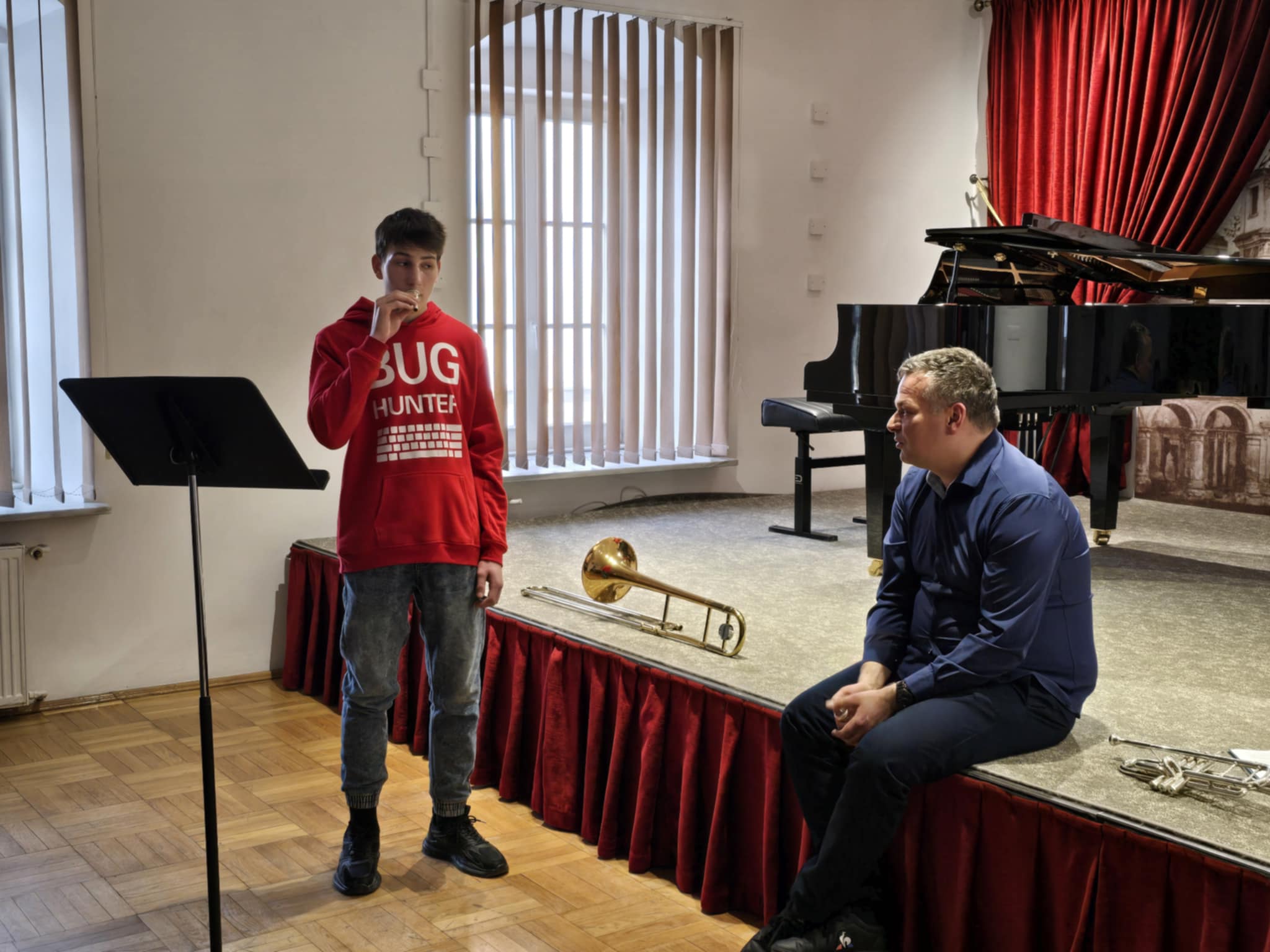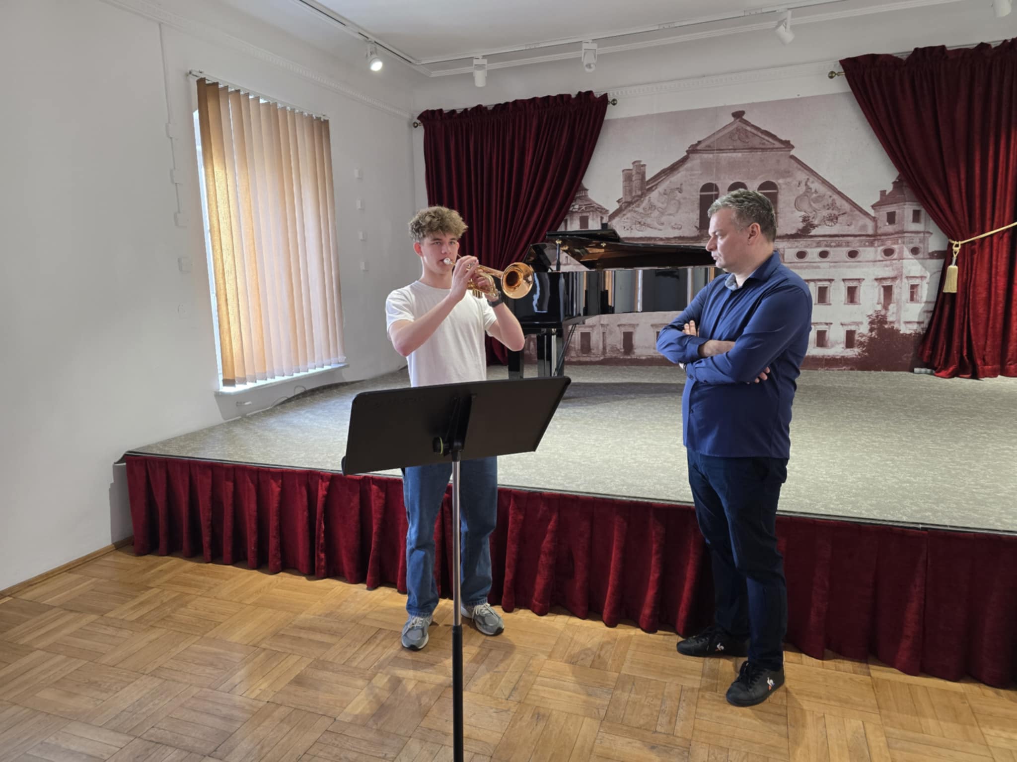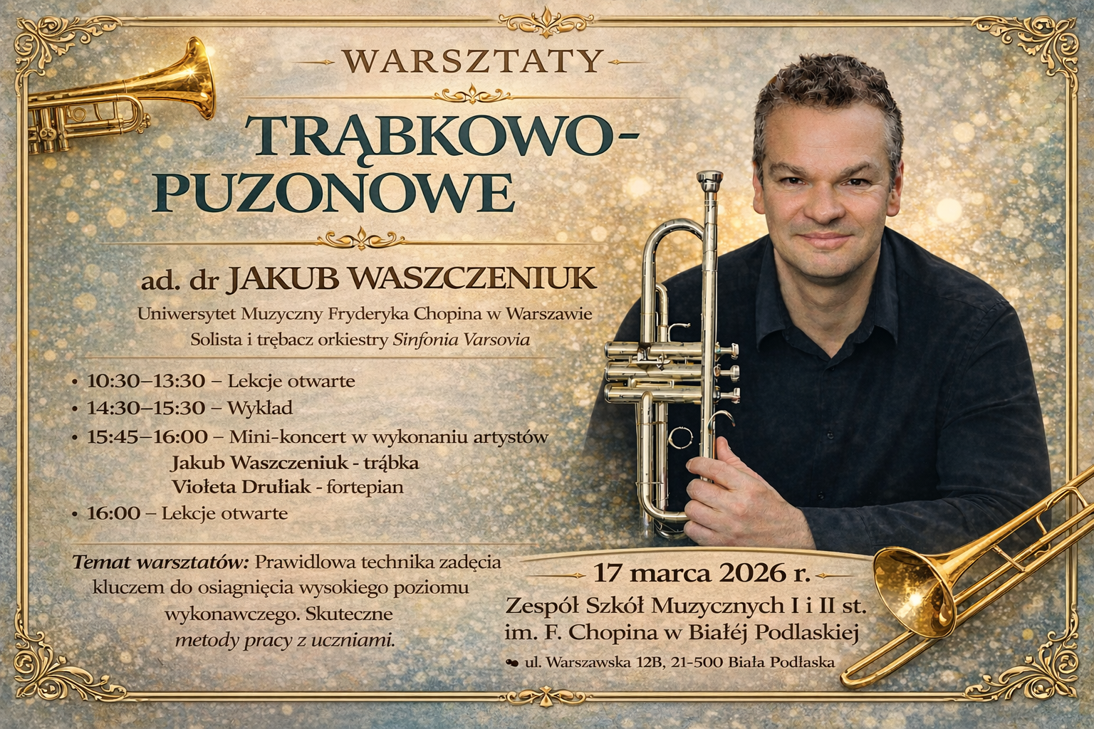 W dniu 17 marca 2026 roku w naszej szkole odbyły się warsztaty trąbkowo-puzonowe, które poprowadził ceniony instrumentalista i pedagog - pan ad. dr Jakub Waszczeniuk. Wydarzenie zgromadziło uczniów klas trąbki i puzonu prowadzonych przez pana Piotra Kalisza z Zespołu Szkół Muzycznych I i II stopnia im. F. Chopina w Białej Podlaskiej oraz Państwowej Szkoły Muzycznej I stopnia im. S. Moniuszki w Łosicach.