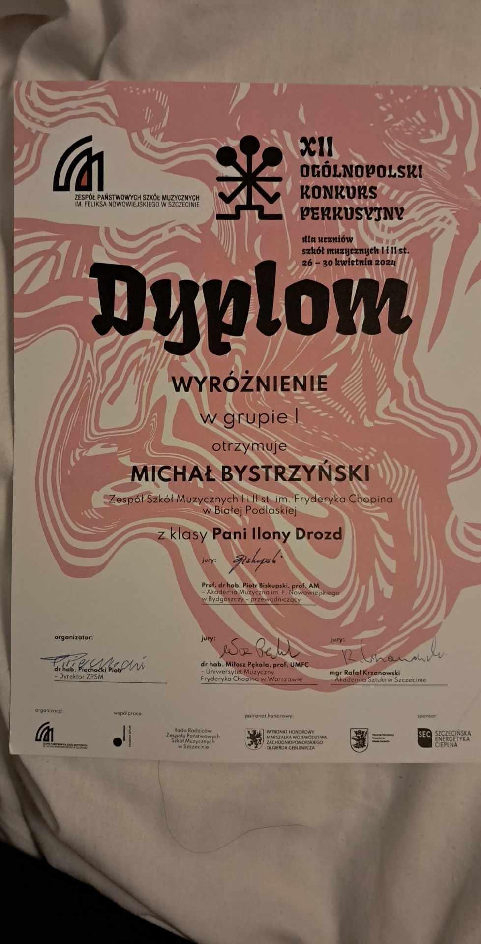 🥁🪘Uczeń klasy perkusji pani profesor Ilony Drozd Michał Bystrzyński zdobył wyróżnienie w grupie I na XII Ogólnopolskim Konkursie Perkusyjnym w Szczecinie.