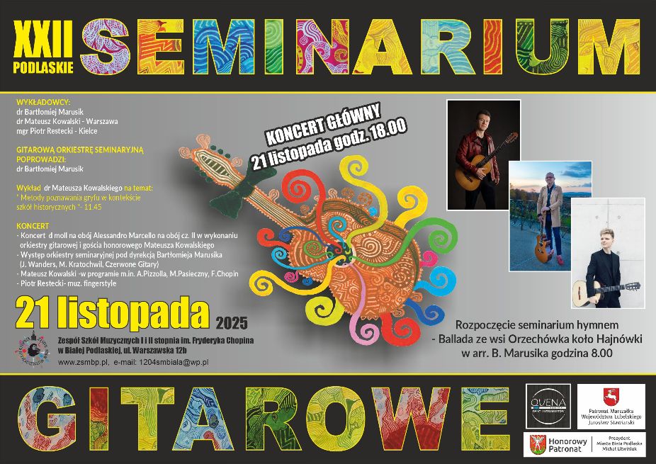 Zespół Szkół Muzycznych I i II stopnia im. Fryderyka Chopina w Białej Podlaskiej serdecznie zaprasza na XXII Podlaskie Seminarium Gitarowe, które odbędzie się 21 listopada 2025 roku w siedzibie szkoły przy ul. Warszawskiej 12B w Białej Podlaskiej.