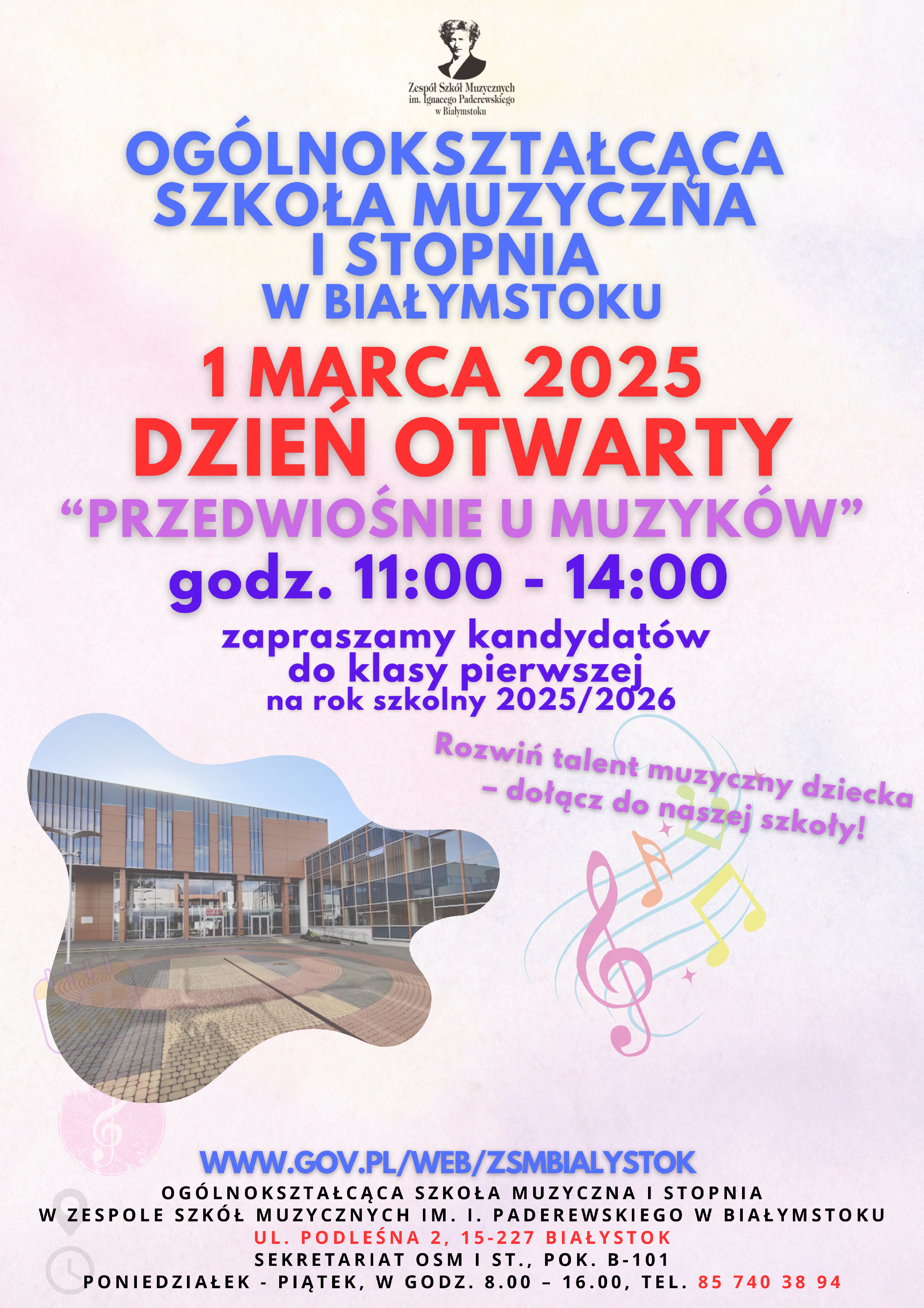 Zespół Szkół Muzycznych im. Ignacego Paderewskiego w Białymstoku zaprasza na Dzień Otwarty Ogólnokształcącej Szkoły Muzycznej I stopnia!