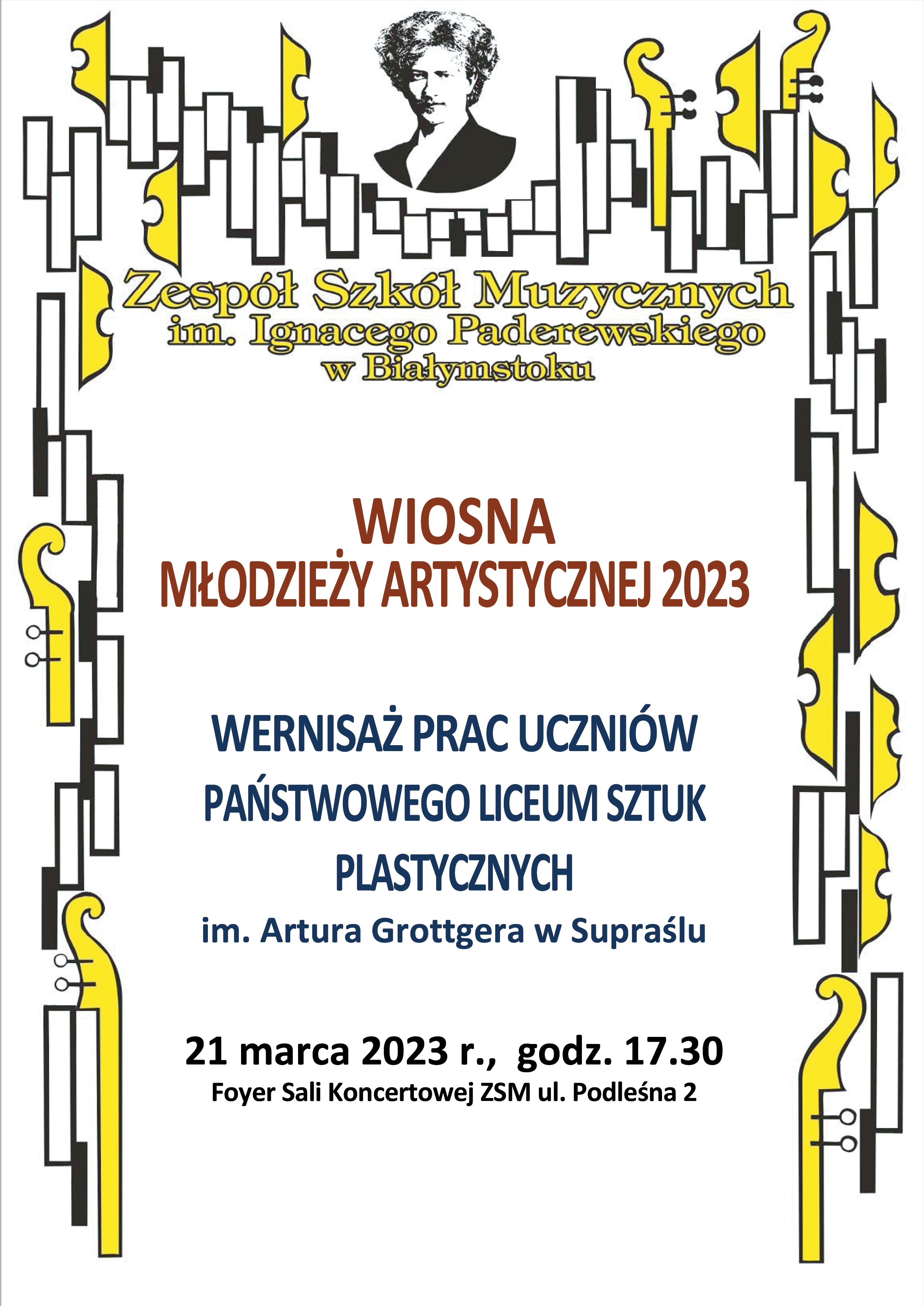 Z przyjemnością zapraszamy na koncert inaugurujący tradycyjny cykl koncertów Wiosny Młodzieży Artystycznej, który odbędzie się w najbliższą sobotę o godzinie 18:00 w auli naszej szkoły. Będzie on połączony z wernisażem prac plastycznych uczniów Państwowego Liceum Sztuk Plastycznych im. A. Grottgera z Supraśla.