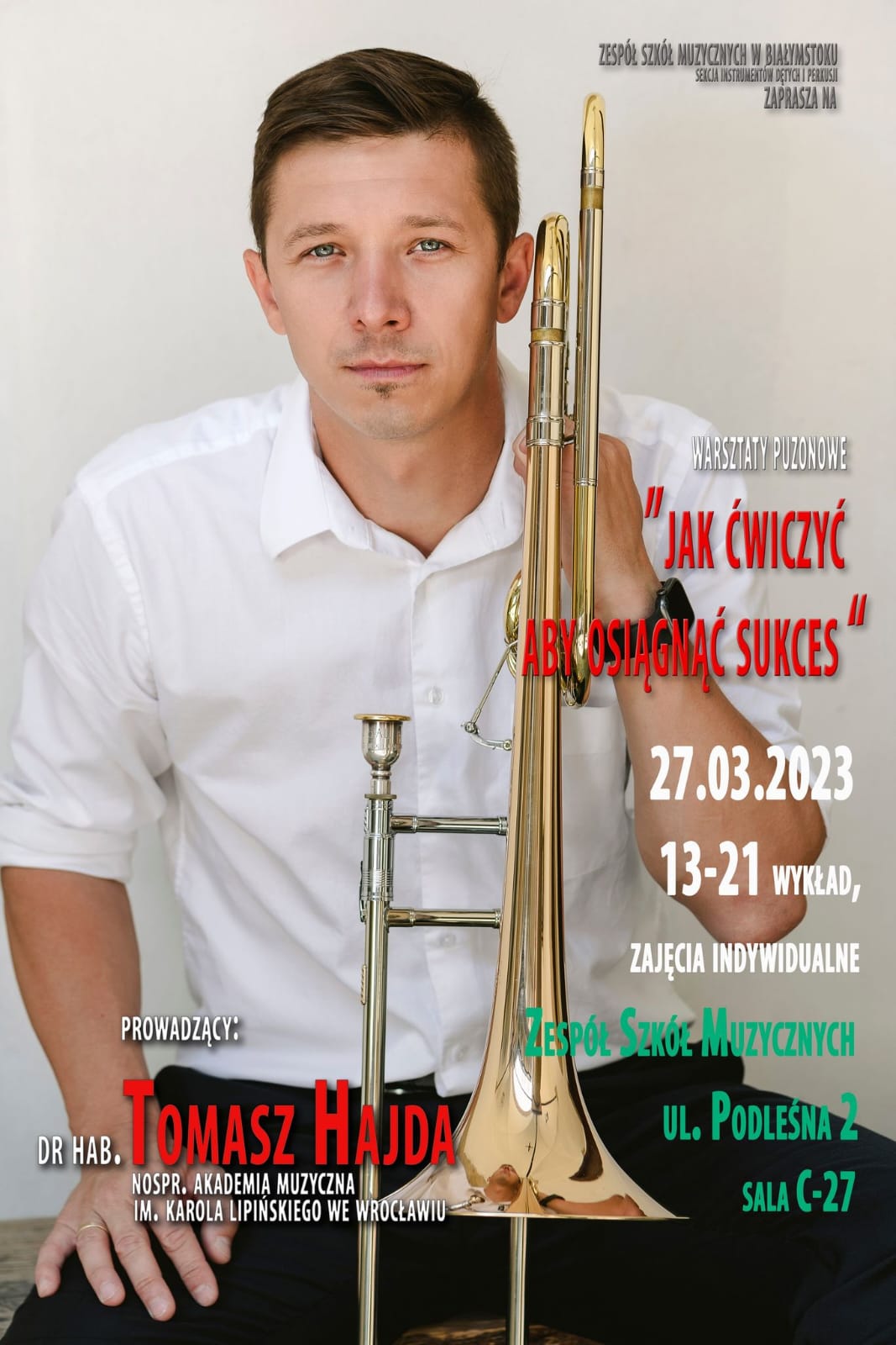 Serdecznie zapraszamy na seminarium puzonowe, poprowadzone przez jednego z najlepszych polskich puzonistów - dra hab. Tomasza Hajdę, pierwszego puzonistę Narodowej Orkiestry Symfonicznej Polskiego Radia w Katowicach oraz wykładowcę Akademii Muzycznej im. K. Lipińskiego we Wrocławiu.