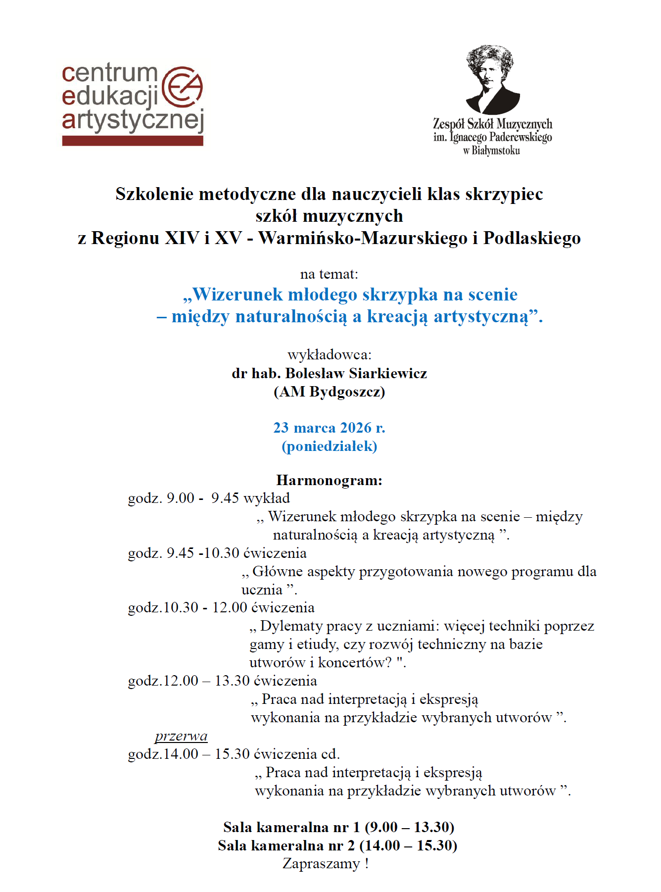 23 marca 2026 r. (poniedziałek) odbędzie się w Zespole Szkół Muzycznych im. Ignacego Paderewskiego w Białymstoku szkolenie metodyczne dla nauczycieli klas skrzypiec szkół muzycznych z regionu XIV i XV, które poprowadzi dr hab. Bolesław Siarkiewicz (AM Bydgoszcz).
