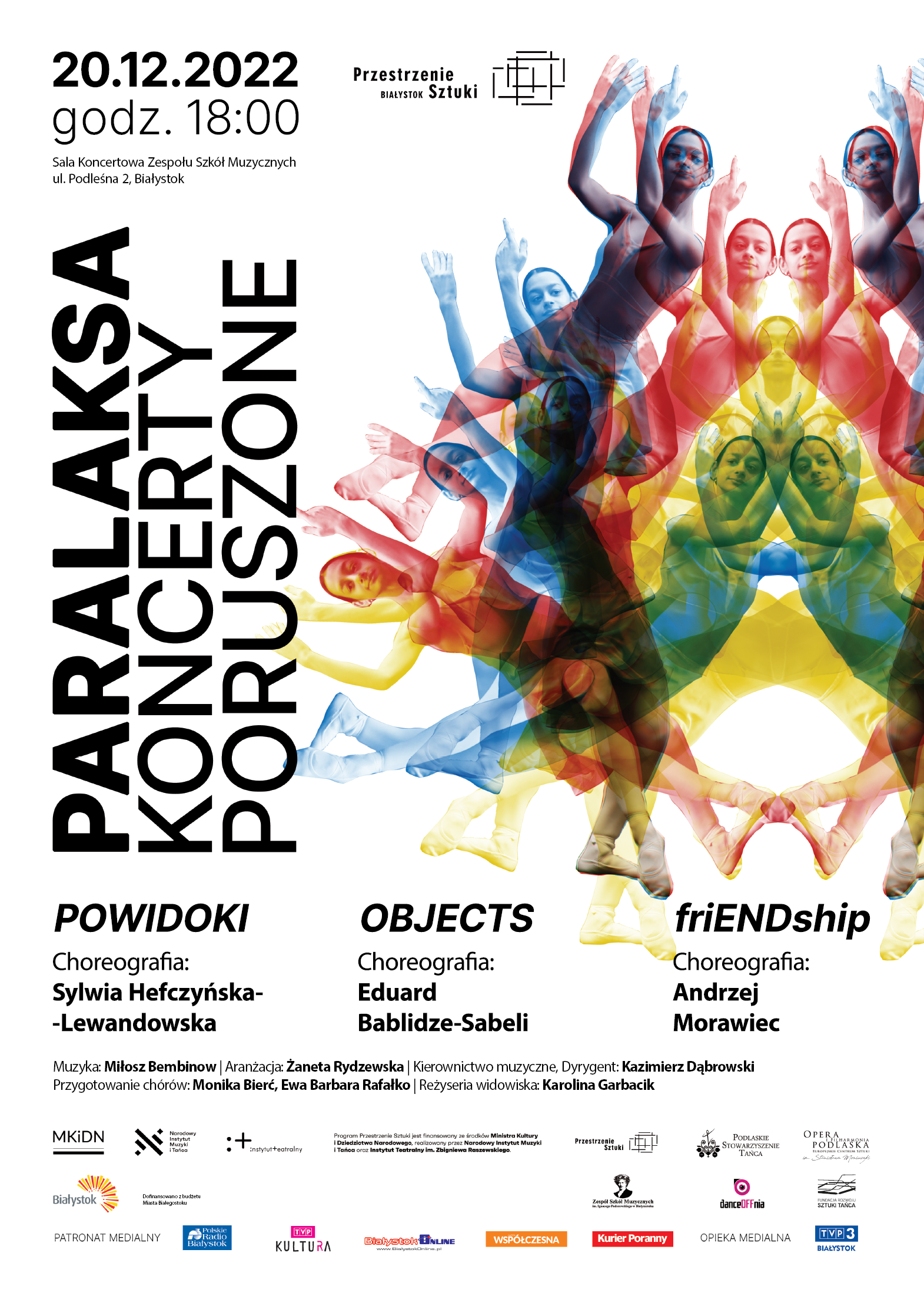 Finał i pokaz premierowy trzech choreografii ujęty w jednym wieczorze. Zapraszamy na "Paralaksa. Koncerty Poruszone" w ramach programu "Przestrzenie Sztuki Białystok". 🔘Choreografie: Andrzej Morawiec, Sylwia Hefczyńska-Lewandowska oraz Eduard Bablidze-Sabeli. 🔘Wykonanie Taneczne: uczniowie szkół baletowych i studenci wydziałów tanecznych polskich uczelni artystycznych wyłonieni w drodze konkursu otwartego. 🔘Na żywo zaśpiewa Chór Mieszany, Zespół Wokalny oraz zagra Orkiestra Symfoniczna Zespołu Szkół Muzycznych im. Ignacego Paderewskiego w Białymstoku pod dyrekcją Kazimierza Dąbrowskiego. Współorganizatorami wydarzenia są Fundacja Rozwoju Sztuki Tańca w Białymstoku oraz Zespół Szkół Muzycznych im. I. Paderewskiego w Białymstoku. Projekt dofinansowany z budżetu Miasto Białystok.