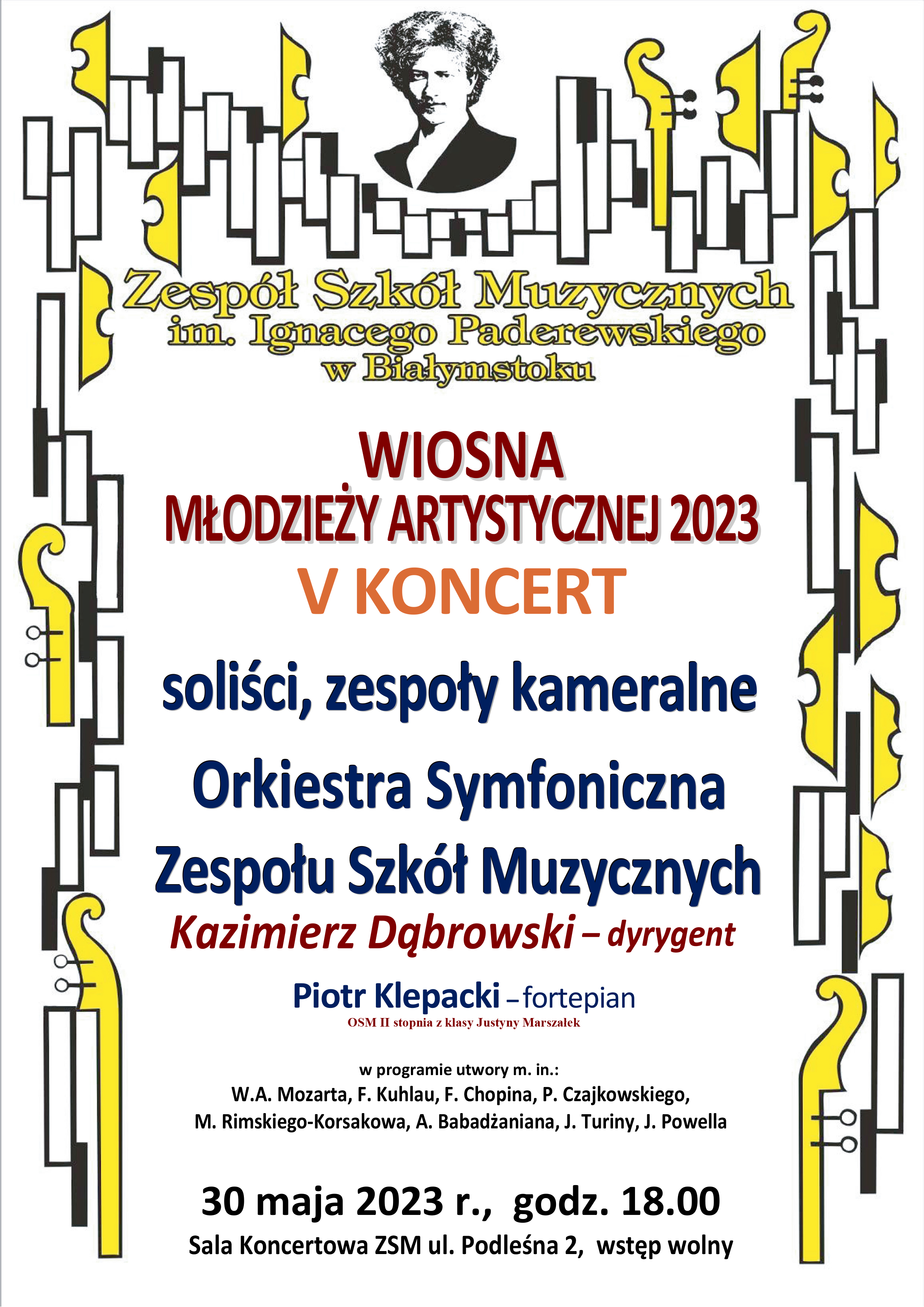 Z przyjemnością zapraszamy na piąty koncert z cyklu Wiosny Młodzieży Artystycznej, który odbędzie się we wtorek 30 maja 2023 r. o godzinie 18:00 w sali koncertowej naszej szkoły.