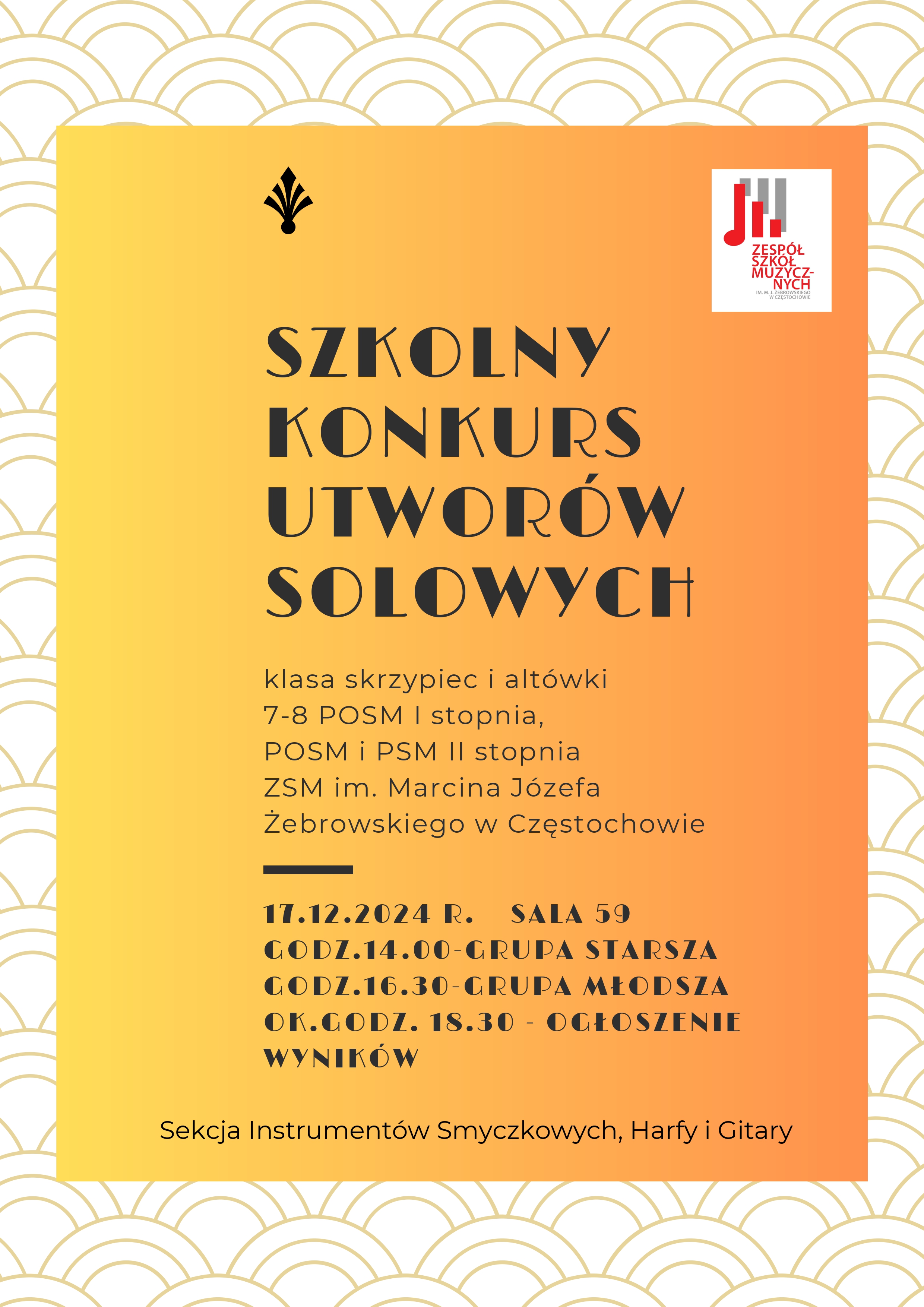 Żółto-pomarańczowe tło, na górze po prawej logo szkoły, tekst informujący o Szkolnym Konkursie Utworów Solowych, 17.12.2024 r.