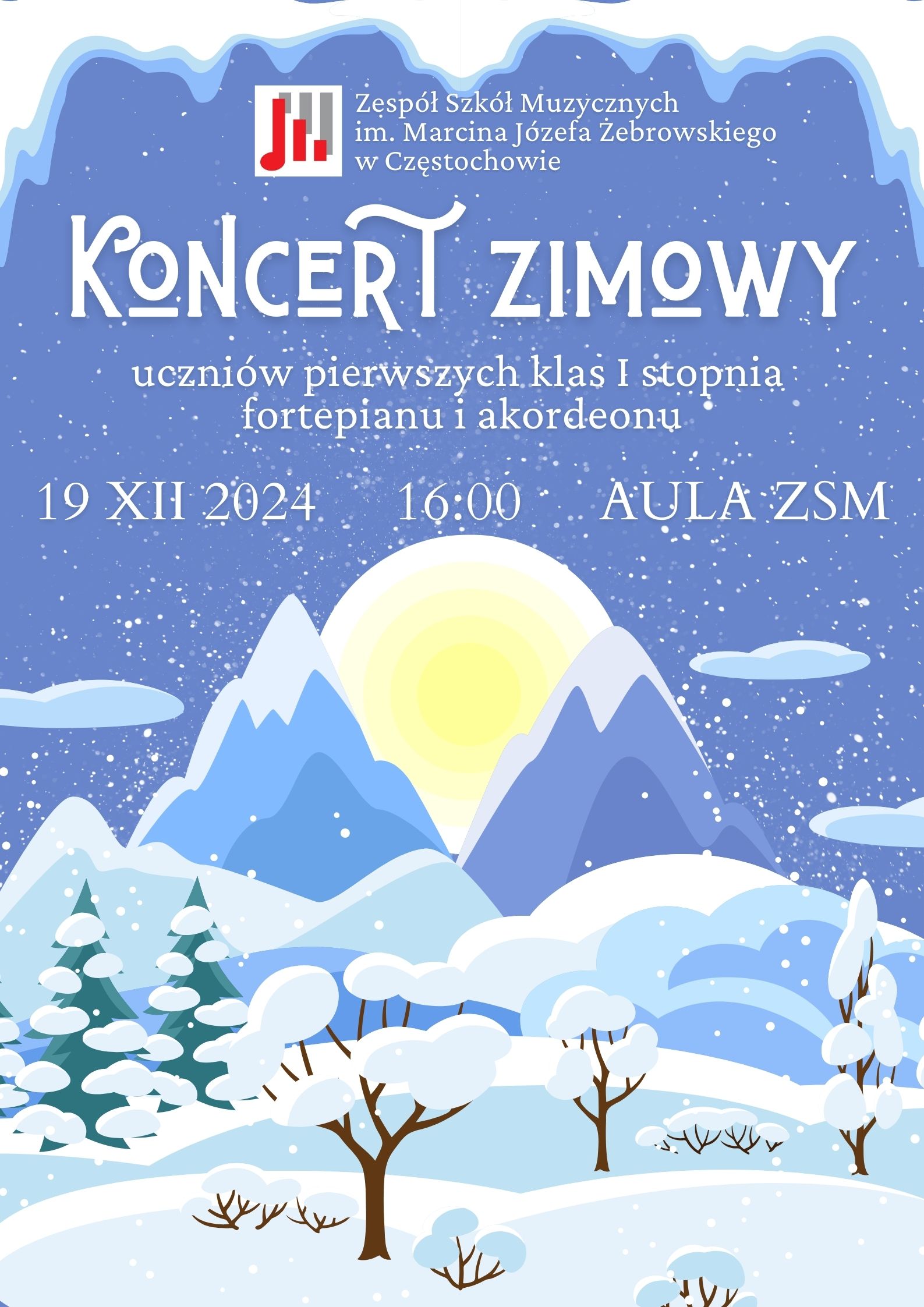 Tło grafika przedstawiająca zimę, tekst informujący o koncercie zimowym kl. I SM I st. , 19 grudnia 2024 r. o godz. 16.00