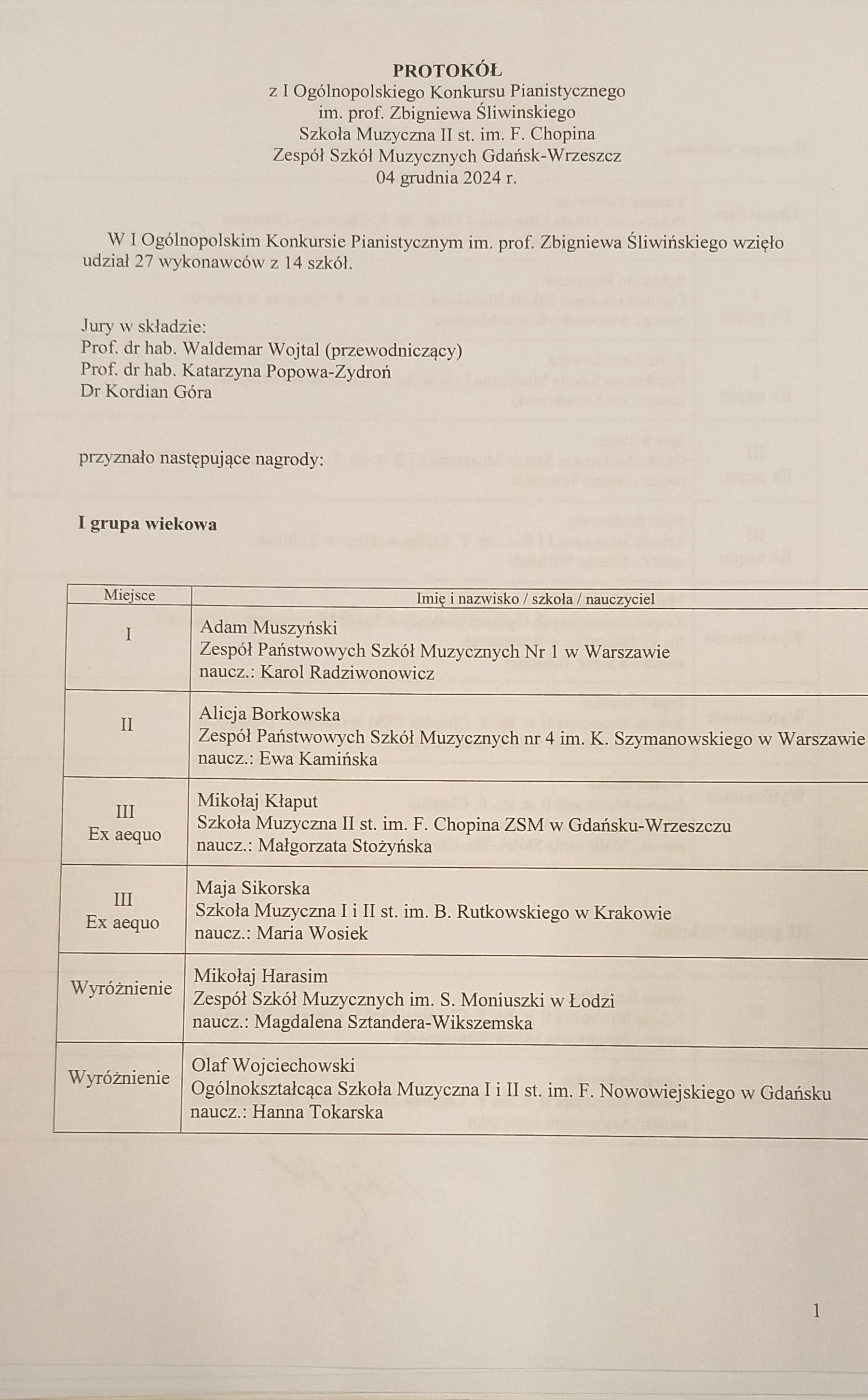 Zapraszamy do zapoznania się z wynikami I OGÓLNOPOLSKIEGO KONKURSU PIANISTYCZNEGO im. prof. ZBIGNIEWA ŚLIWIŃSKIEGO.