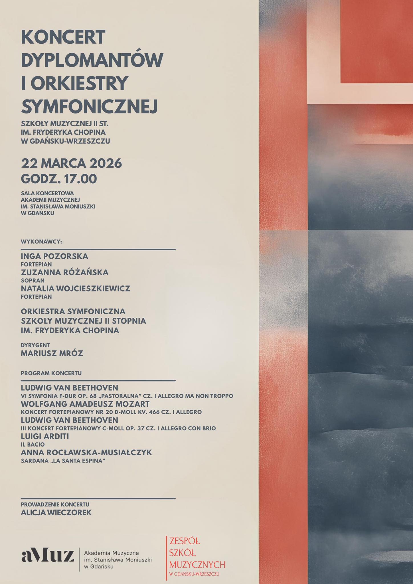 Podczas koncertu na scenie 𝐒𝐚𝐥𝐢 𝐊𝐨𝐧𝐜𝐞𝐫𝐭𝐨𝐰𝐞𝐣 𝐀𝐤𝐚𝐝𝐞𝐦𝐢𝐢 𝐌𝐮𝐳𝐲𝐜𝐳𝐧𝐞𝐣 𝐢𝐦. 𝐒𝐭𝐚𝐧𝐢𝐬ł𝐚𝐰𝐚 𝐌𝐨𝐧𝐢𝐮𝐬𝐳𝐤𝐢 𝐰 𝐆𝐝𝐚𝐧́𝐬𝐤𝐮 wystąpią dyplomanci oraz uczniowie szkoły wraz z 𝐎𝐫𝐤𝐢𝐞𝐬𝐭𝐫𝐚̨ 𝐒𝐲𝐦𝐟𝐨𝐧𝐢𝐜𝐳𝐧𝐚̨ pod batutą 𝐌𝐚𝐫𝐢𝐮𝐬𝐳𝐚 𝐌𝐫𝐨𝐳𝐚.
