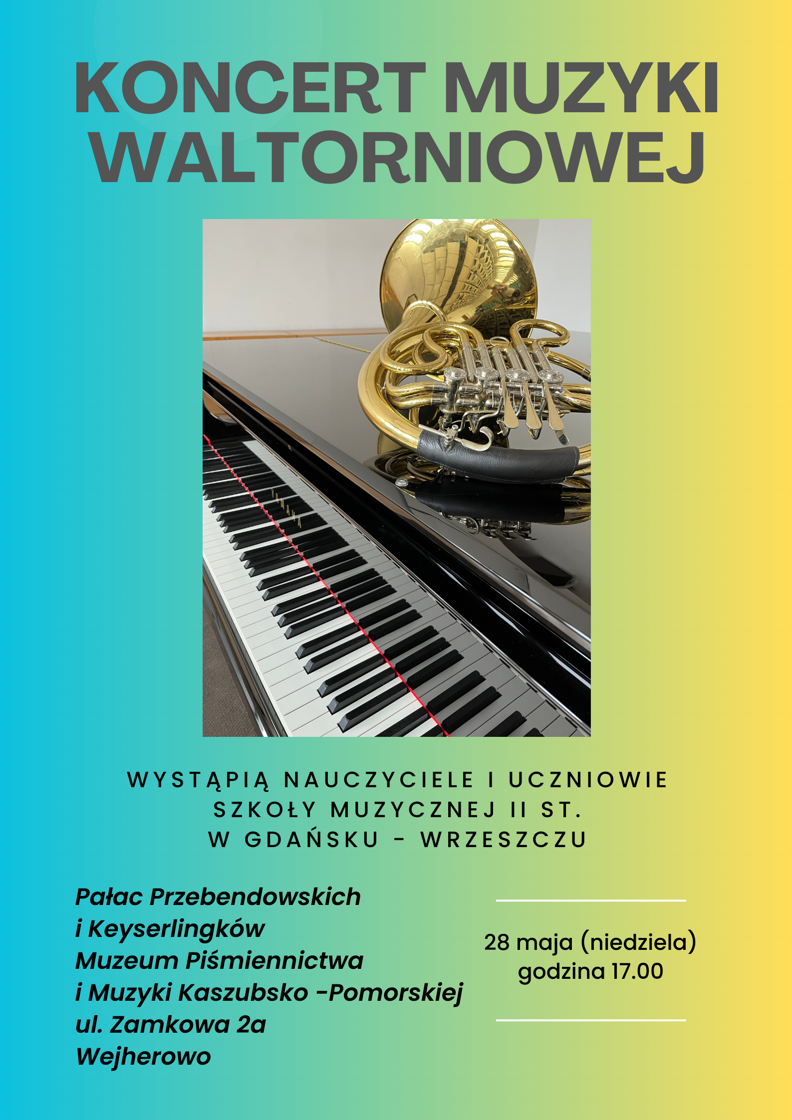 Uczniowie Szkoły Muzycznej II st. w Gdańsku - Wrzeszczu z klasy waltorni pana Piotra Kowalskiego wystapią 28 maja o godzinie 17.00 w Pałacu Przebendowskich i Keyserlingów, Muzeum Piśmiennictwa i Muzyki Kaszubsko-Pomorskiej w Wejherowie.